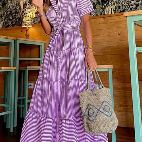 New Fashion Stripe Printed Short Sleeve Loose Waist Strap Long Collar Ankle Single Breasted Dress