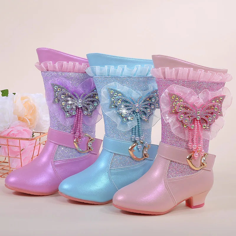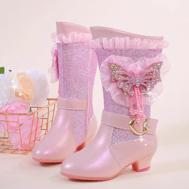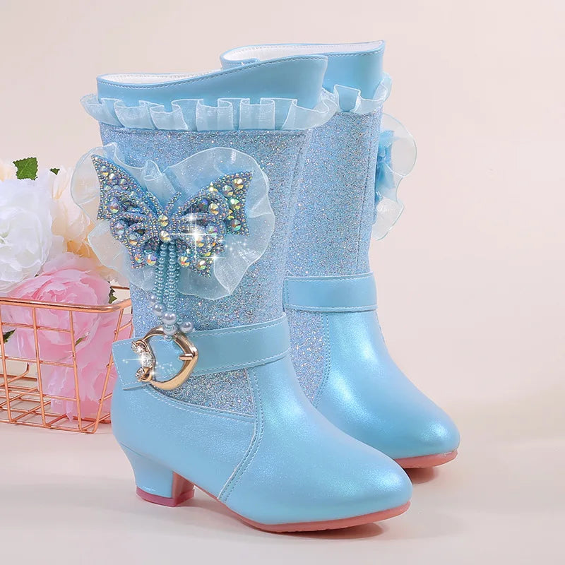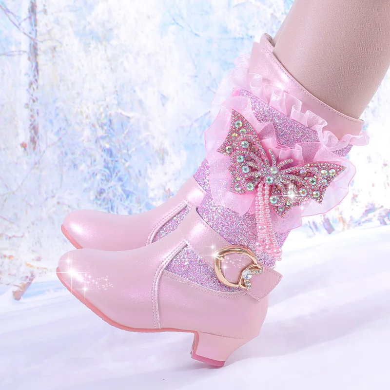 2025 Girls High Heel Boots Children's Sequins Rhindiamonds Butterfly-knot Princess Boots with Velvet Warm Mid-tube Kids Boots
