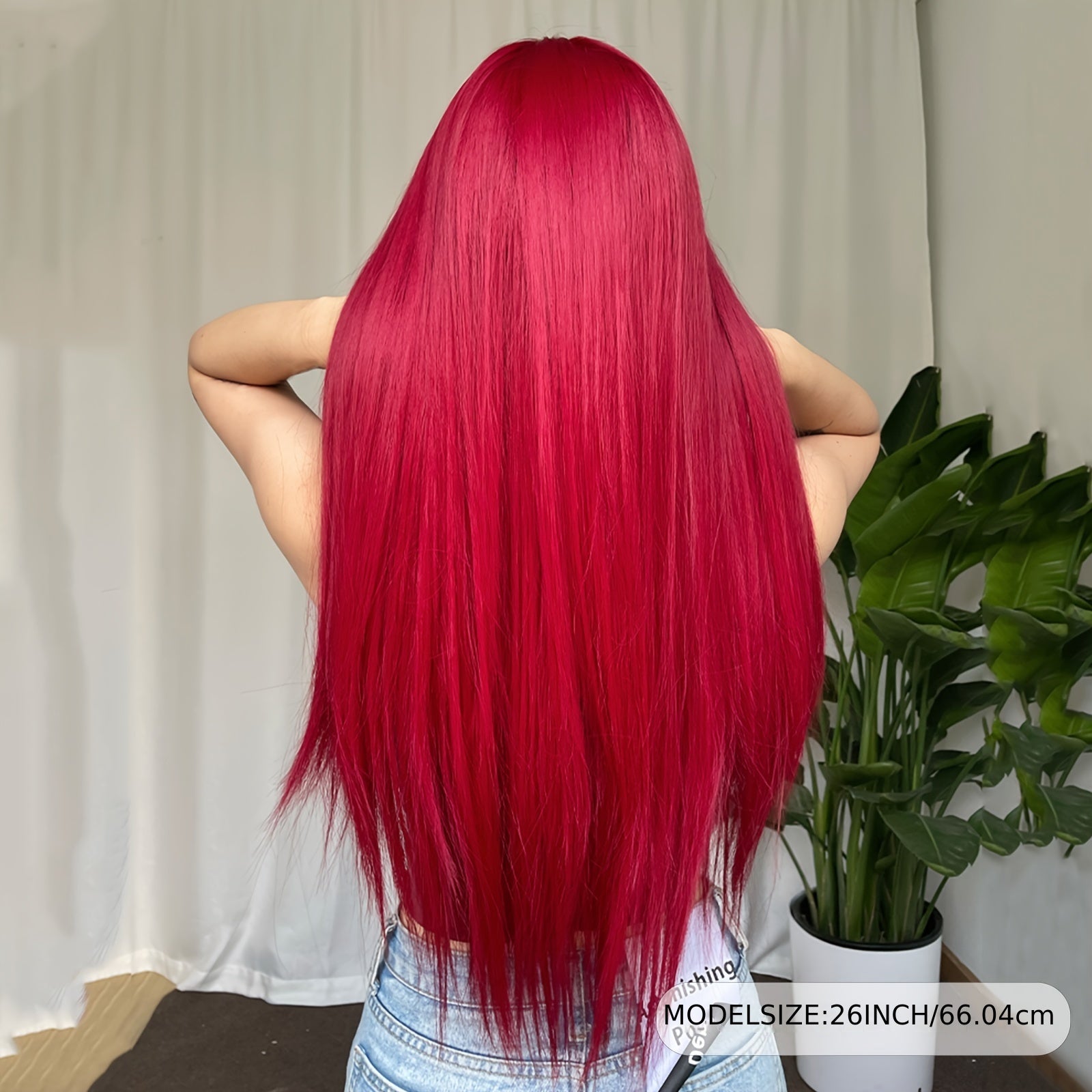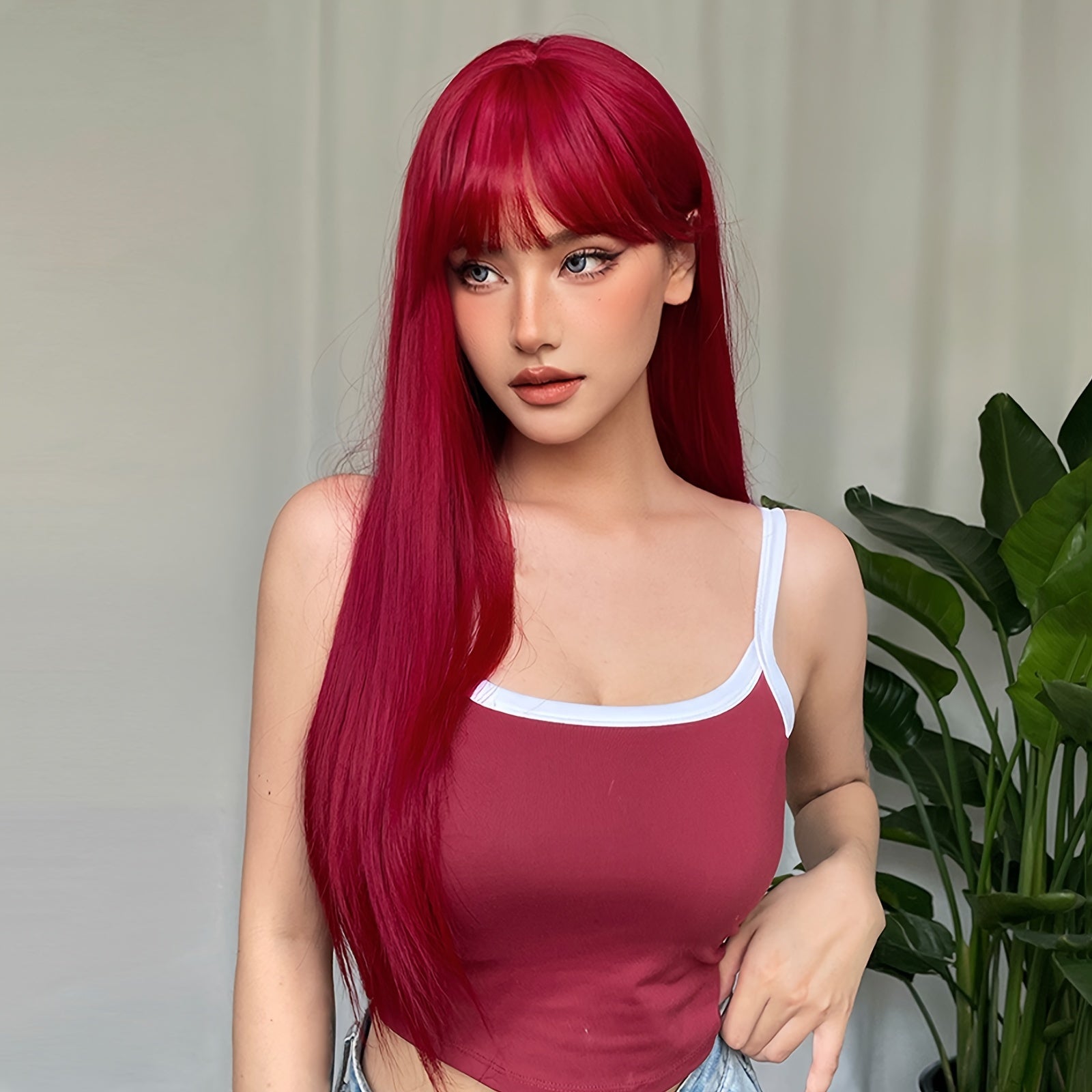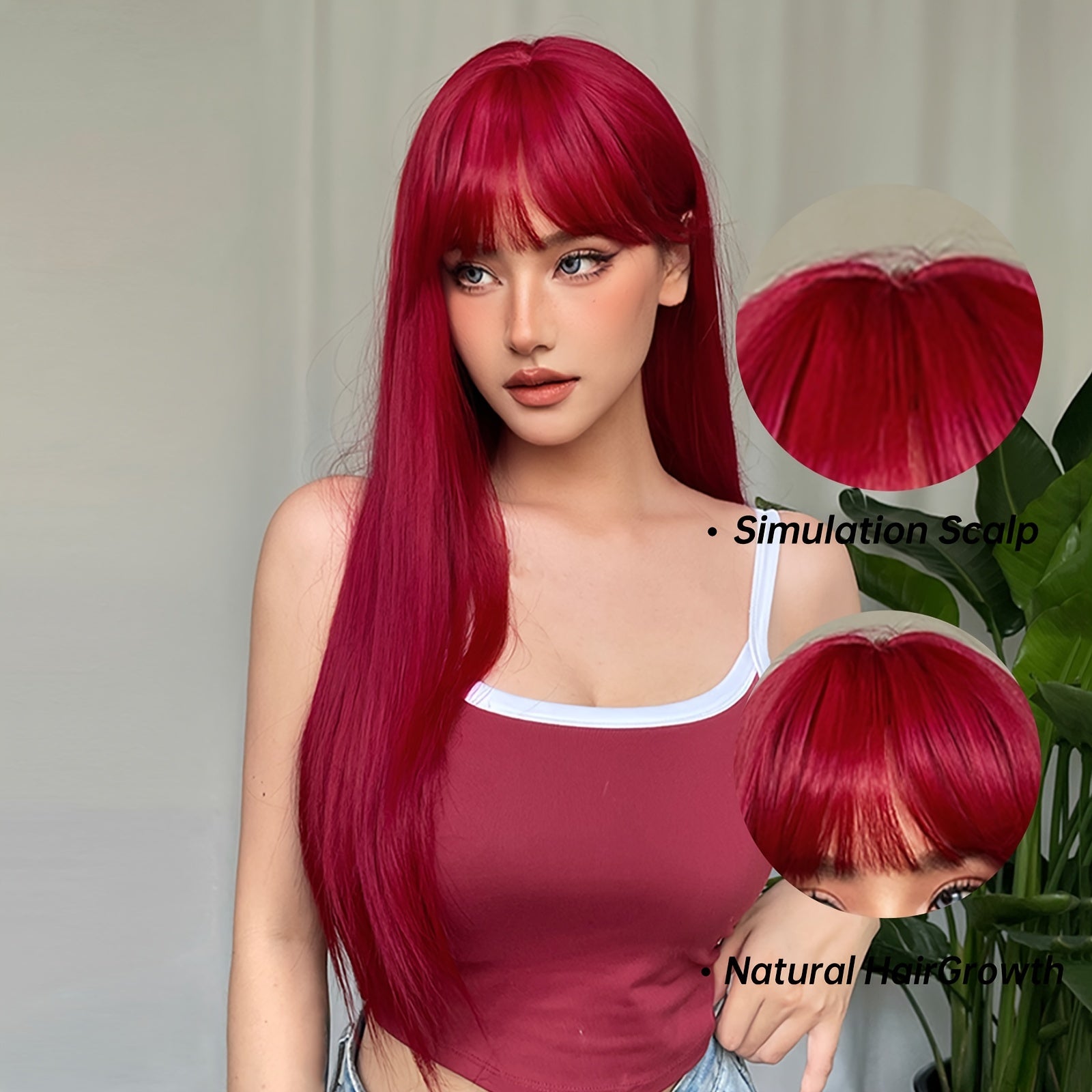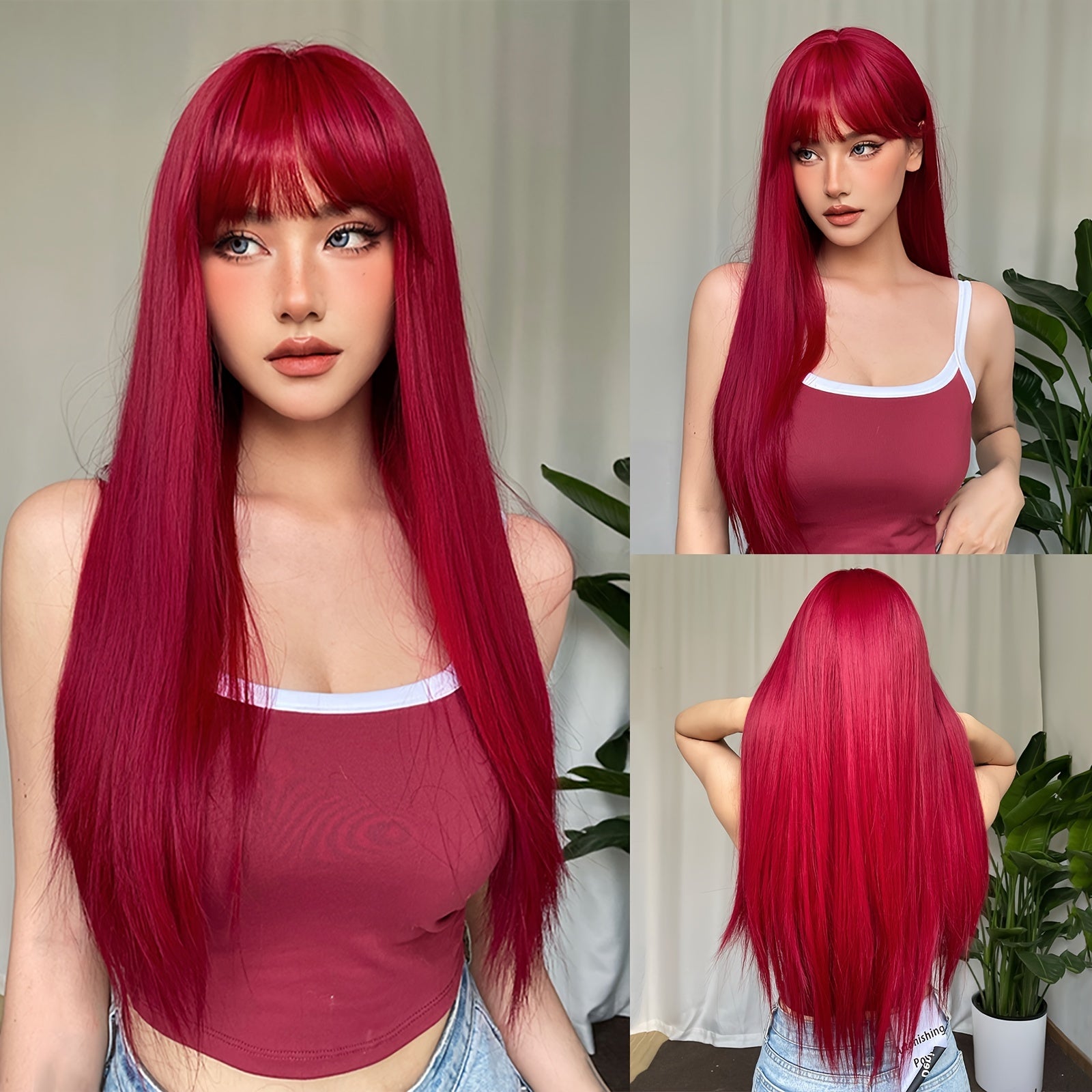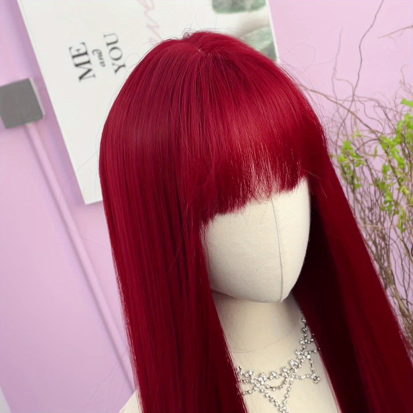26 Inch Elegant Red Wig with Bangs for Women, Straight Heat Resistant Synthetic Hair, High Temperature Fiber, Rose Net Cap, Fashionable Long Wig