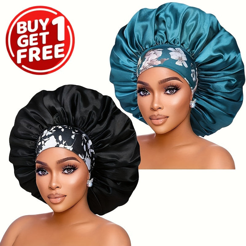 2pcs/set Oversized Satin Bonnet Flower Printed Band Imitation Silk Soft Sleeping Night Cap Elastic Lightweight Hair Bonnets For Women daily use