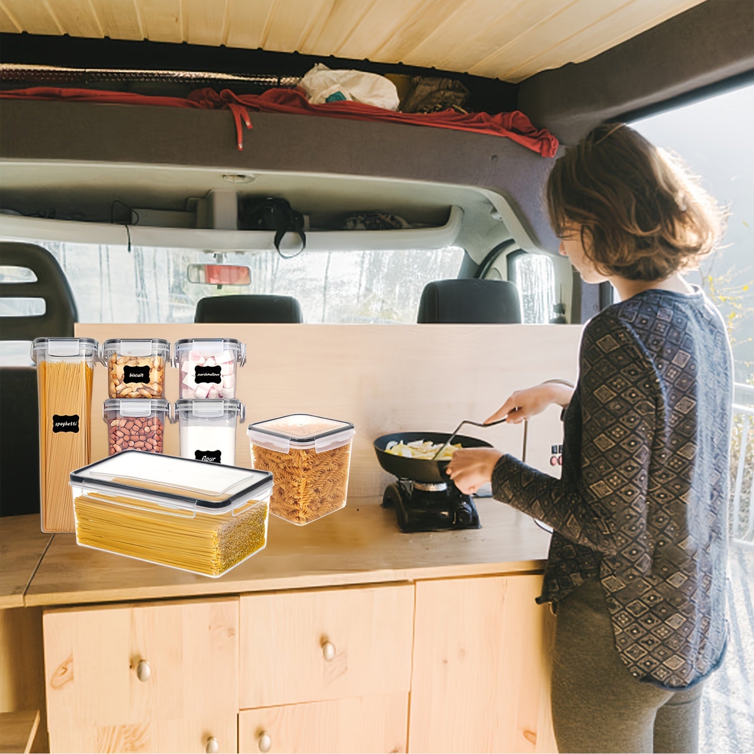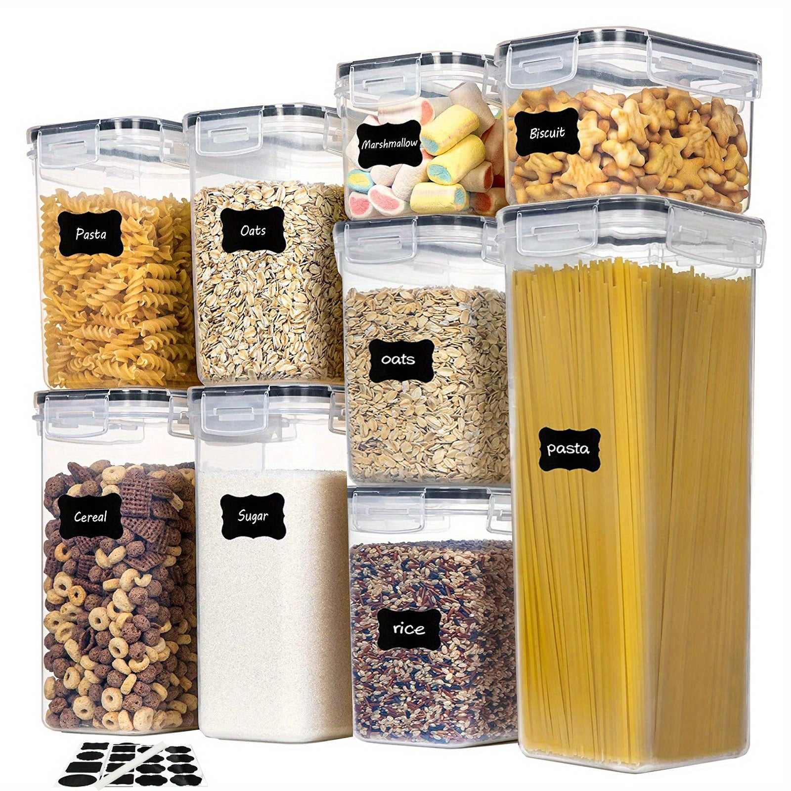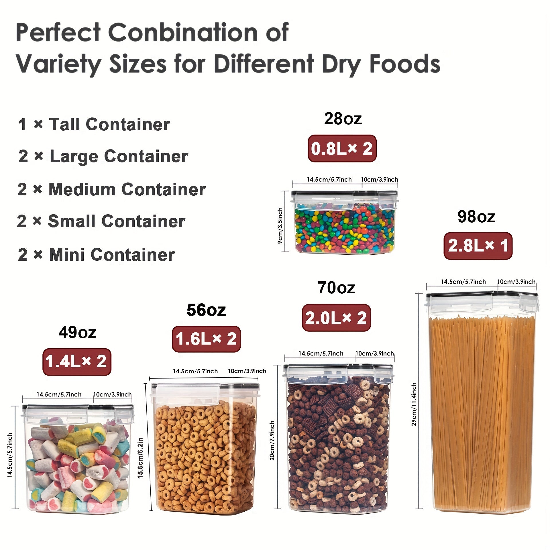 5 Size Combinations Fit Your Needs----Our kitchen storage containers set comes in 5 different sizes. Includes 1 Tall Container (2.5quart/2.8 liters), 2 Large Containers (1.8quart/2.0 liters), 2 Medium Containers (1.5quart/1.6 liters), 2 Small Containers(1.3quart/1.4 liters), 2 Mini Containers (0.7quart/0.8 liters). Perfect for storing spaghetti, baking supplies, cereal, flour, sugar, oats, pasta, rice, coffee, tea, snacks, nuts and other dry goods.