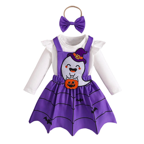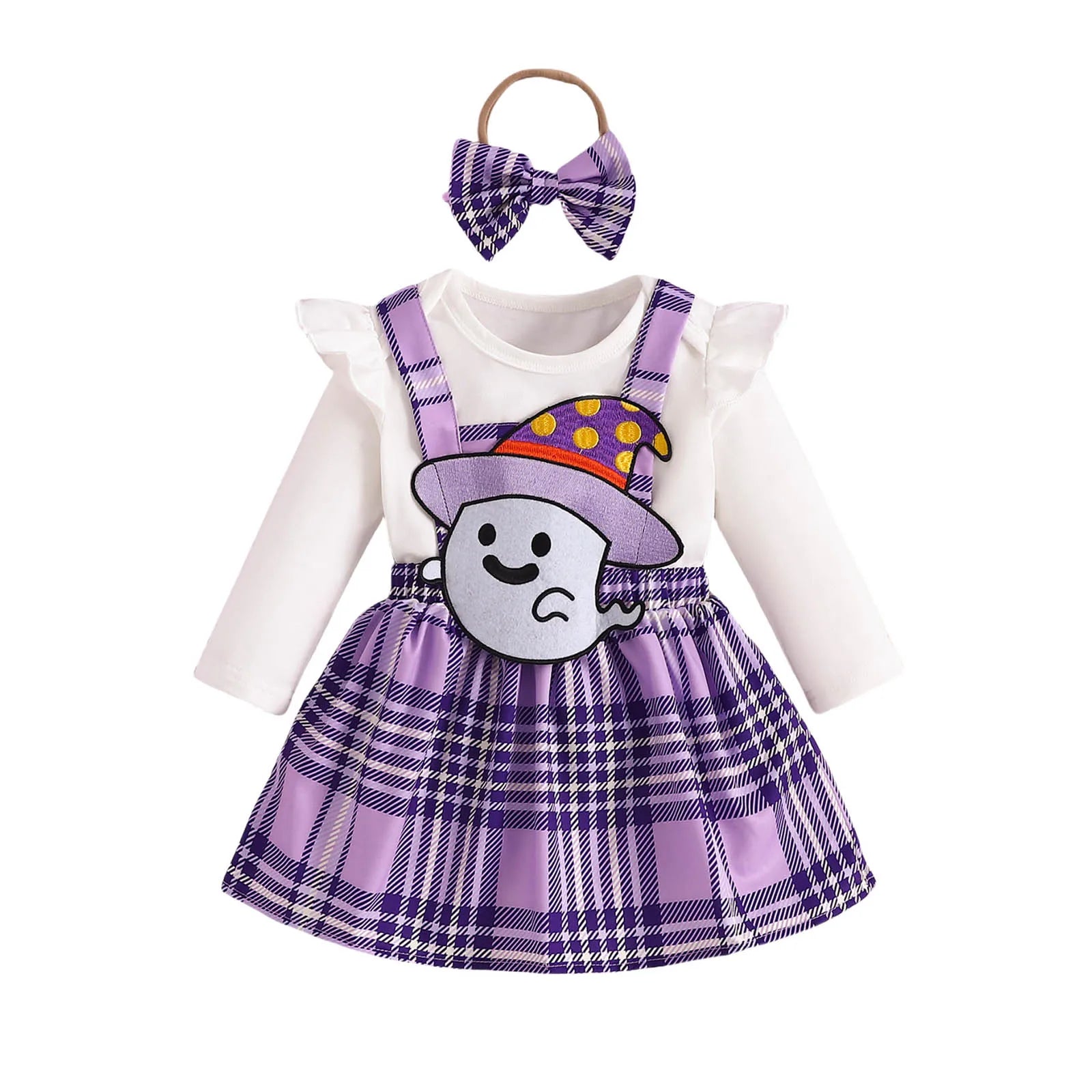 Baby Girls Halloween Clothing Set Cute Ghost Pumpkin Face Applique Suspender Dress with Rompers Carnival Party Cosplay Costume