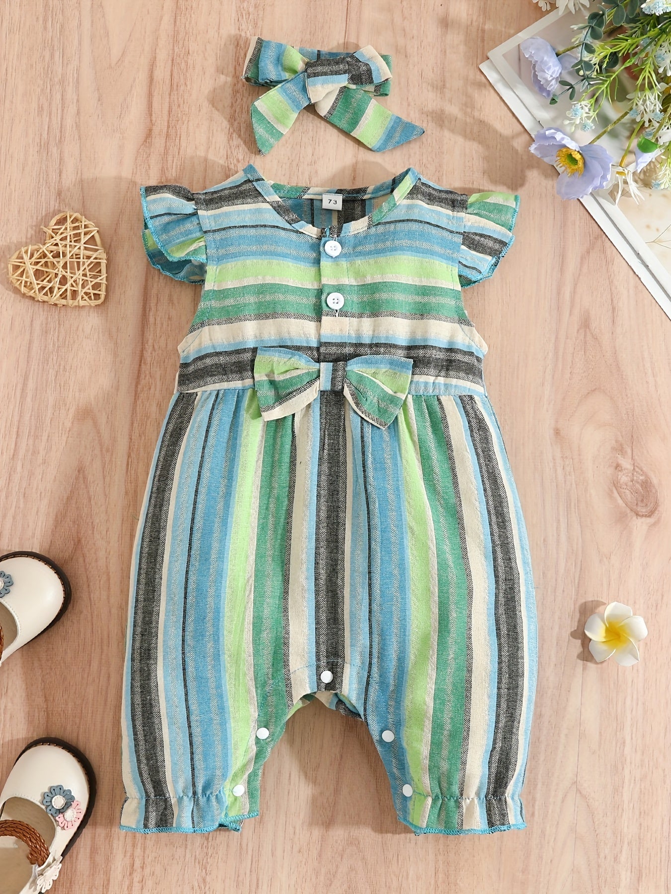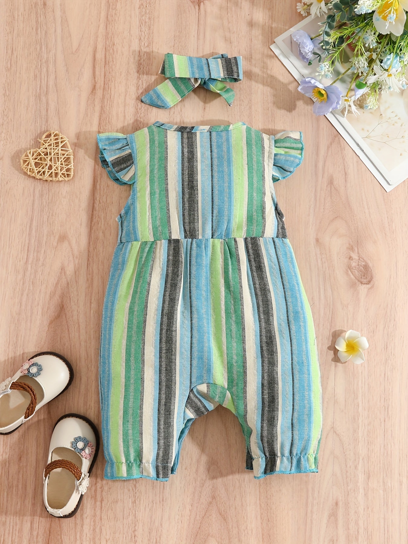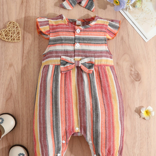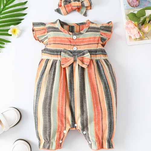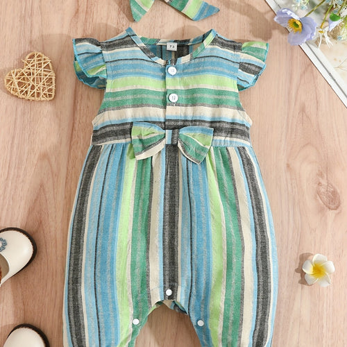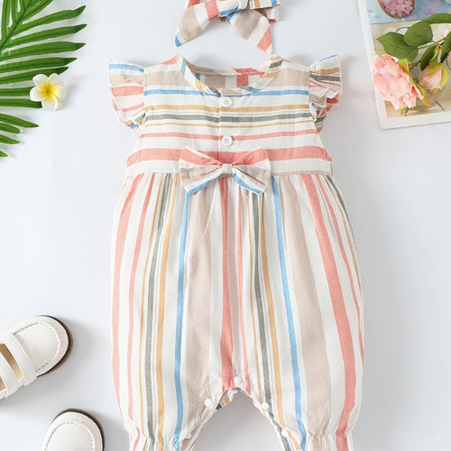 Baby Girls Striped Ruffled Romper Set with Bow Headband for Summer