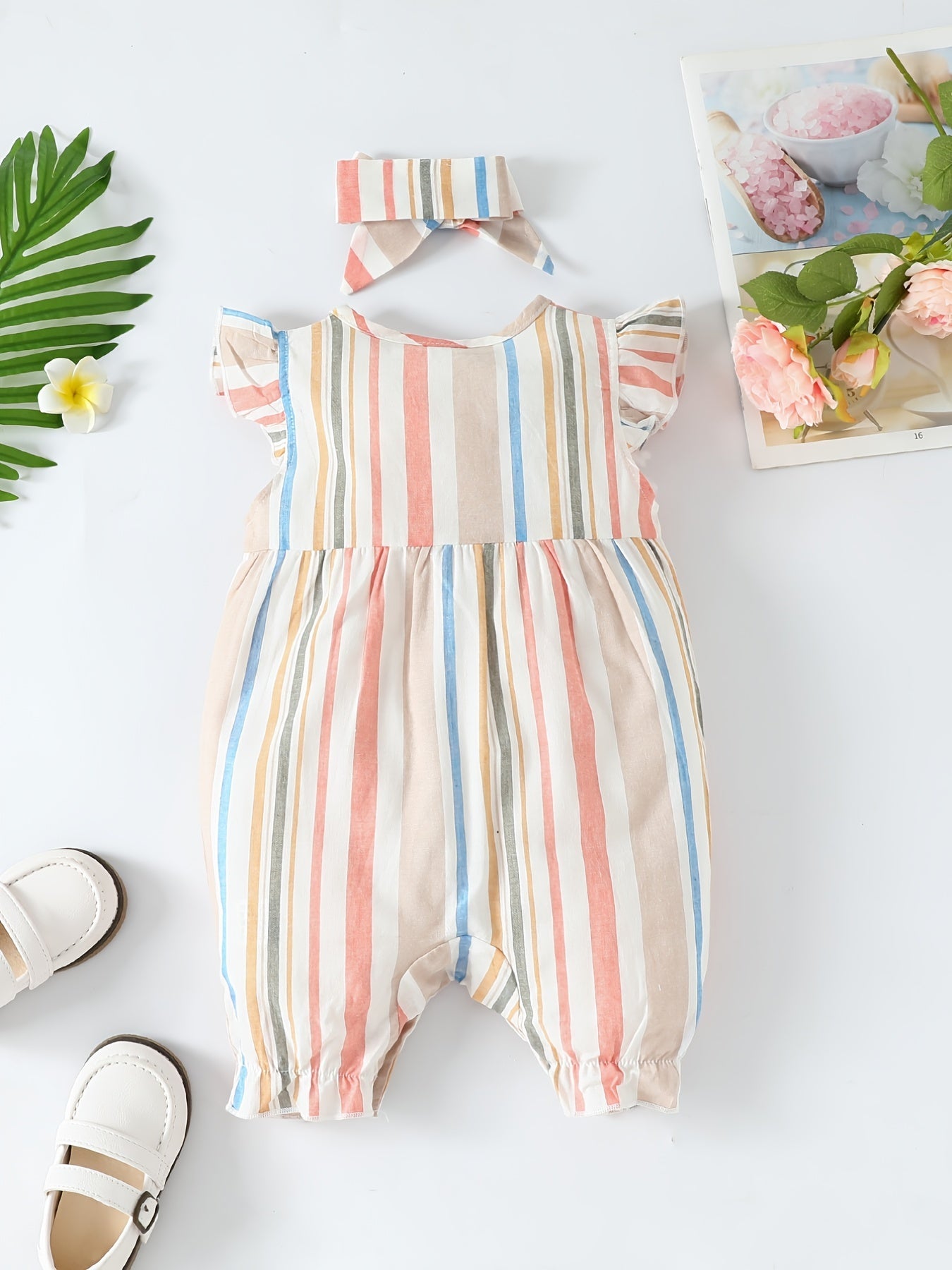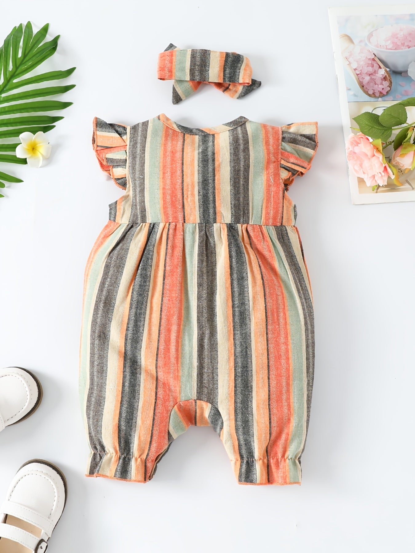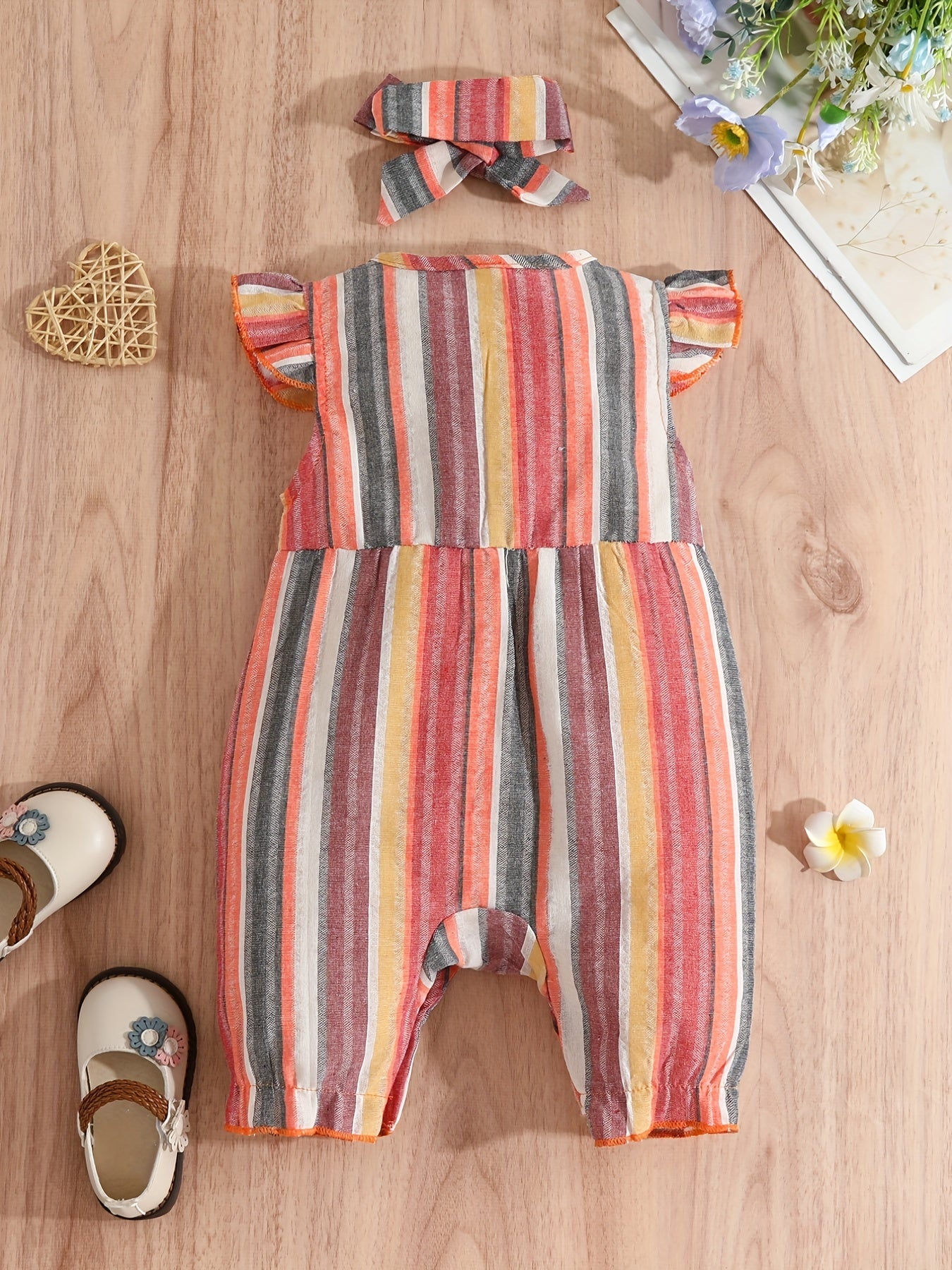Baby Girls Striped Ruffled Romper Set with Bow Headband for Summer