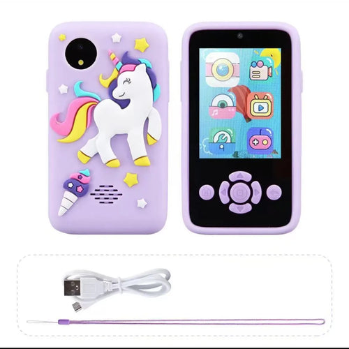 Kids Phone adopt the upgraded 2 camera configuration,The toy phones for kids have features front and rear cameras with 15 cute cartoon frames and 6 filter modes,It can make kids more enjoy the process of taking pictures.kids can switch between their favorite cartoon frames/filter modes.The Kids Phone also Include the portable lanyard is so easy to carry and move.Kids Phone also includes a video recorder, take photos,MP3 player,creative game,ect.