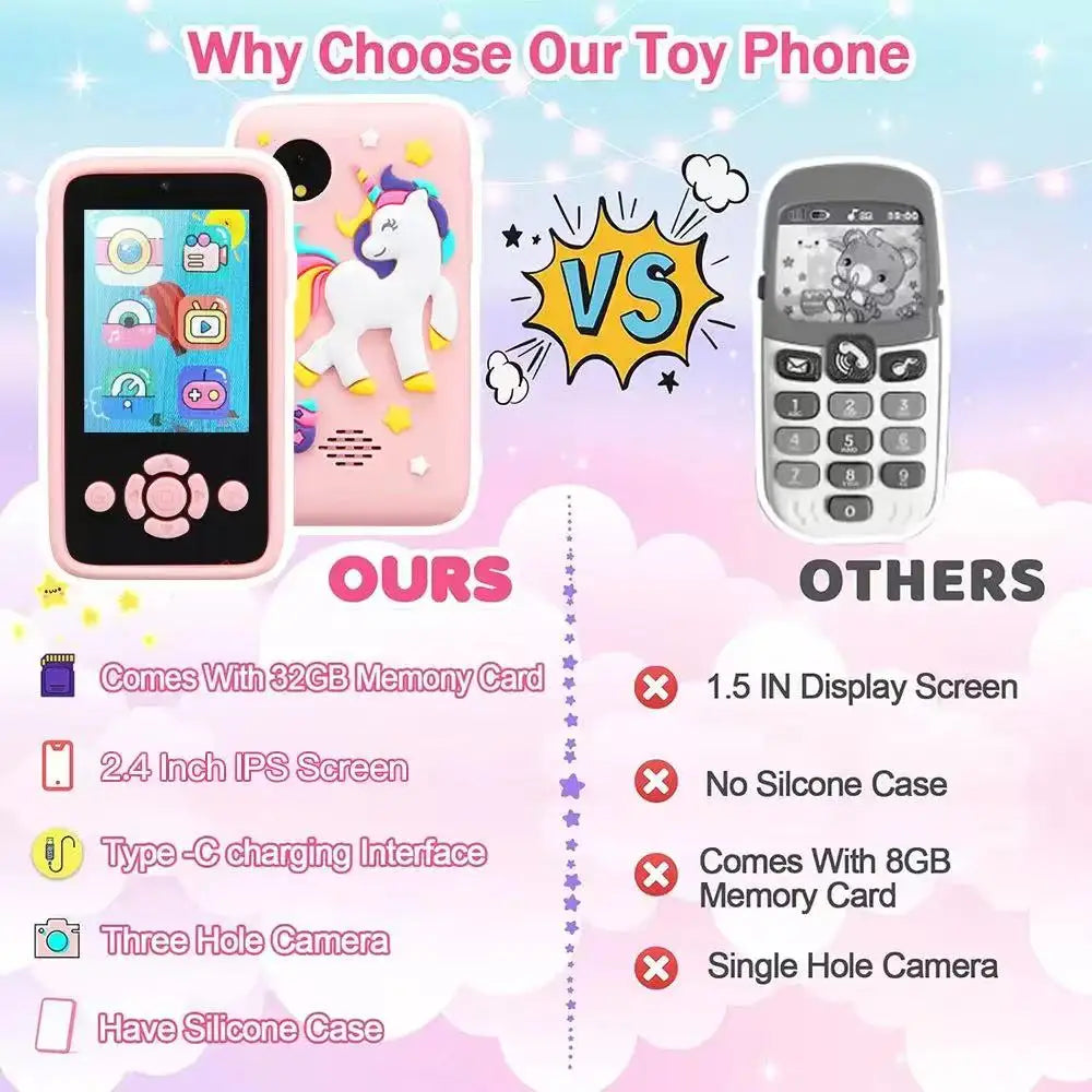 Our phones for kids is equipped with a 2.4-inch color display screen and 2023 newest upgraded functions just like an actual phone.1080P Video,It can greatly improved the definition of the photos.Boys and girls can take pictures and videos, listen to music,many games for you to play!The kids phone has a high-quality speaker,It is good for children to learn and listen to music.Come on leave some funny or happiness photos with family or friends.
