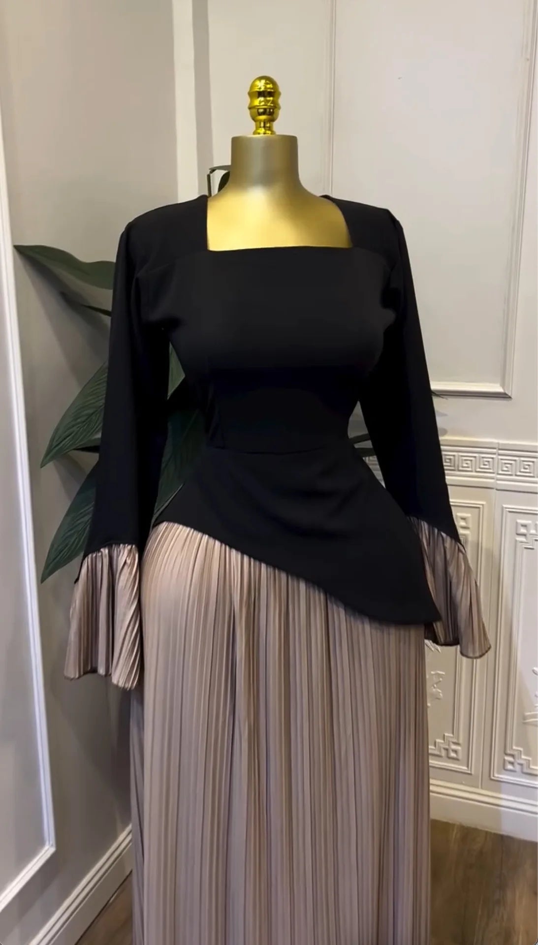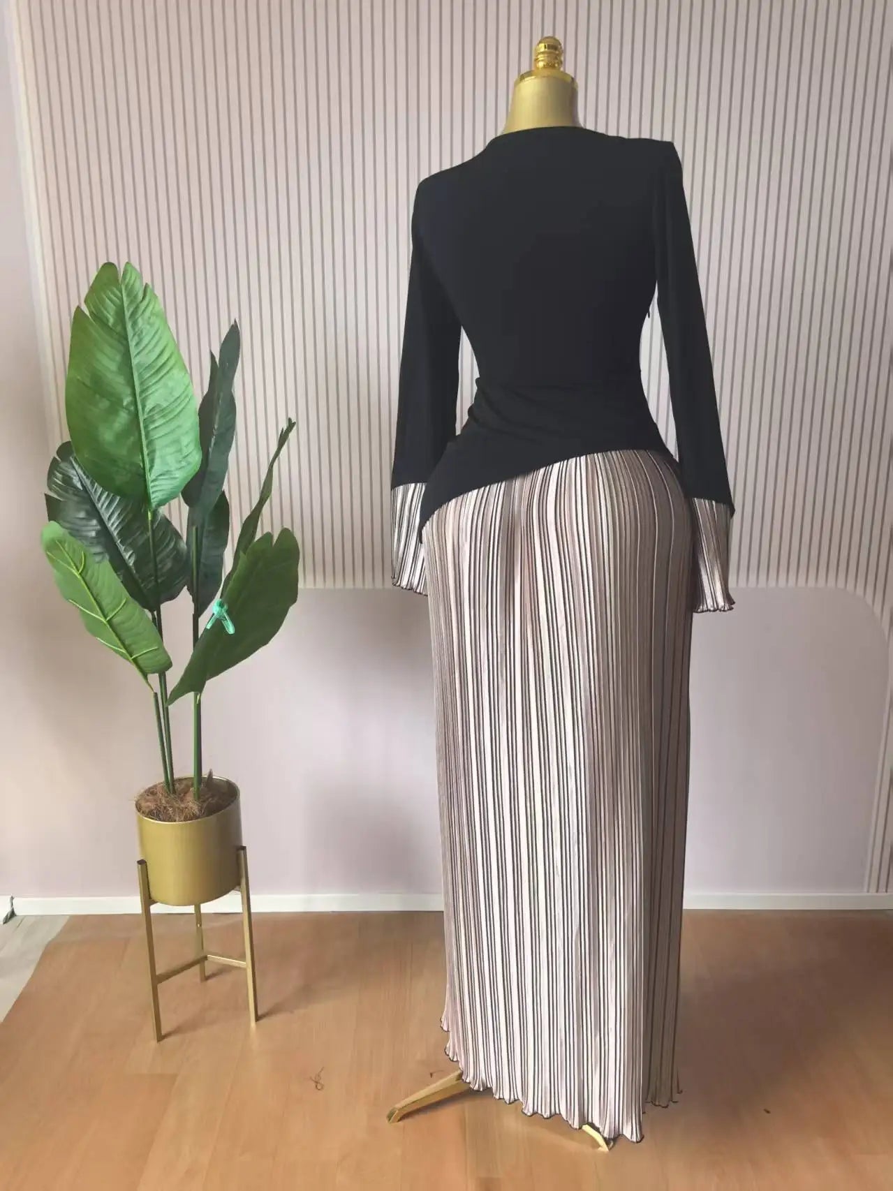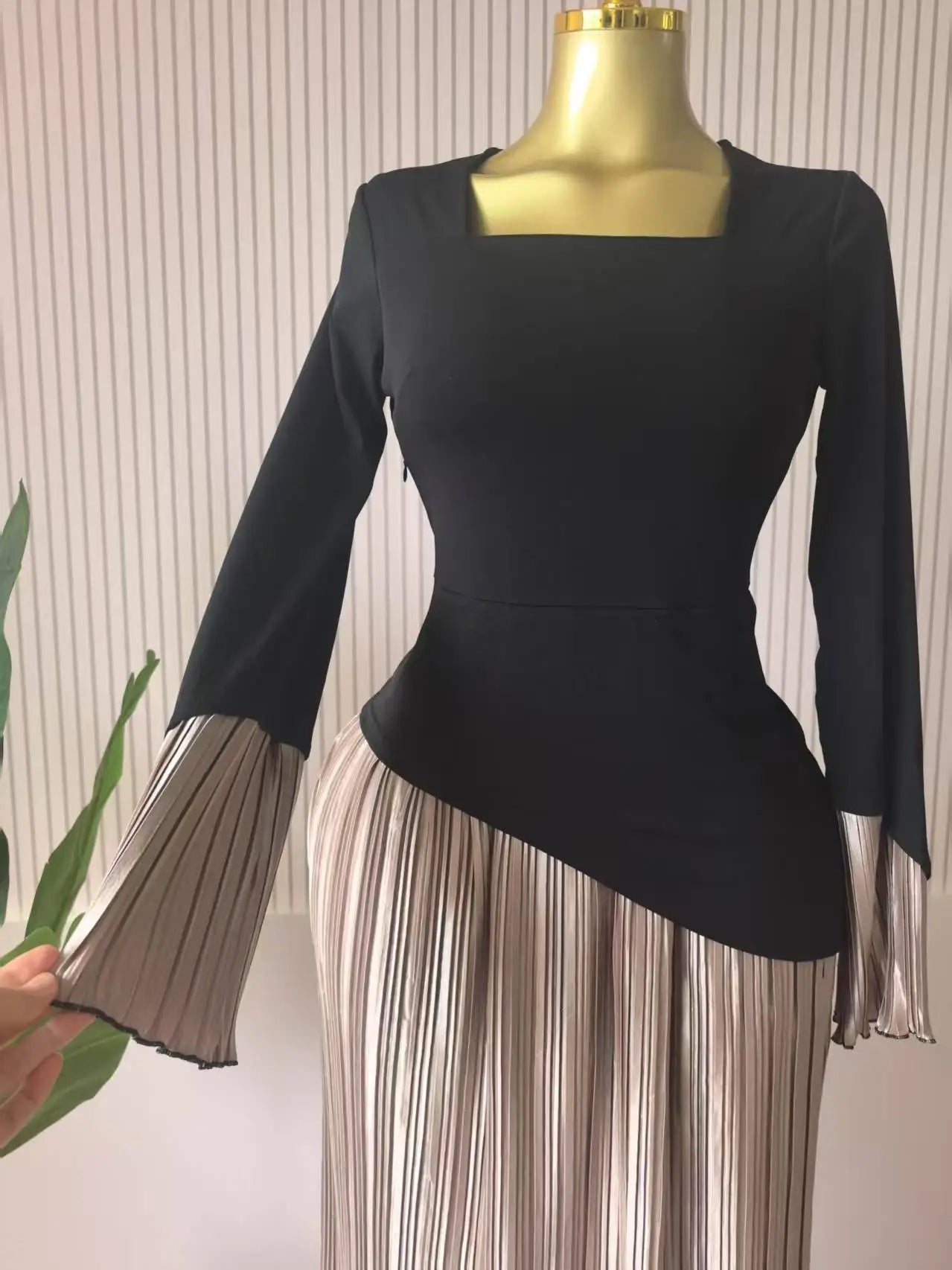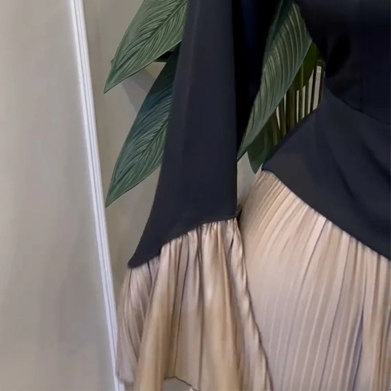 Women Patchwork Flare Long Sleeve U-collar Pleated Big Swing Maxi Long Dress perfect for special occasions.