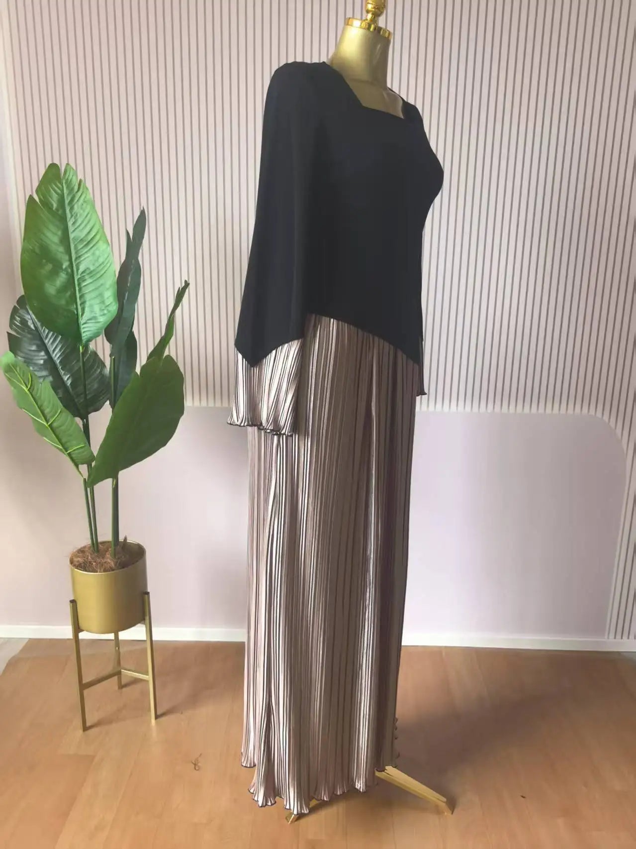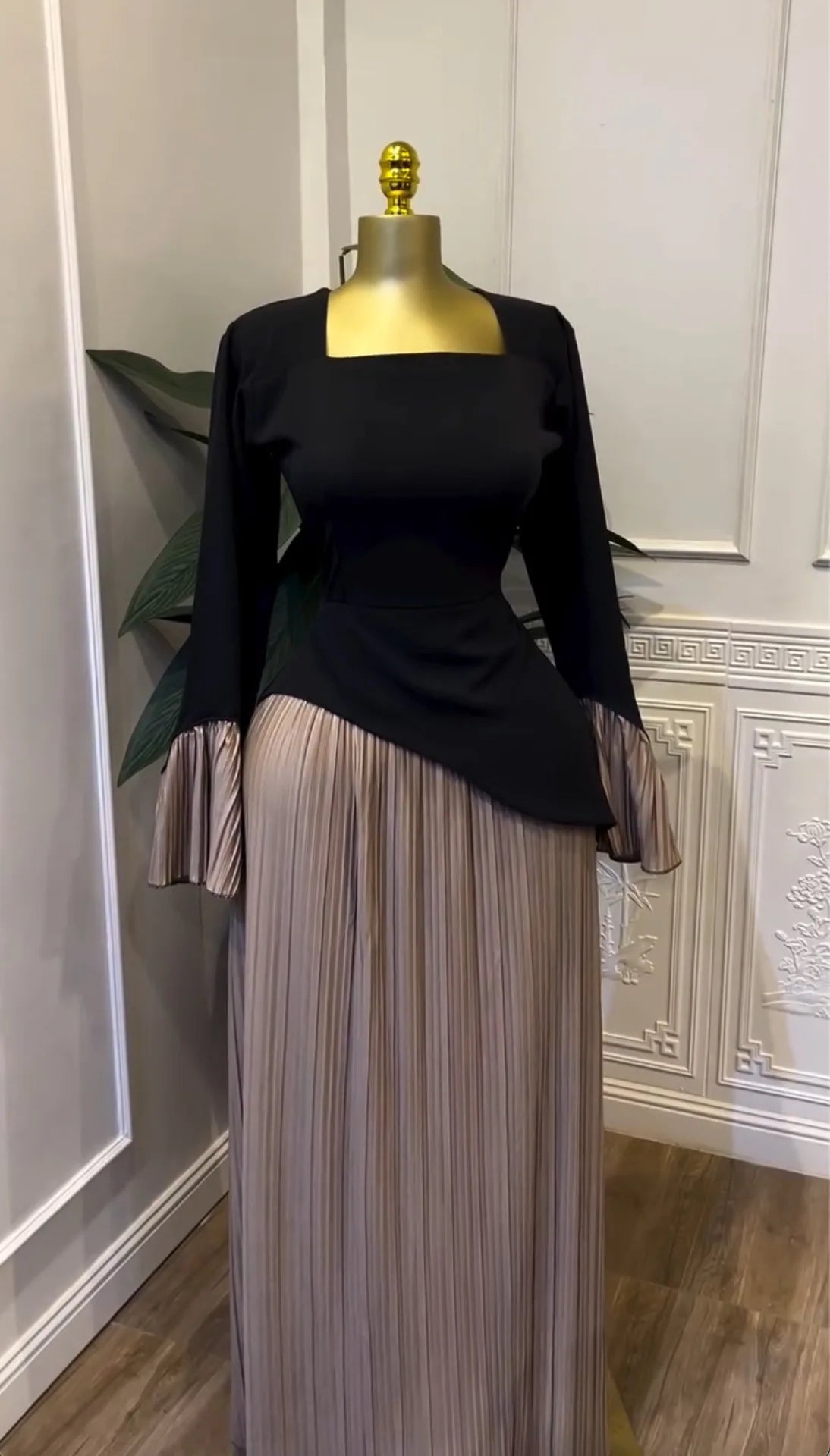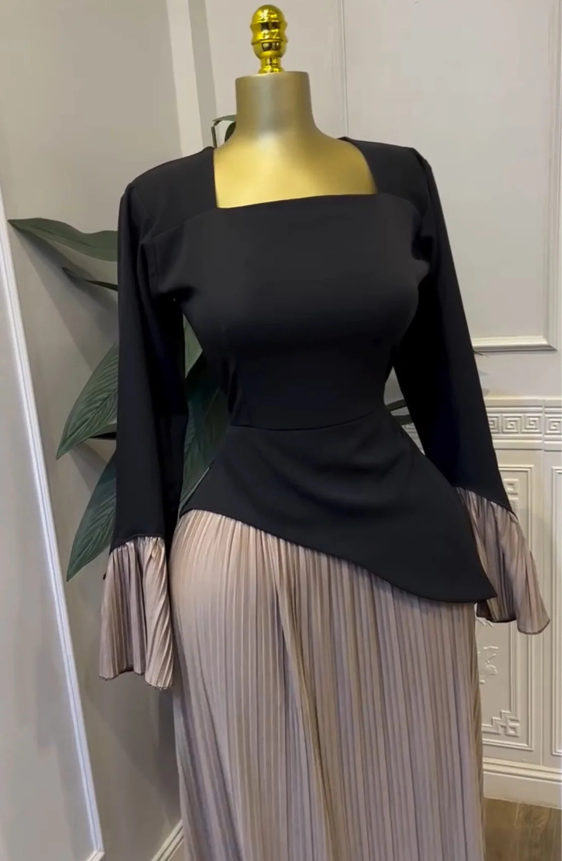 Women Patchwork Flare Long Sleeve U-collar Pleated Big Swing Maxi Long Dress perfect for special occasions.