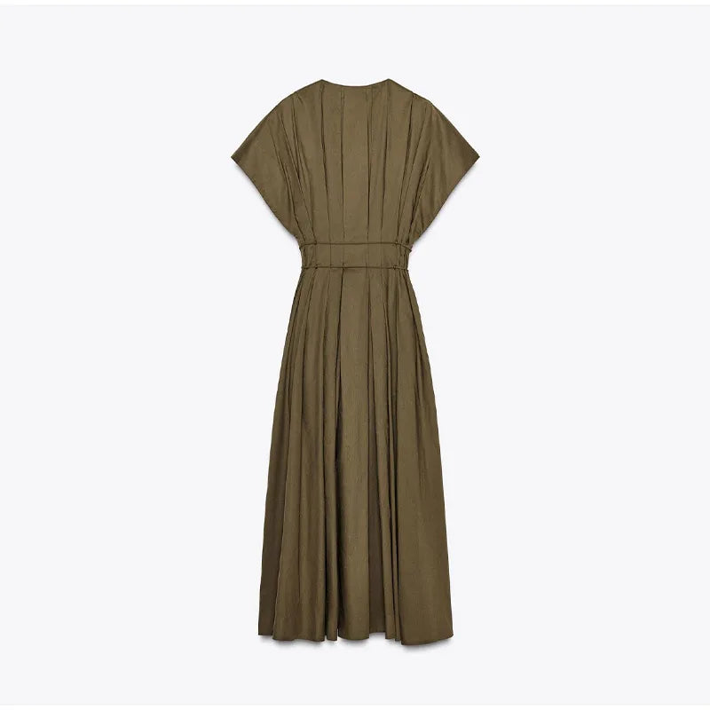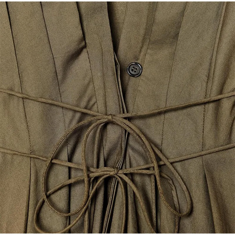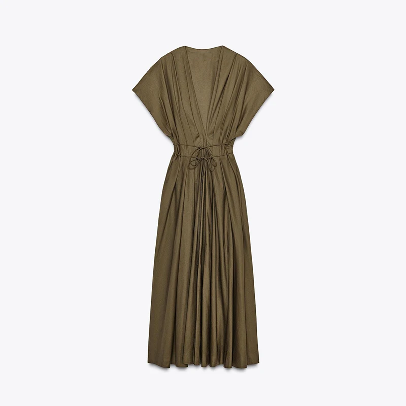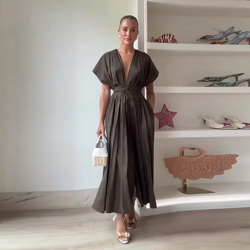 Elegant Pleated Lace Up Long Dress Deep V-neck Flying Sleeve A-line Party Dress Office All-match Chic Robes
