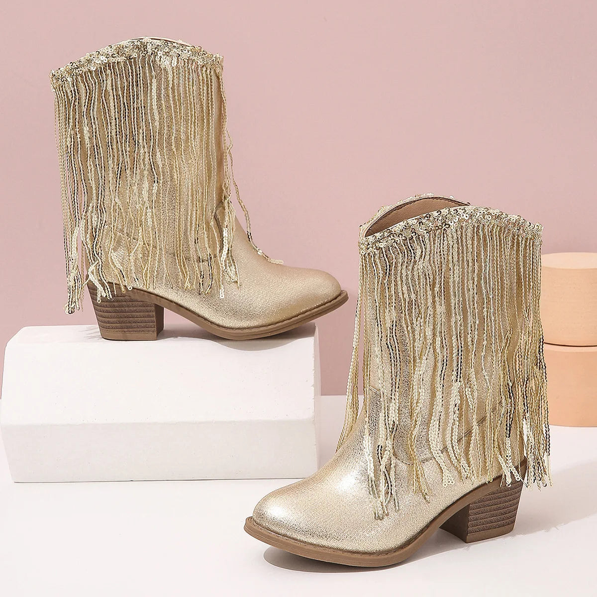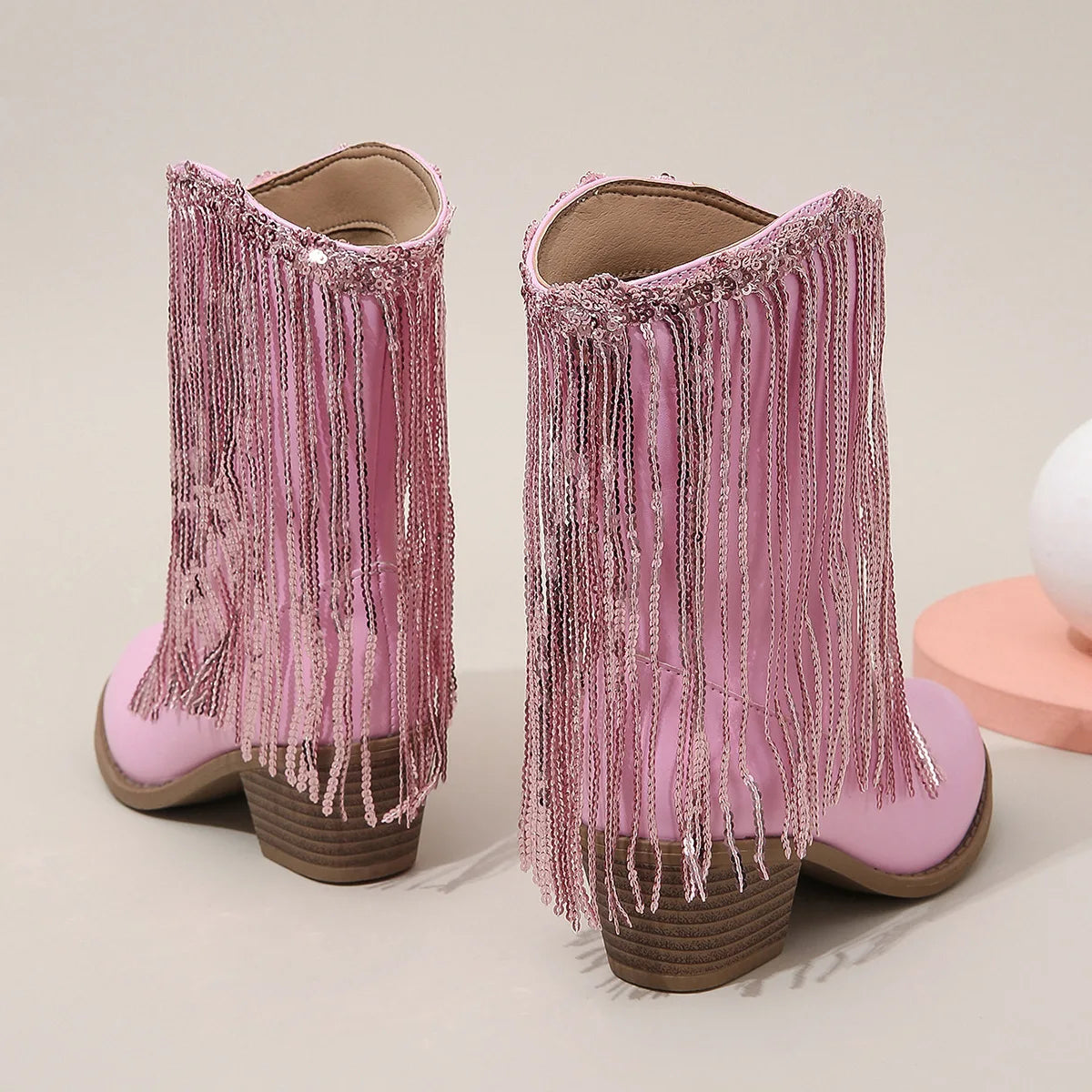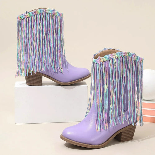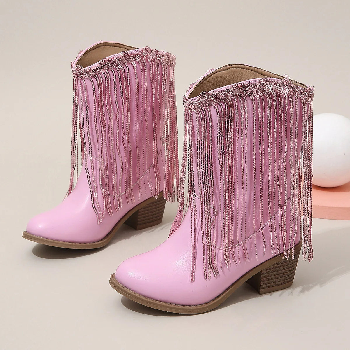 Girls Boots Autumn Winter Toddler Kids Princess Fashion Middle Calf Cowboys Boot Children High Heel Tassel Dance Soft Sole Shoes