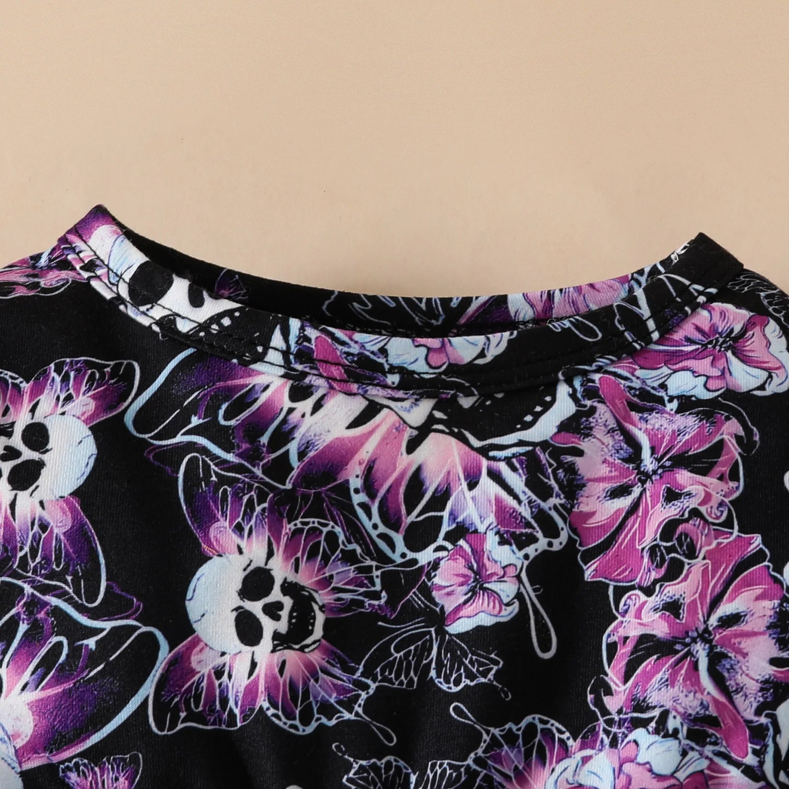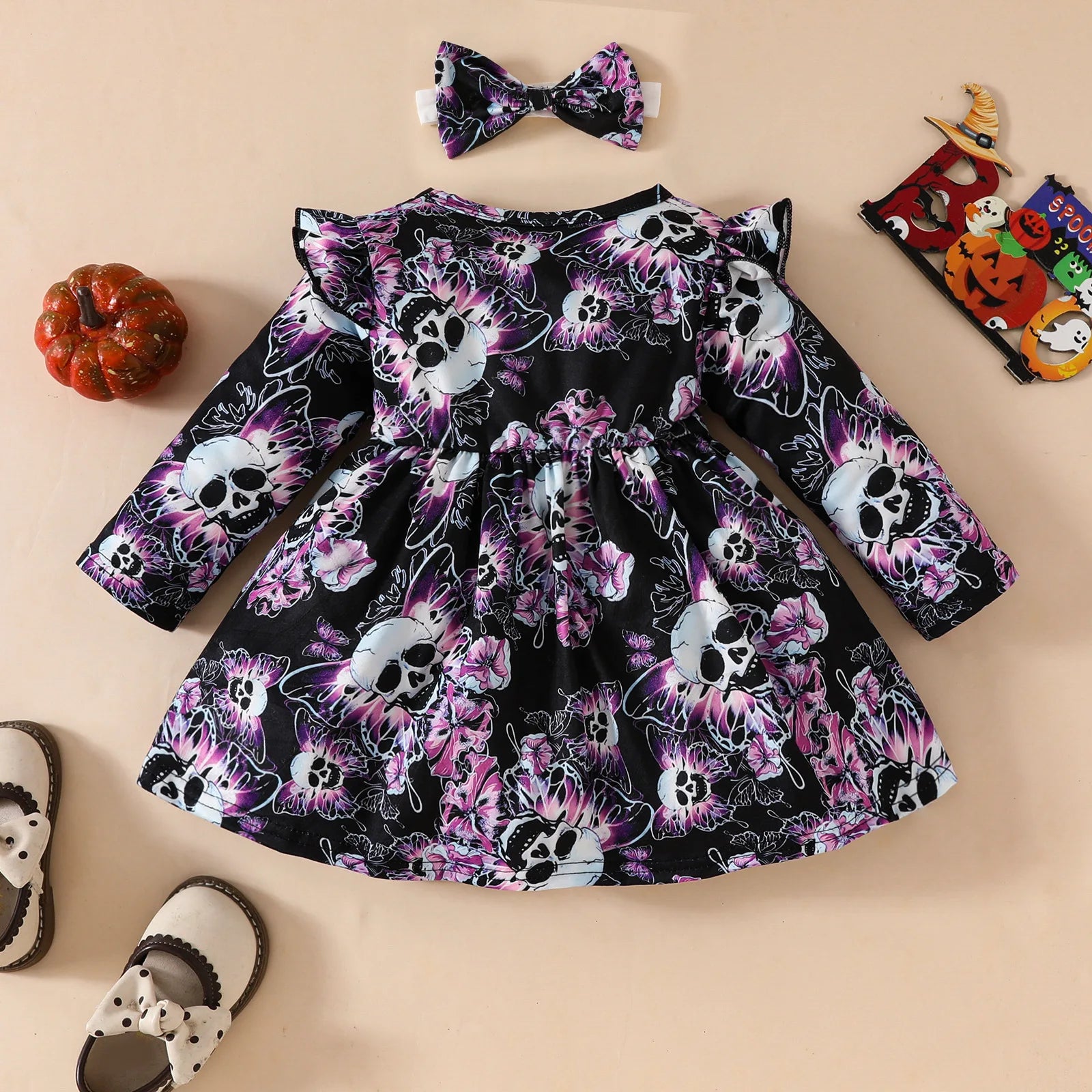 Halloween Children Costume Cute Girl Dress Long Sleeve Butterfly Skeleton Print Party Dress Gothic Outfit Baby Girls Clothes