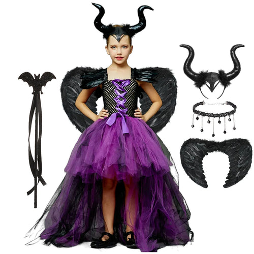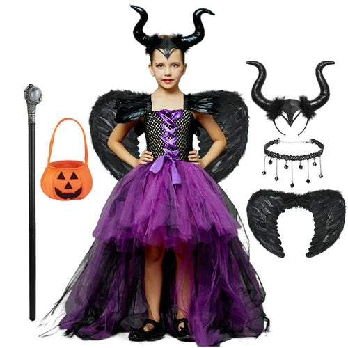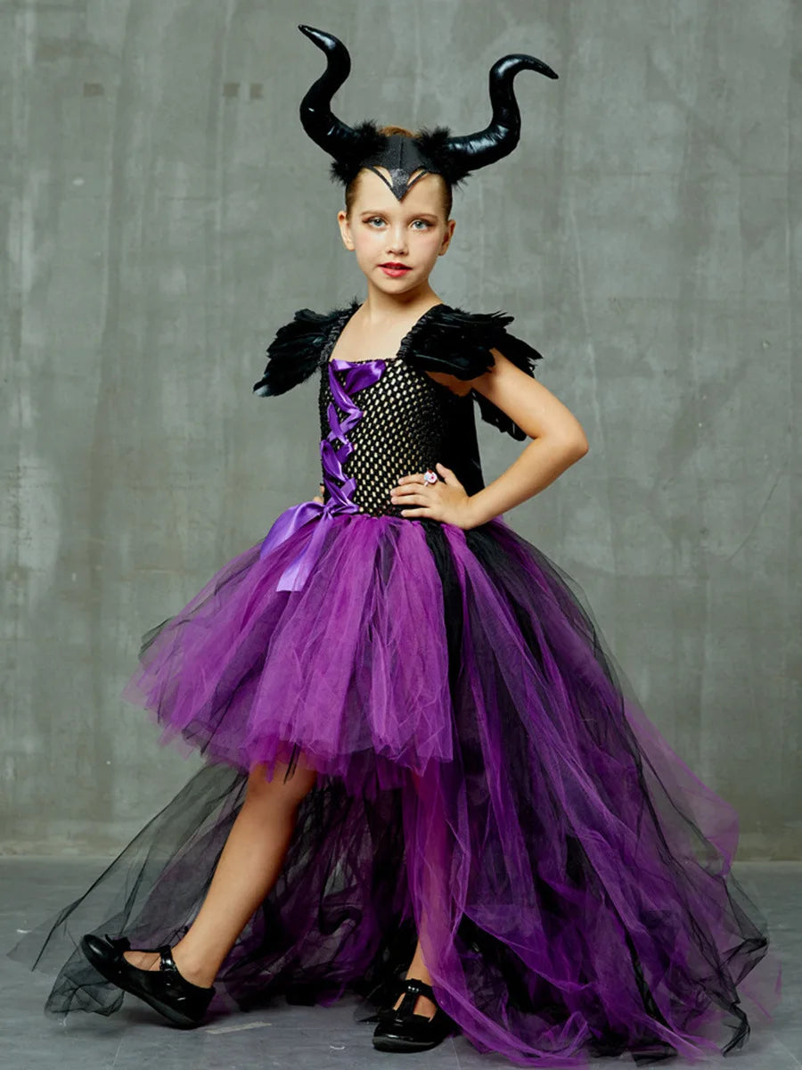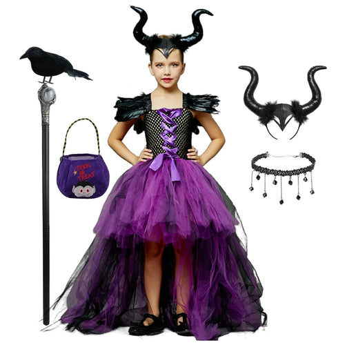 Halloween Children Costume Tulle Dress Girls Cosplay Vestidos Party Evil Queen Mesh Princess Dress Kids Crow Wand