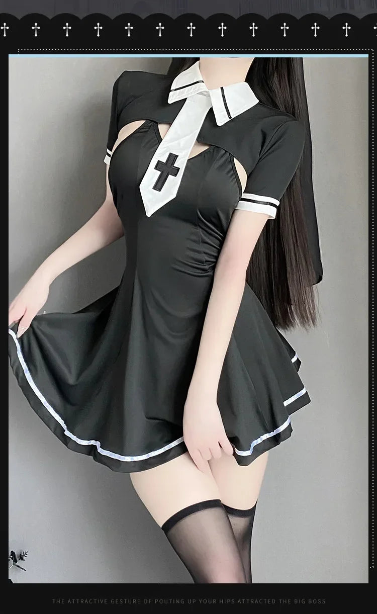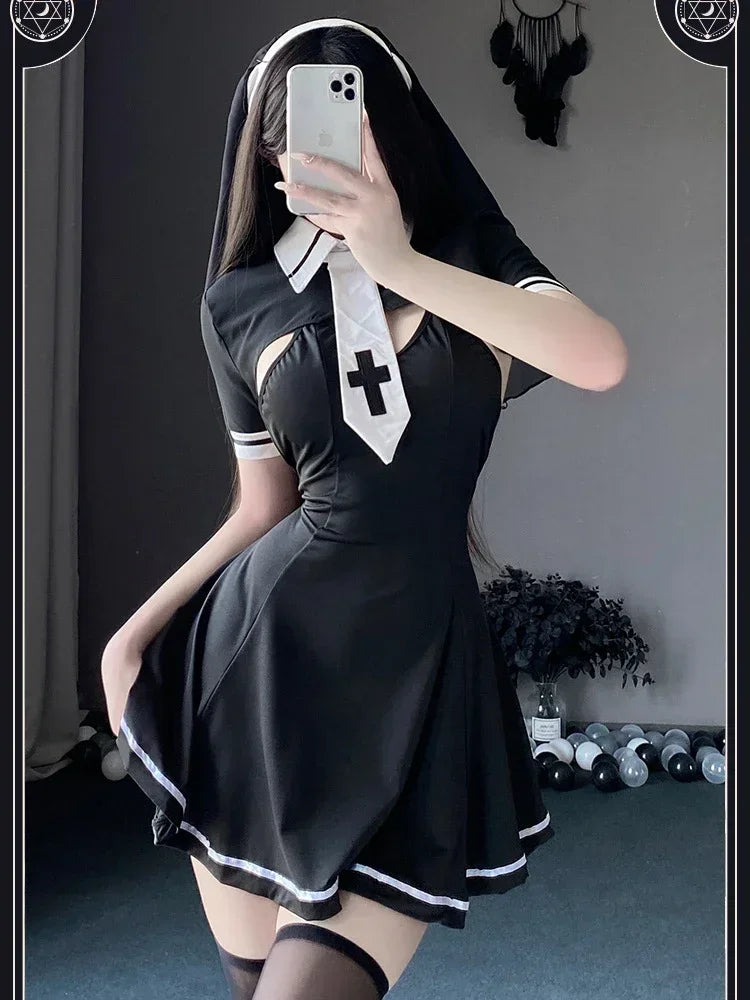 Holy but Naughty! A daring twist on the classic nun look, perfect for Halloween, cosplay, or themed parties. Playful, bold, and unforgettable. ✝️ Includes: Nun dress + accessories 🎃 Occasions: Halloween, cosplay, carnival 🖤 Sexy nun, gothic roleplay