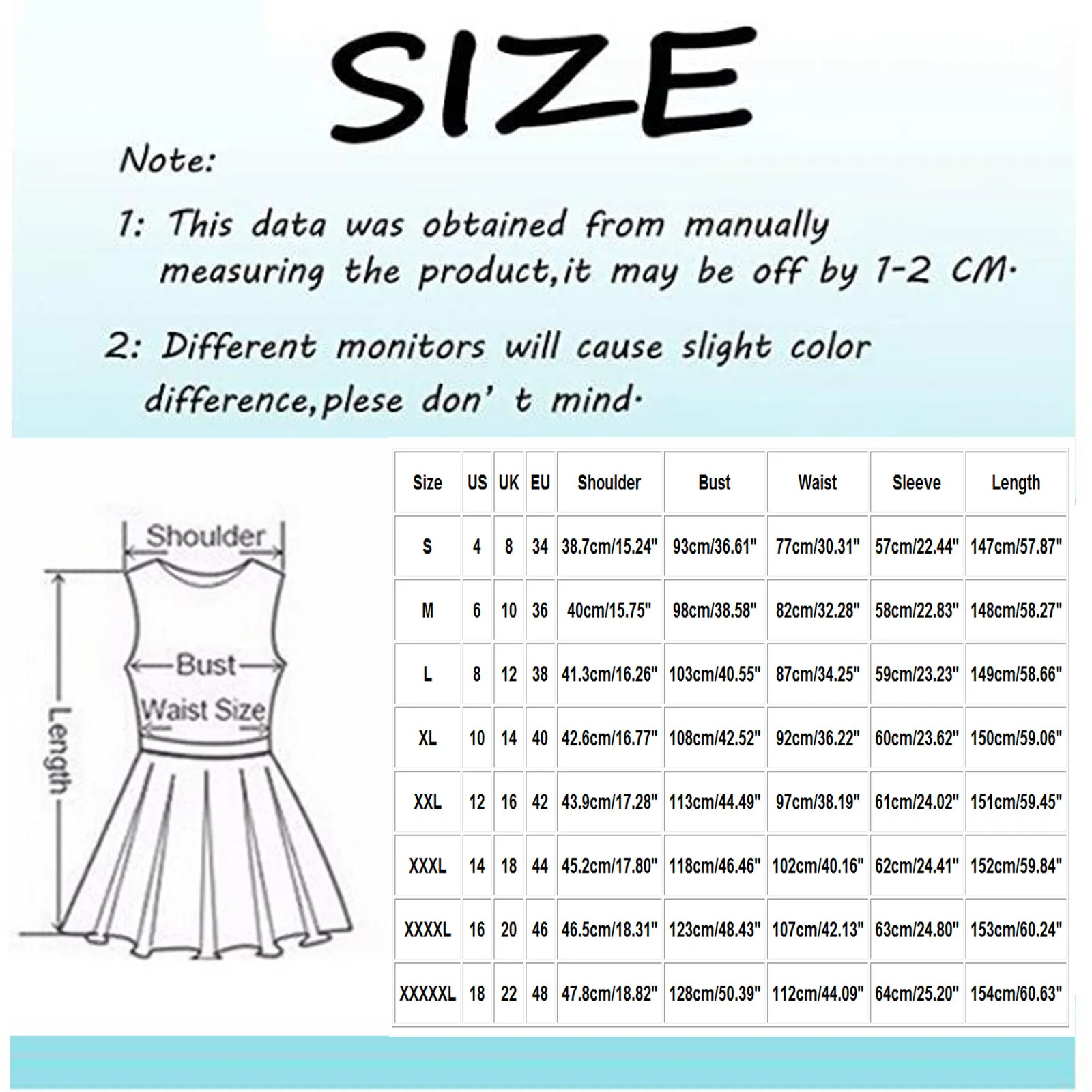 Please allow 1-3cm differs due to manual measurement, thanks (All measurement in cm and please note 1cm=0.39inch)