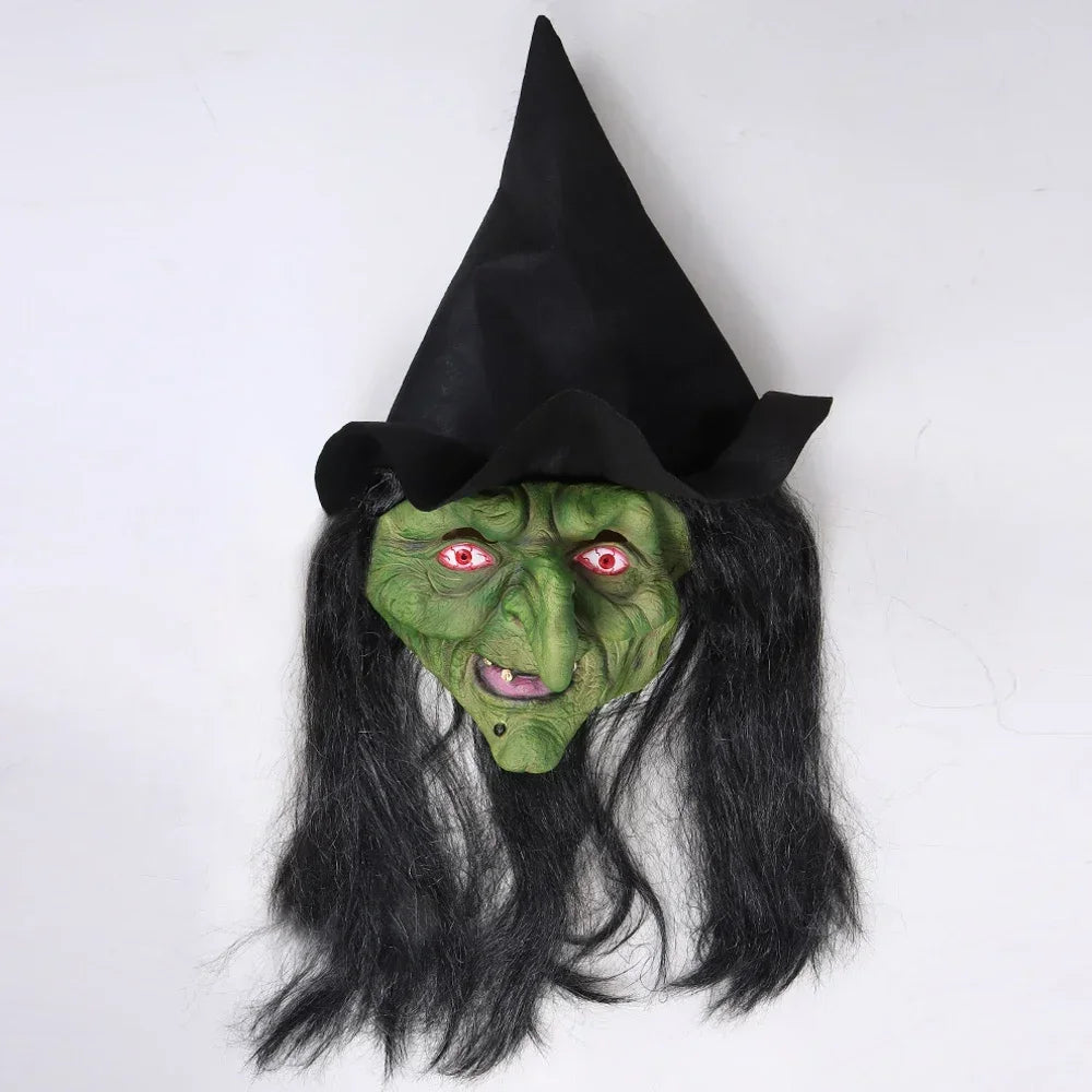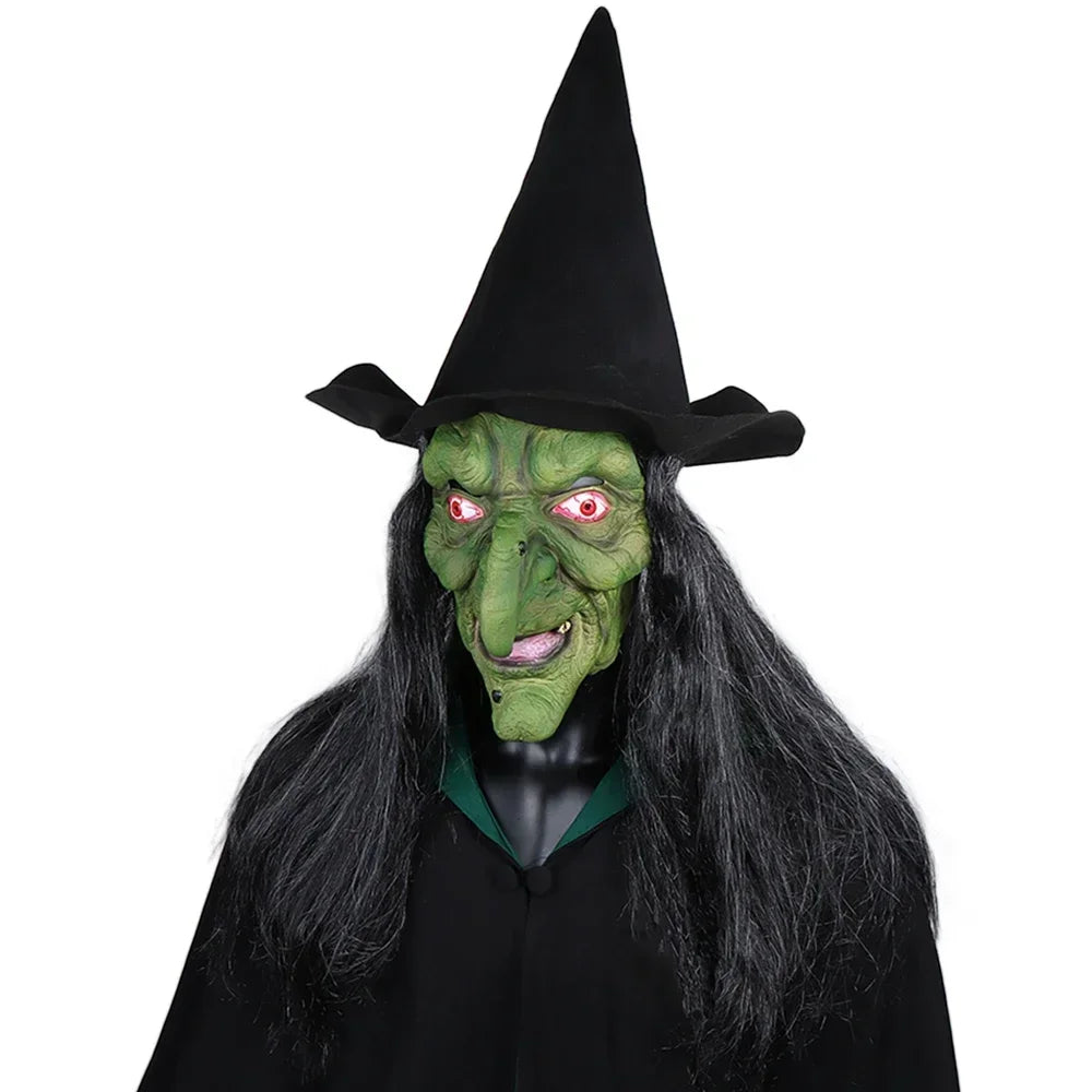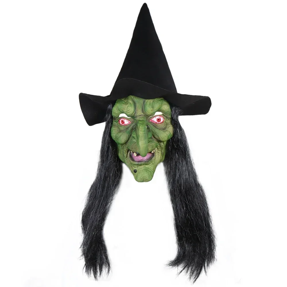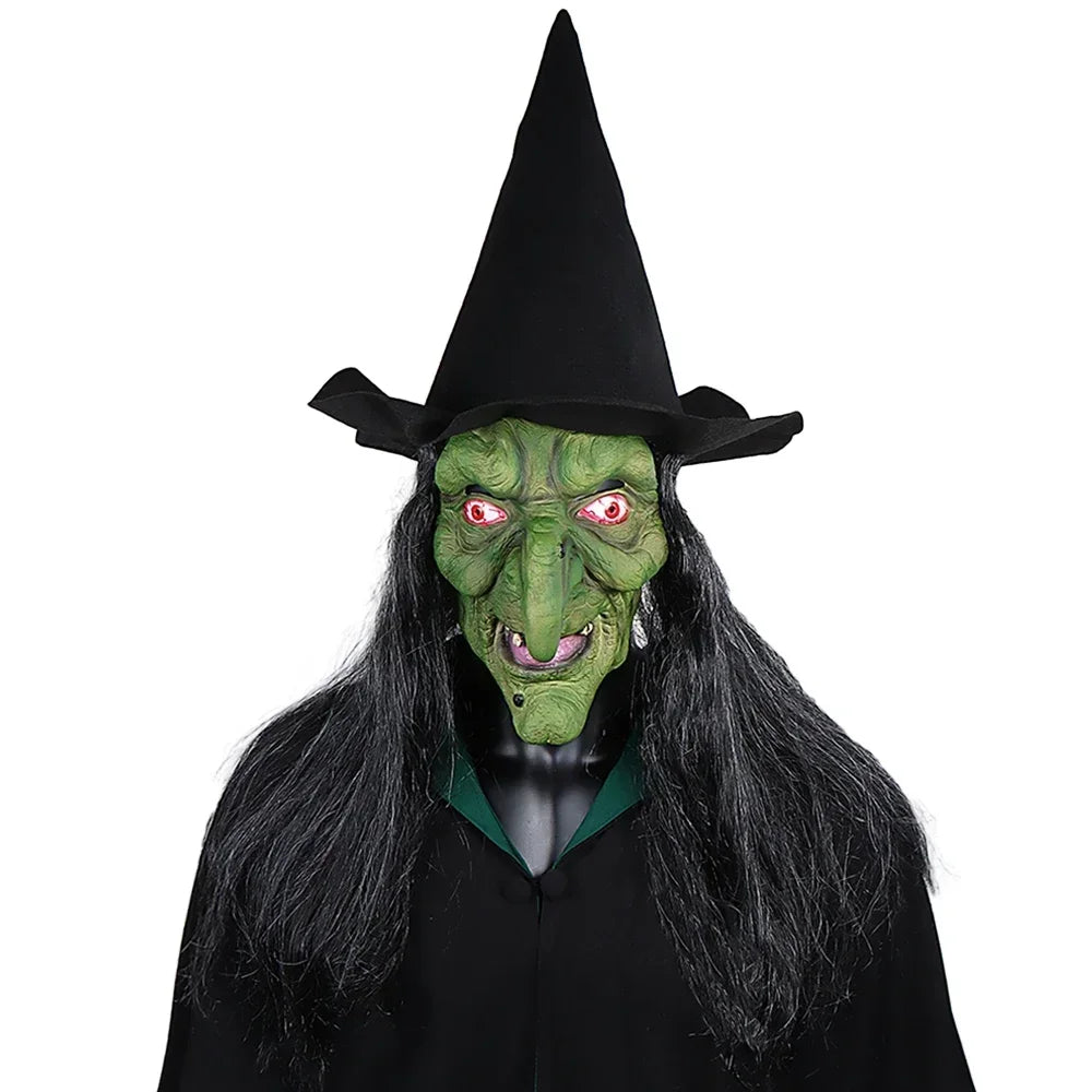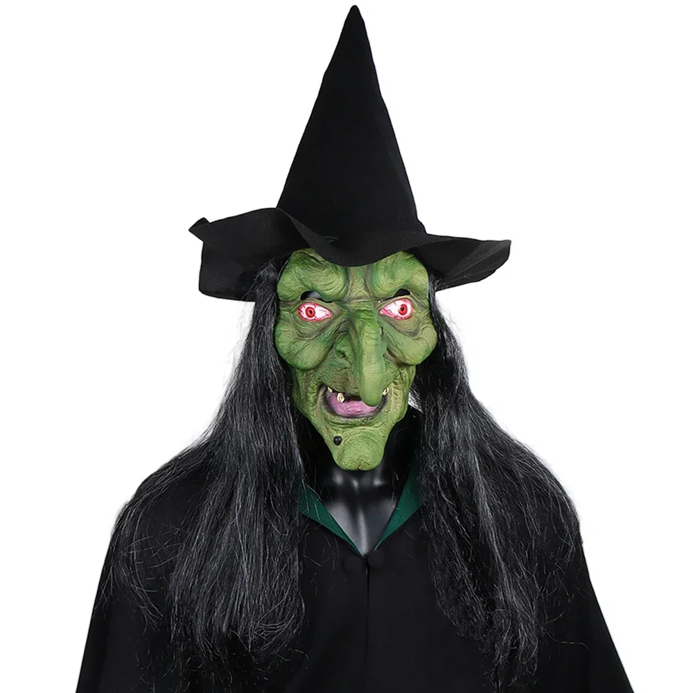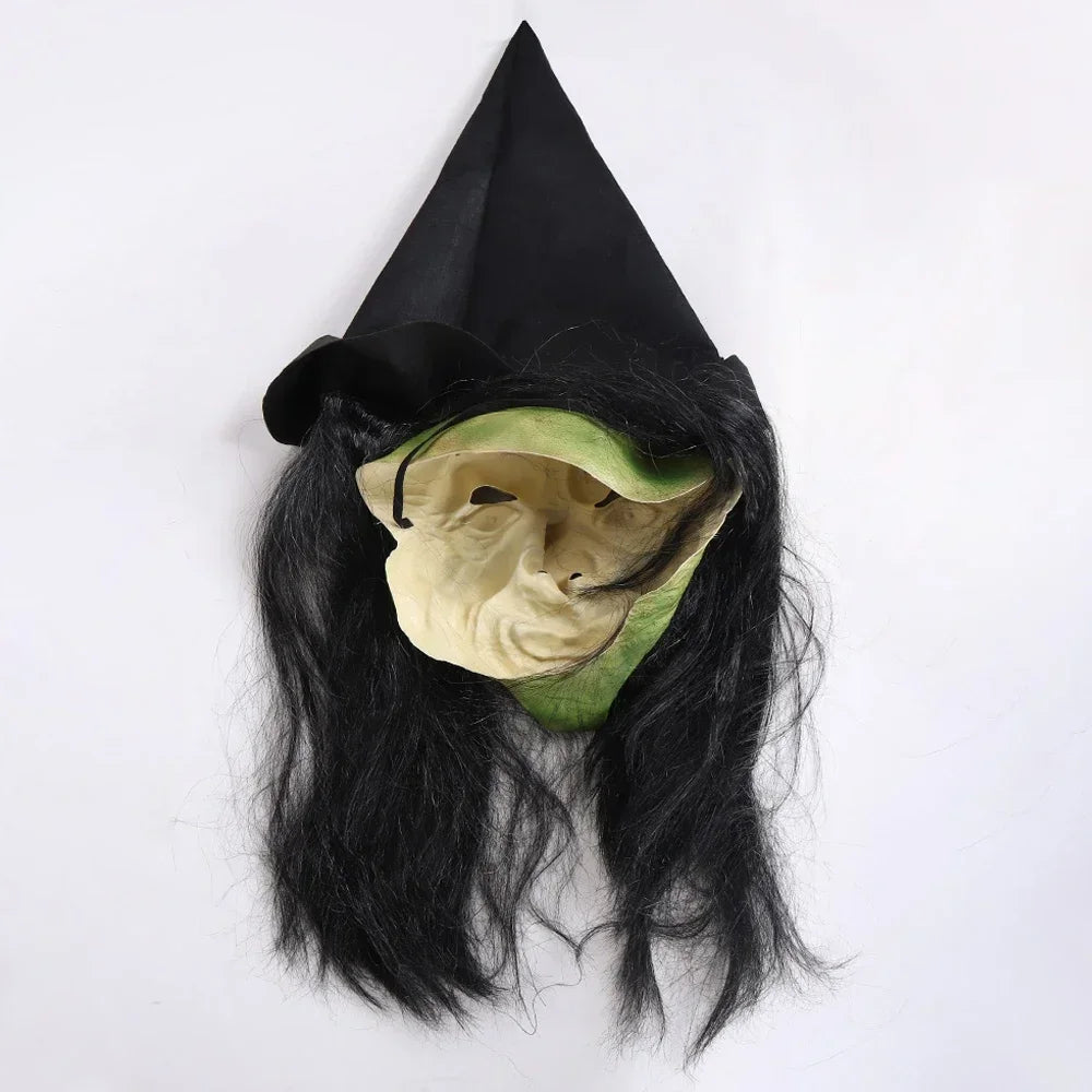 Halloween Horror Old Witch Mask with Hat Cosplay Scary Clown Hag Latex Masks Green Face Big Nose Old Women Costume Party Props