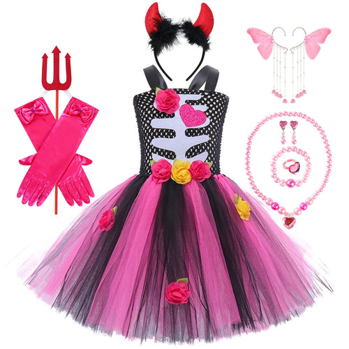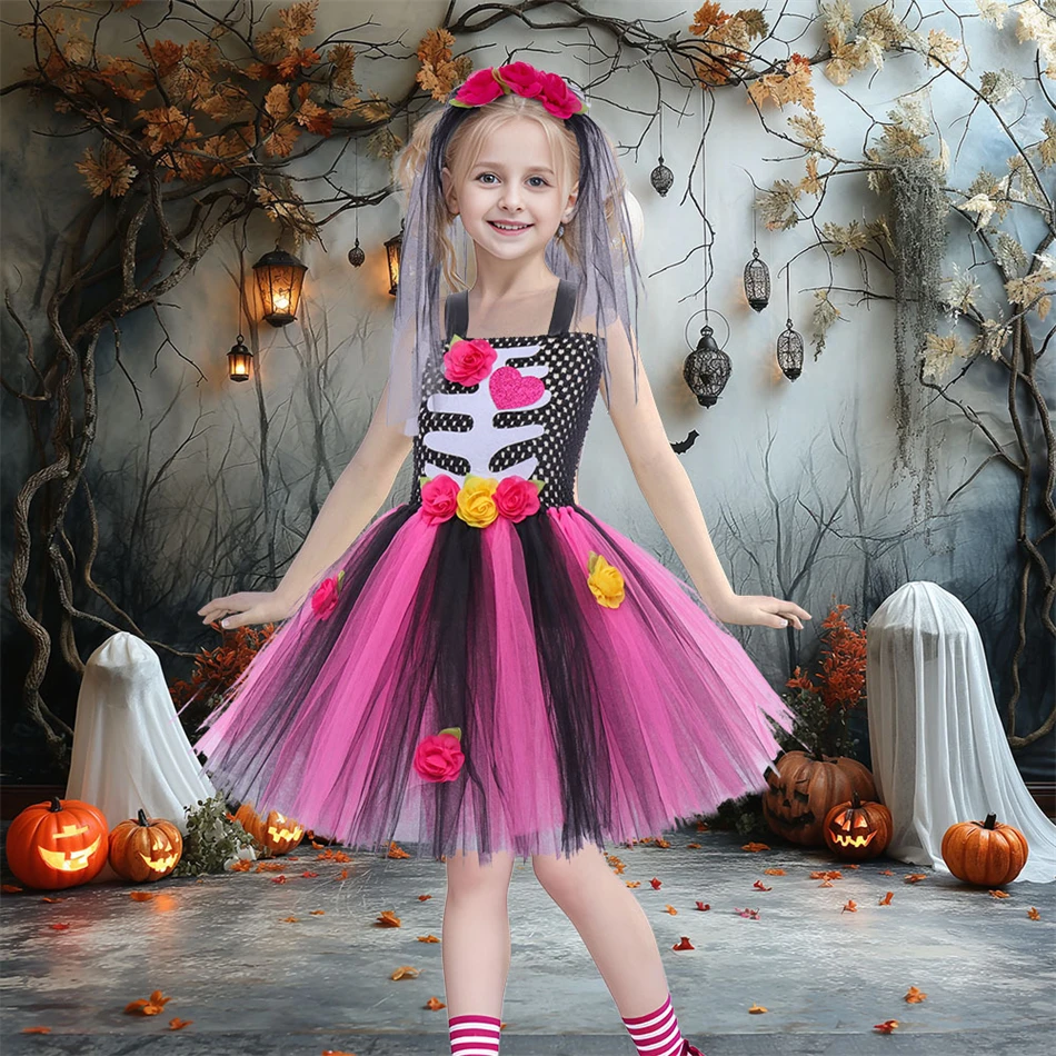 Halloween Kids Dress Cosplay Heart Print Skeleton Costumes Girls Floral Skull Tutu Clothes Children Carnival Performance Outfits