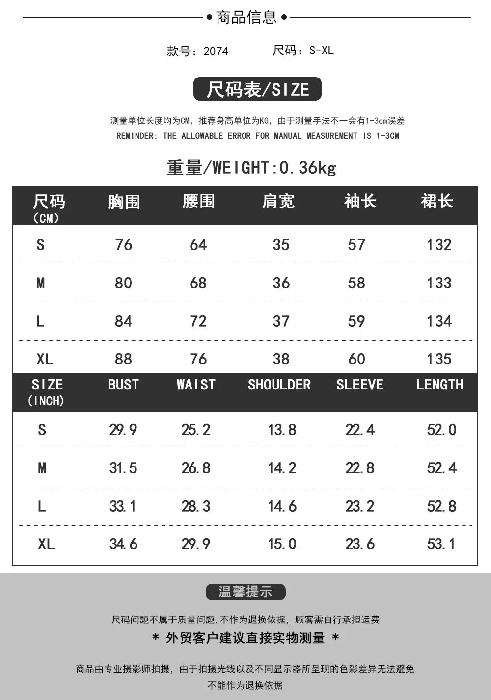 XL: Bust 88cm/34.64inch, Waist 76cm/29.92inch, Shoulder 38cm/14.96inch, Sleeve 60cm/23.62inch, Skirt Length 135cm/53.14inch
