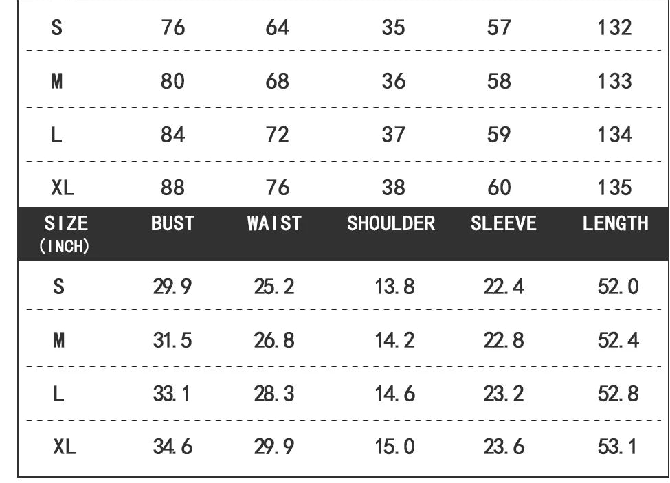 S: Bust 76cm/29.92inch, Waist 64cm/25.19inch, Shoulder 35cm/13.77inch, Sleeve 57cm/22.44inch, Skirt Length 132cm/51.96inch