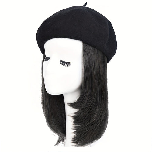 Hat Wig Beret Hat With Hair Extensions Classic French Fashion Hat Attached 11" Synthetic Straight Short Bob Hairpiece For Women Winter Warm Cap Wig Christmas Gift