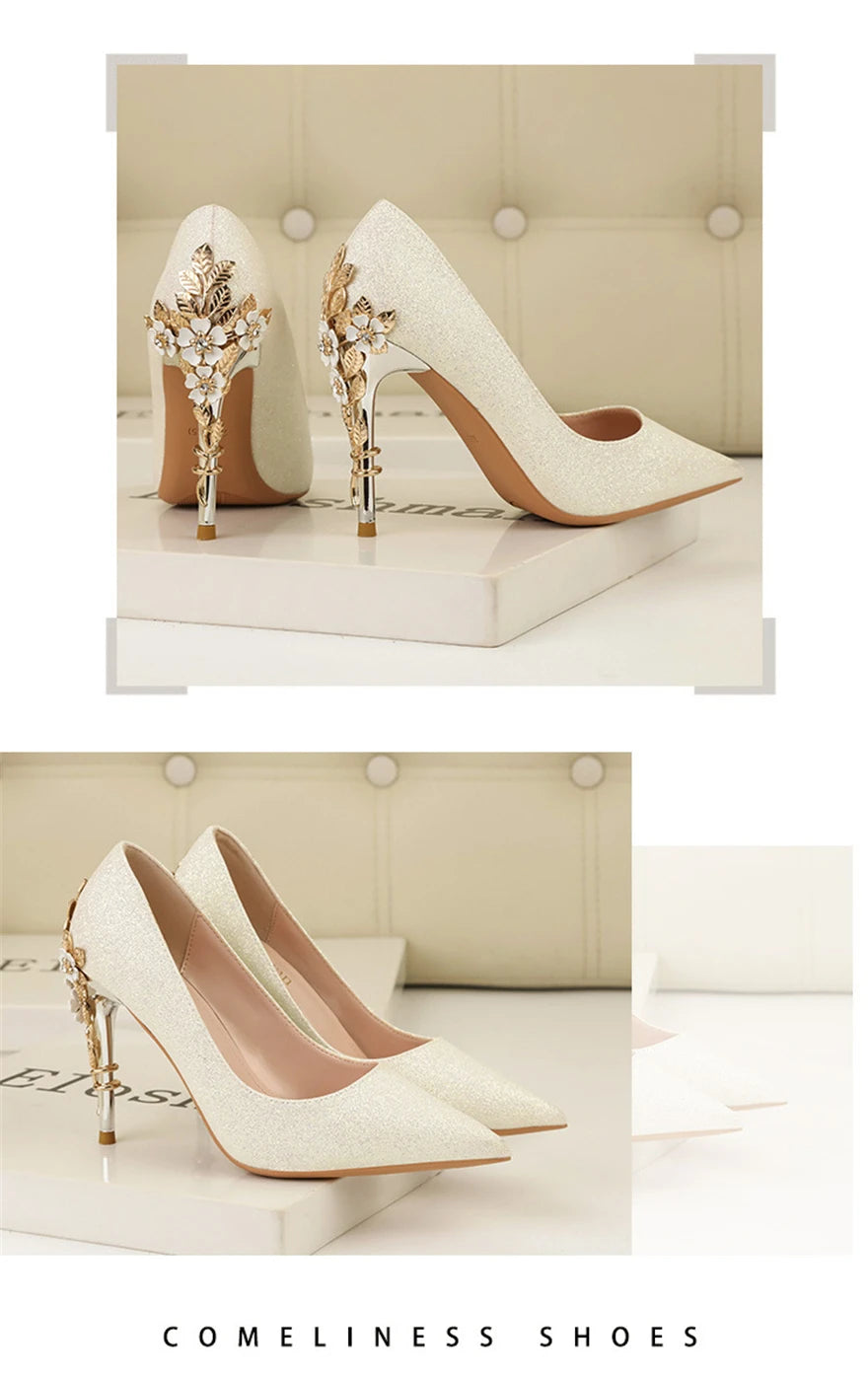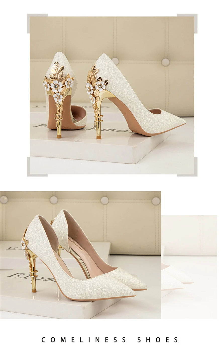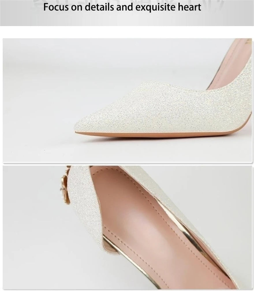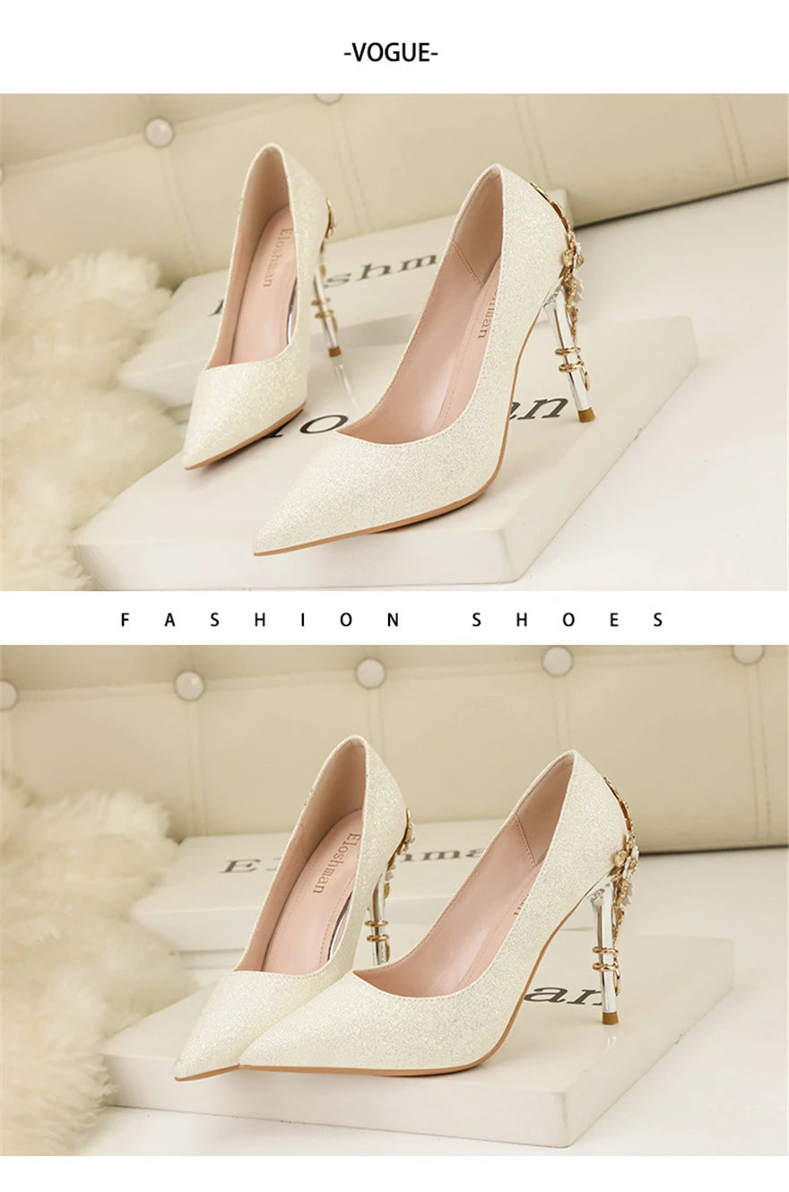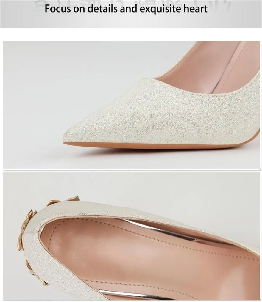 Light Luxury Sexy Women Dress Shoes 2025 Autumn Metal Flower Fashion High Heel Wedding White Pointed Sequins Shiny Female Pumps