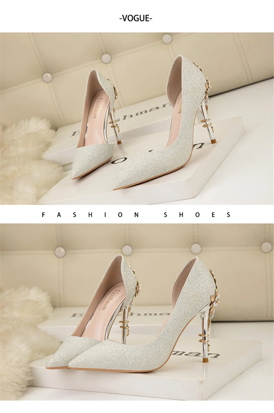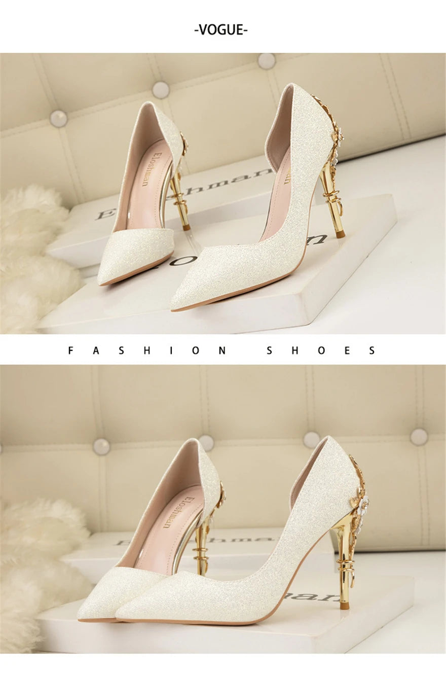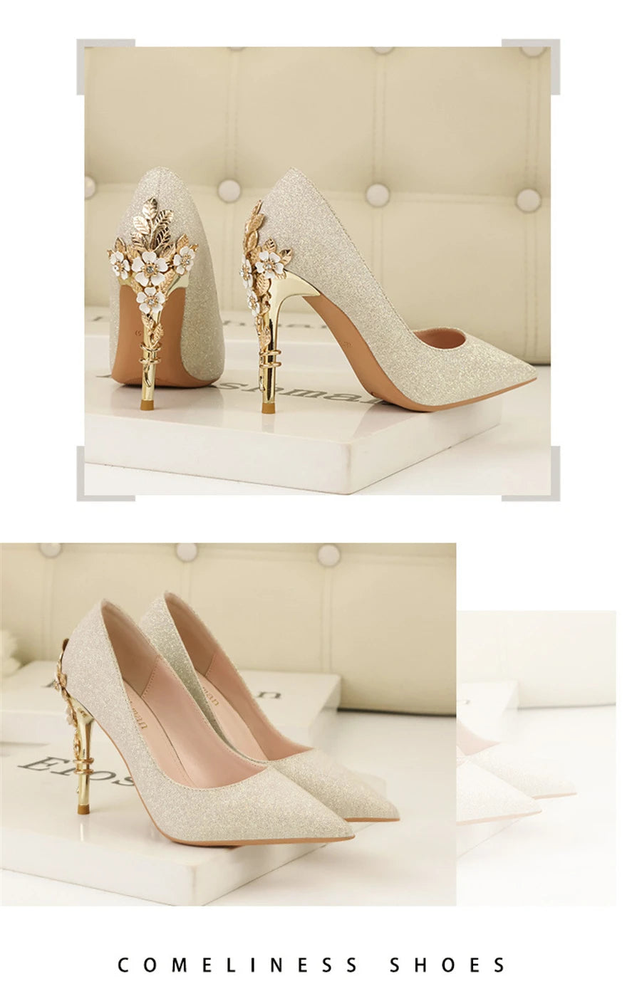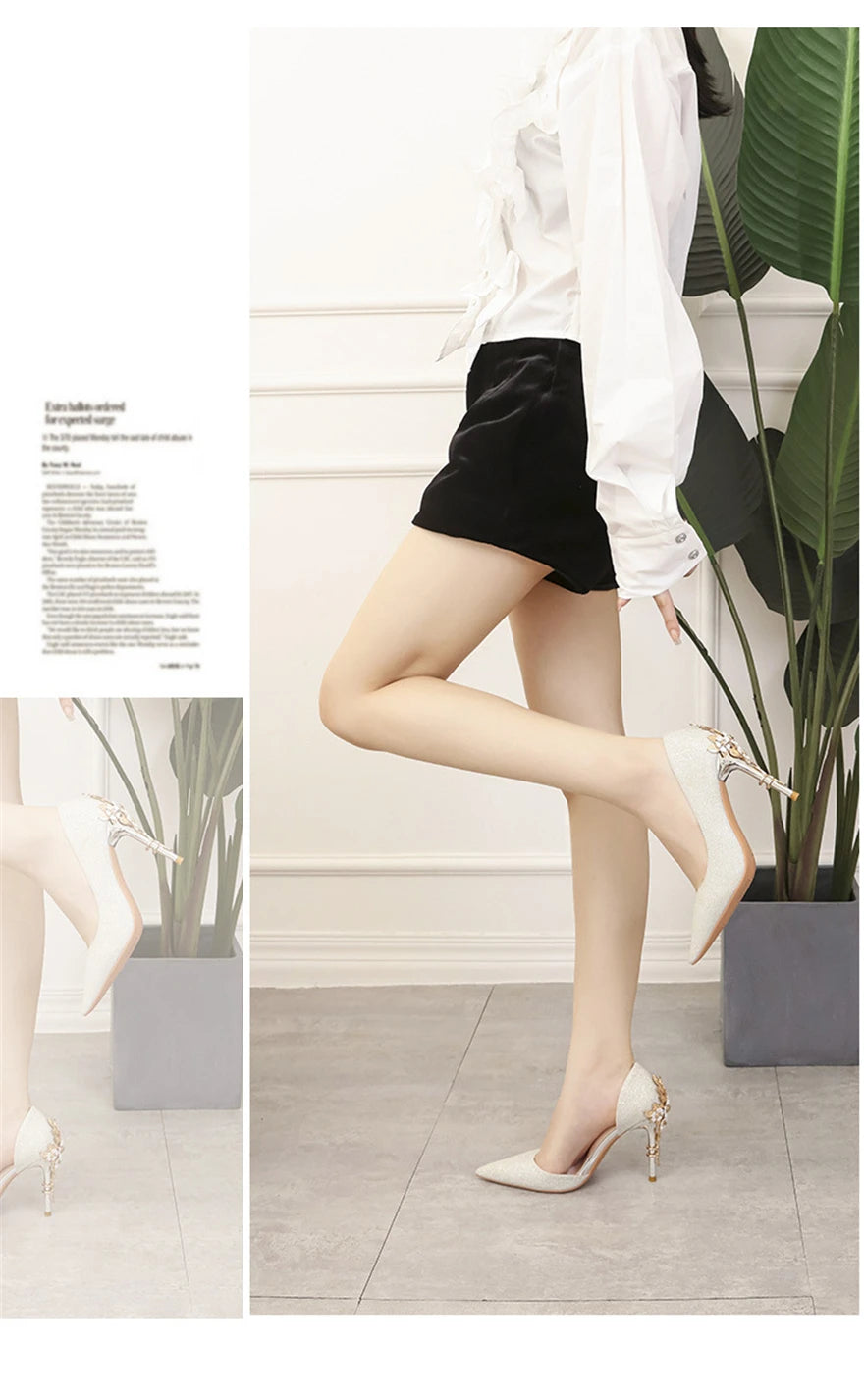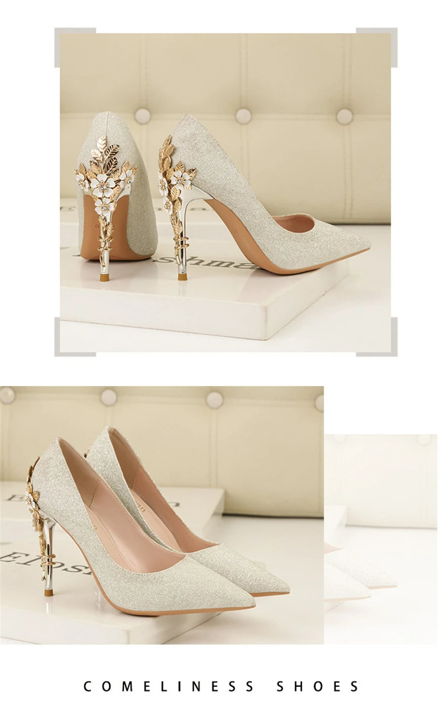 Light Luxury Sexy Women Dress Shoes 2025 Autumn Metal Flower Fashion High Heel Wedding White Pointed Sequins Shiny Female Pumps