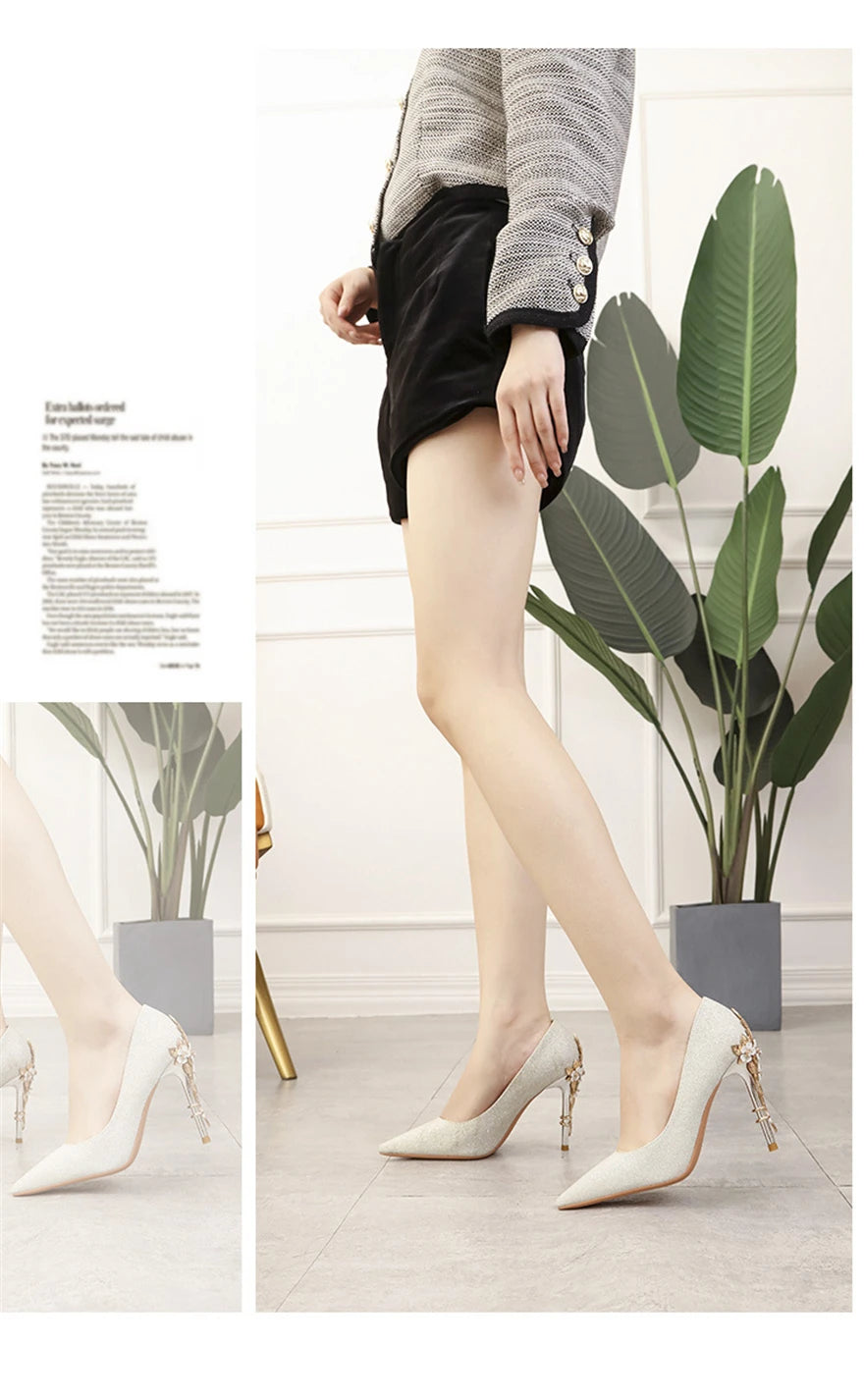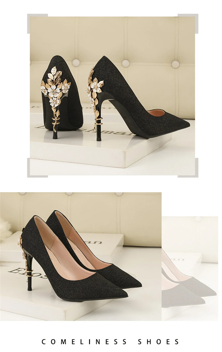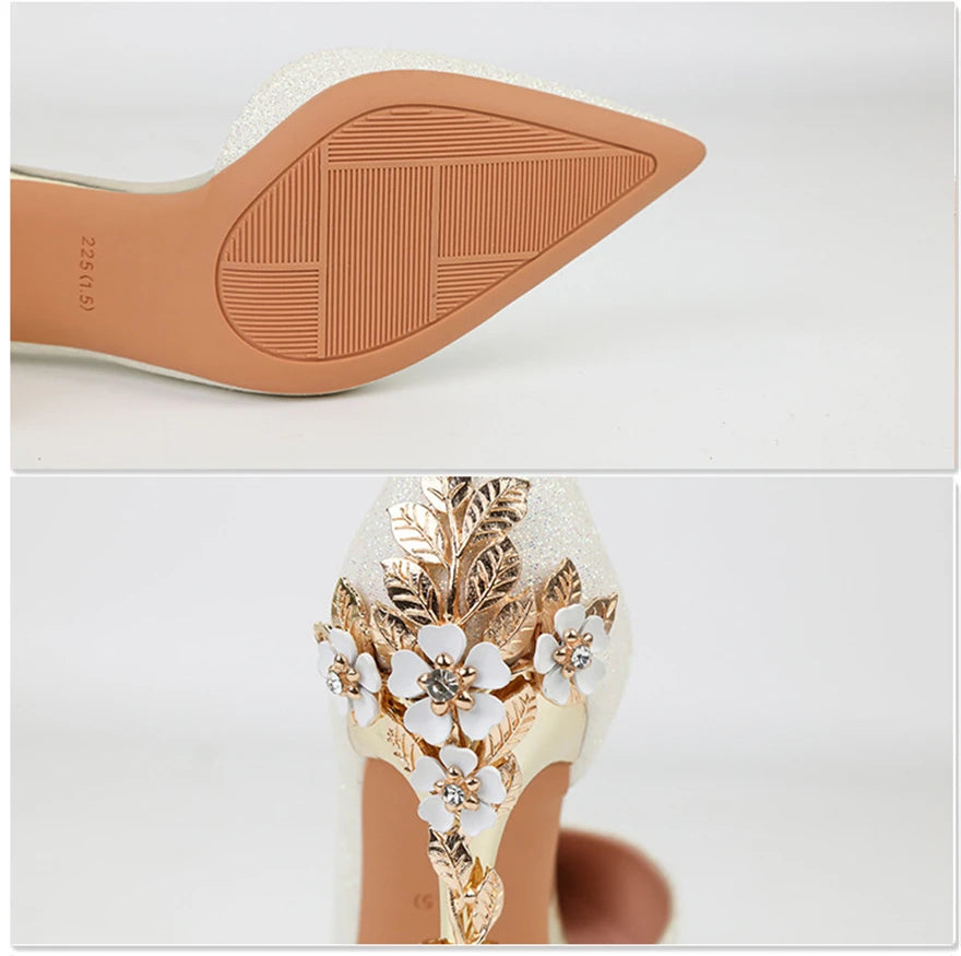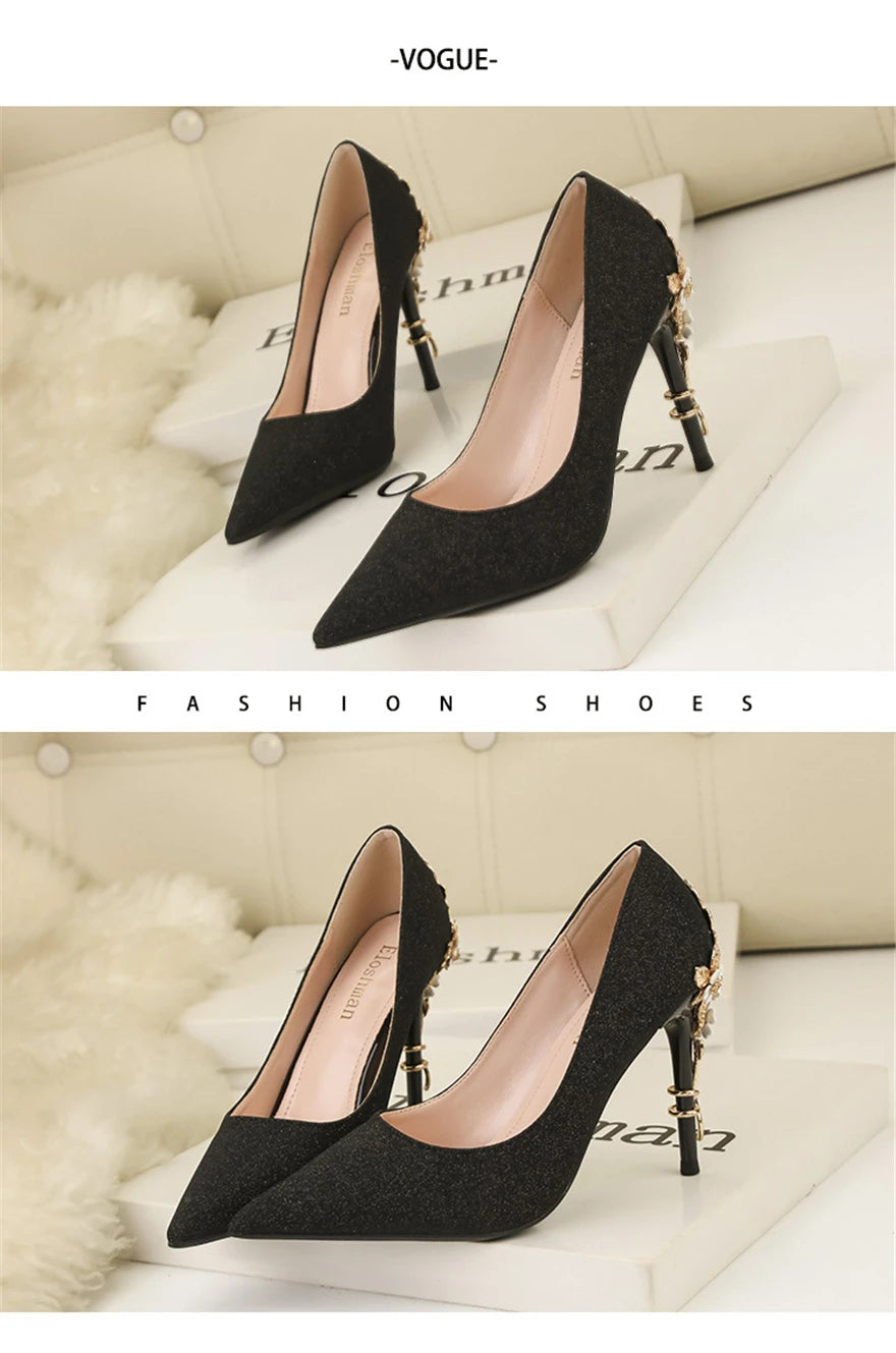 Light Luxury Sexy Women Dress Shoes 2025 Autumn Metal Flower Fashion High Heel Wedding White Pointed Sequins Shiny Female Pumps