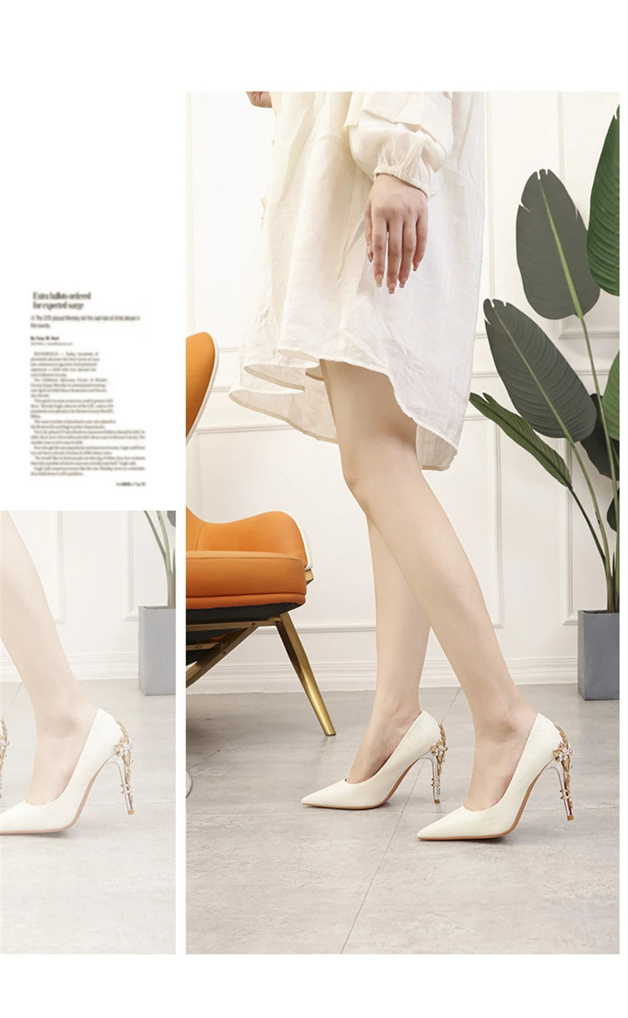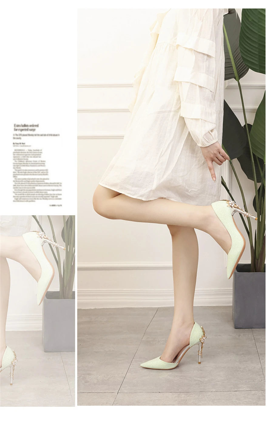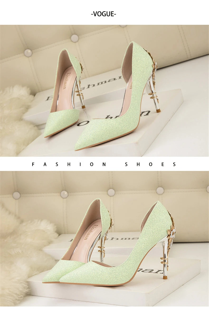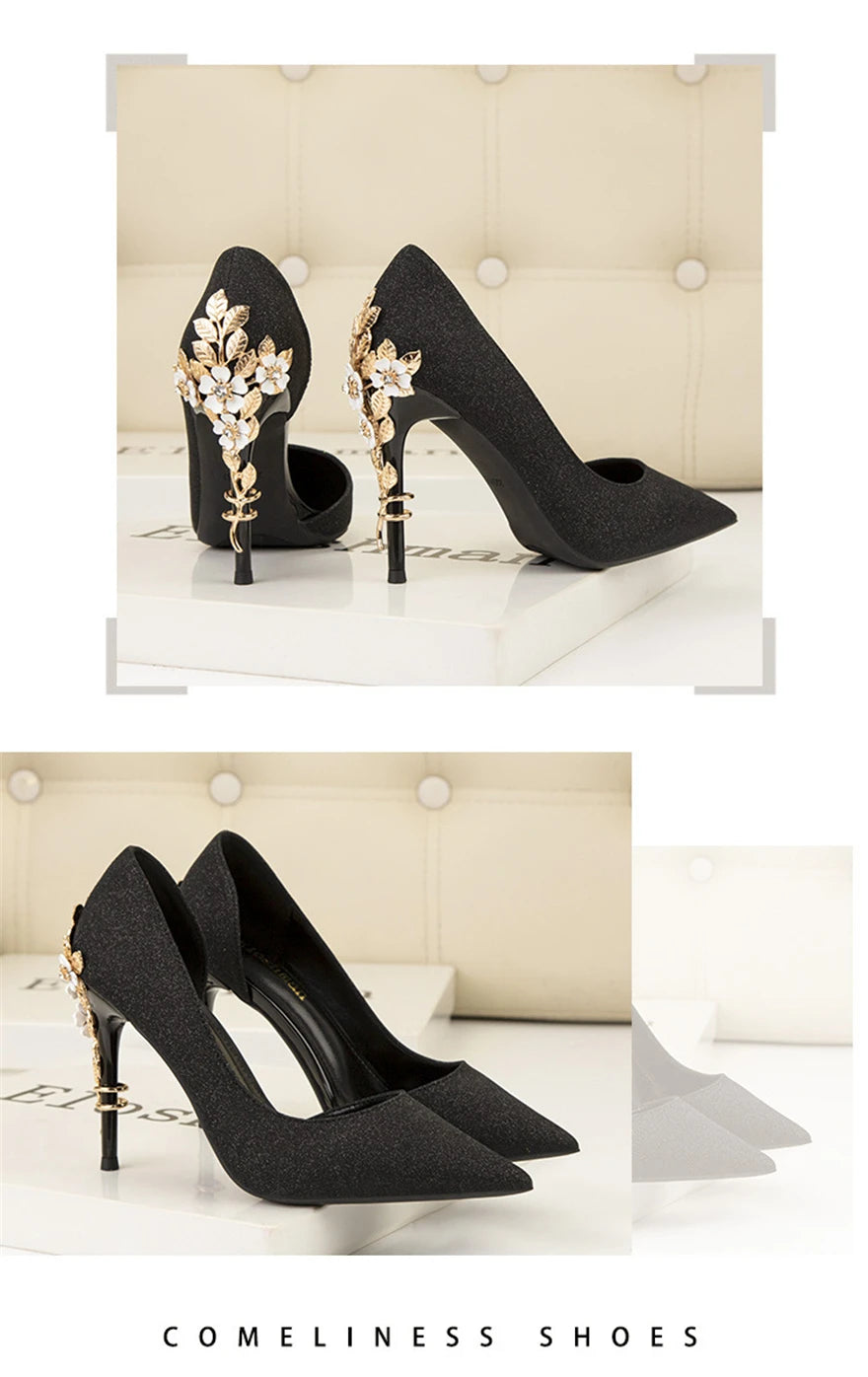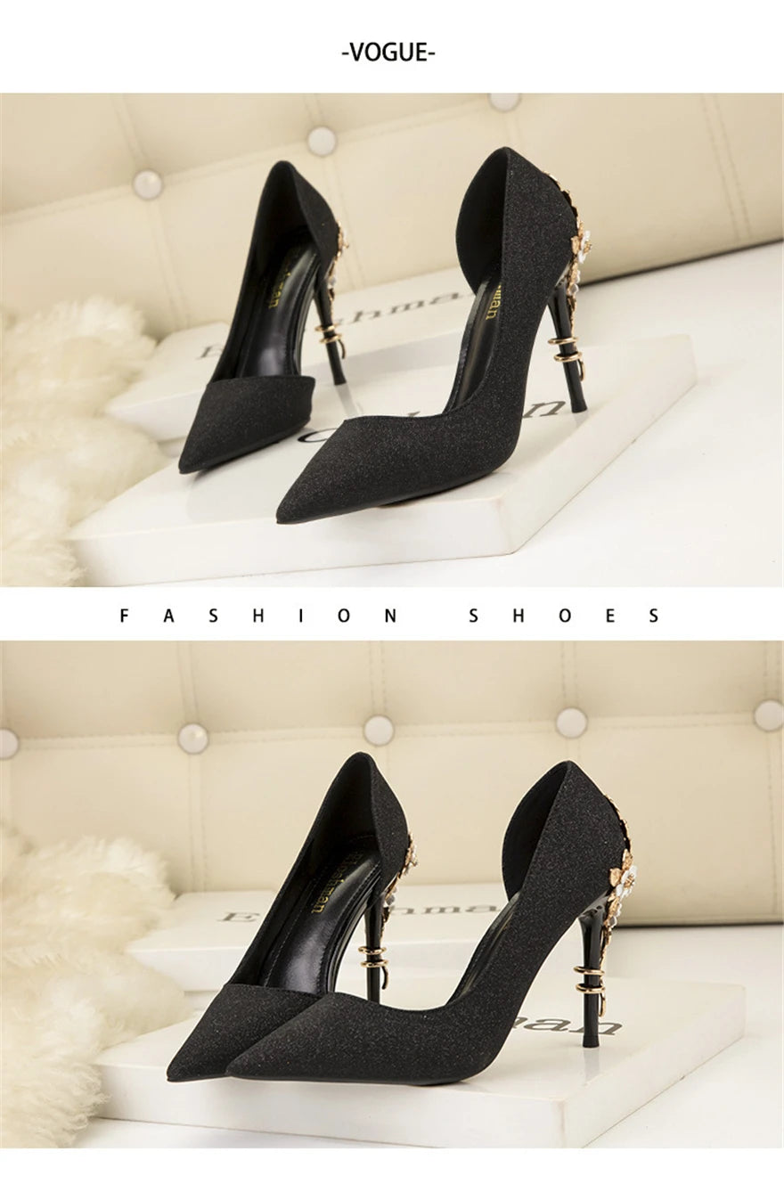 Light Luxury Sexy Women Dress Shoes 2025 Autumn Metal Flower Fashion High Heel Wedding White Pointed Sequins Shiny Female Pumps
