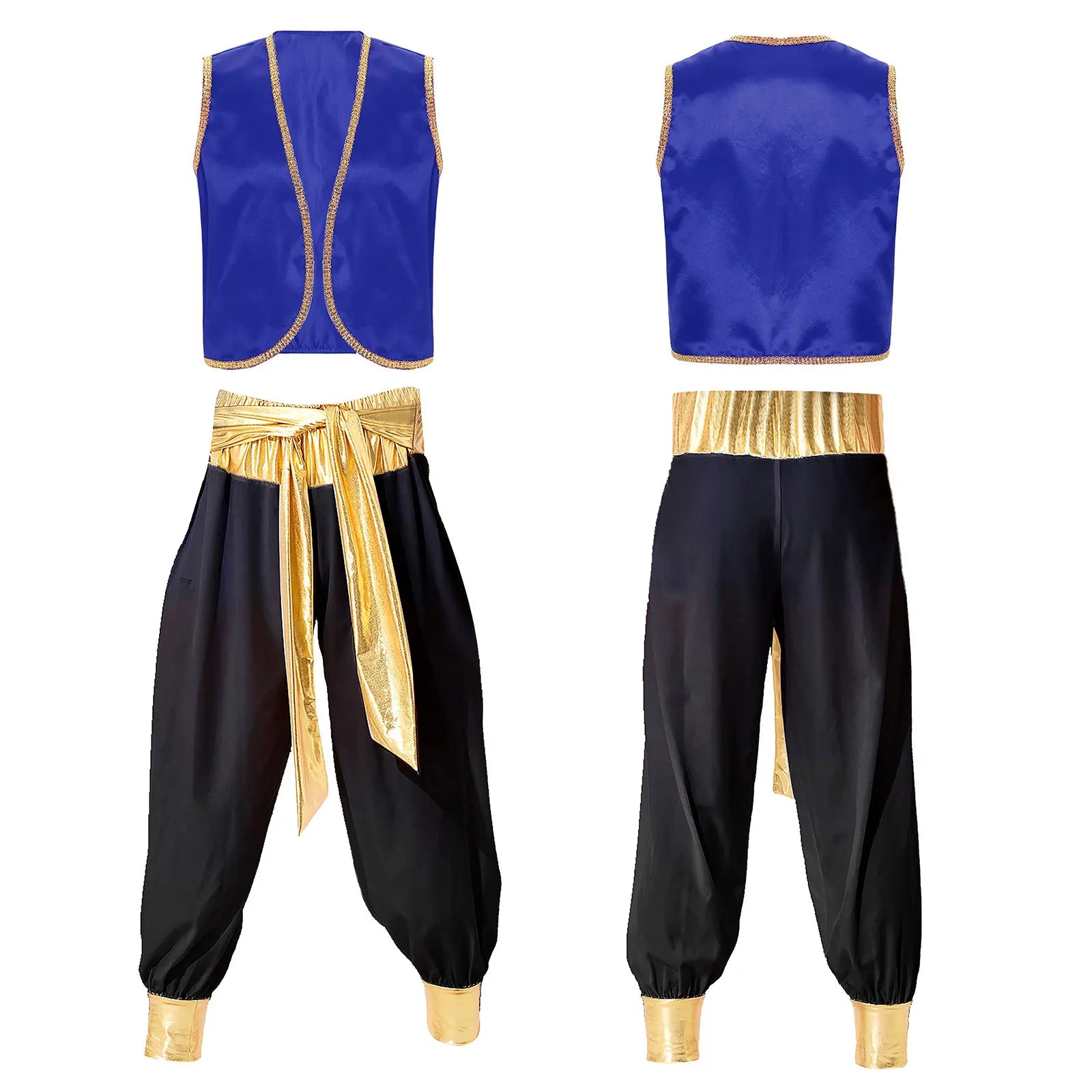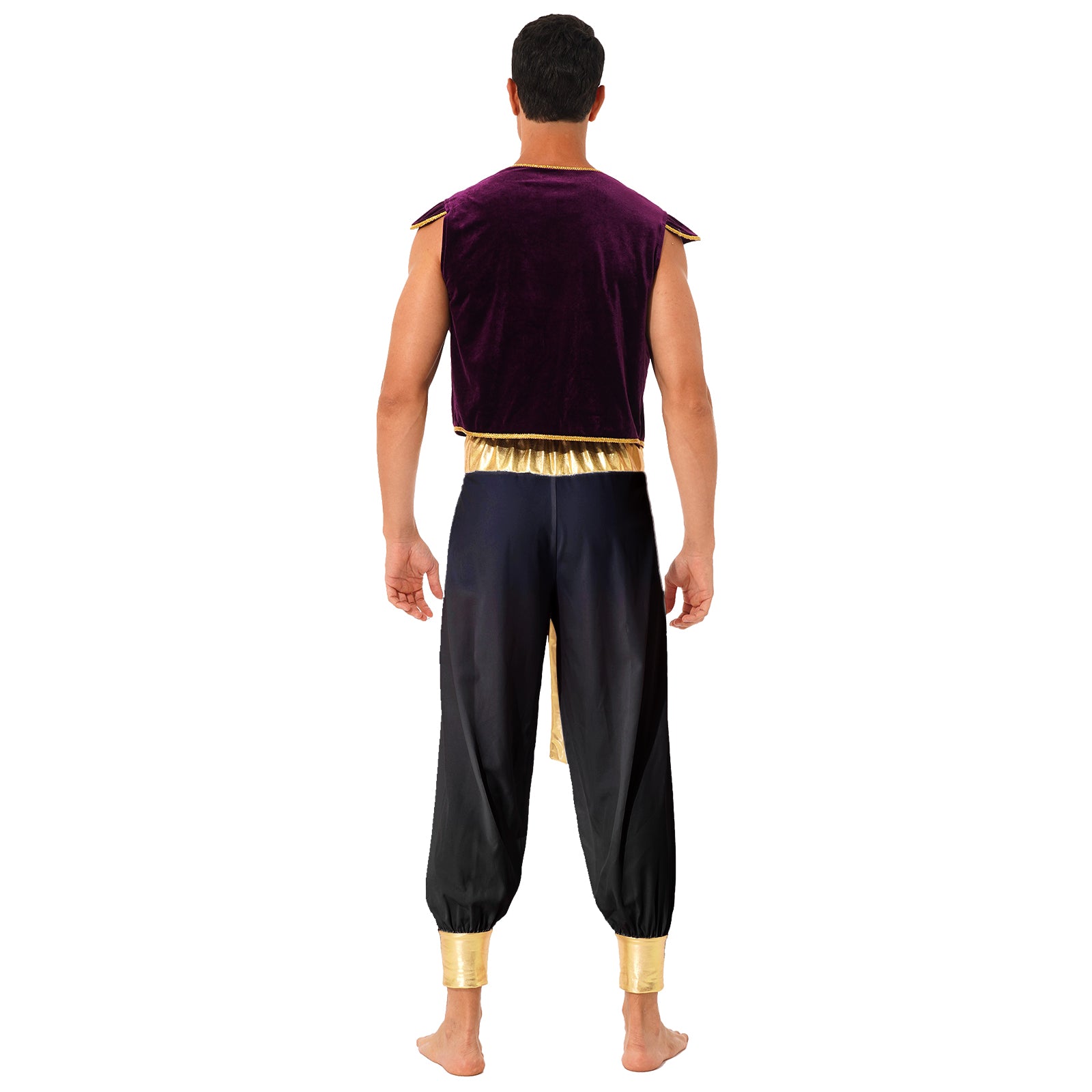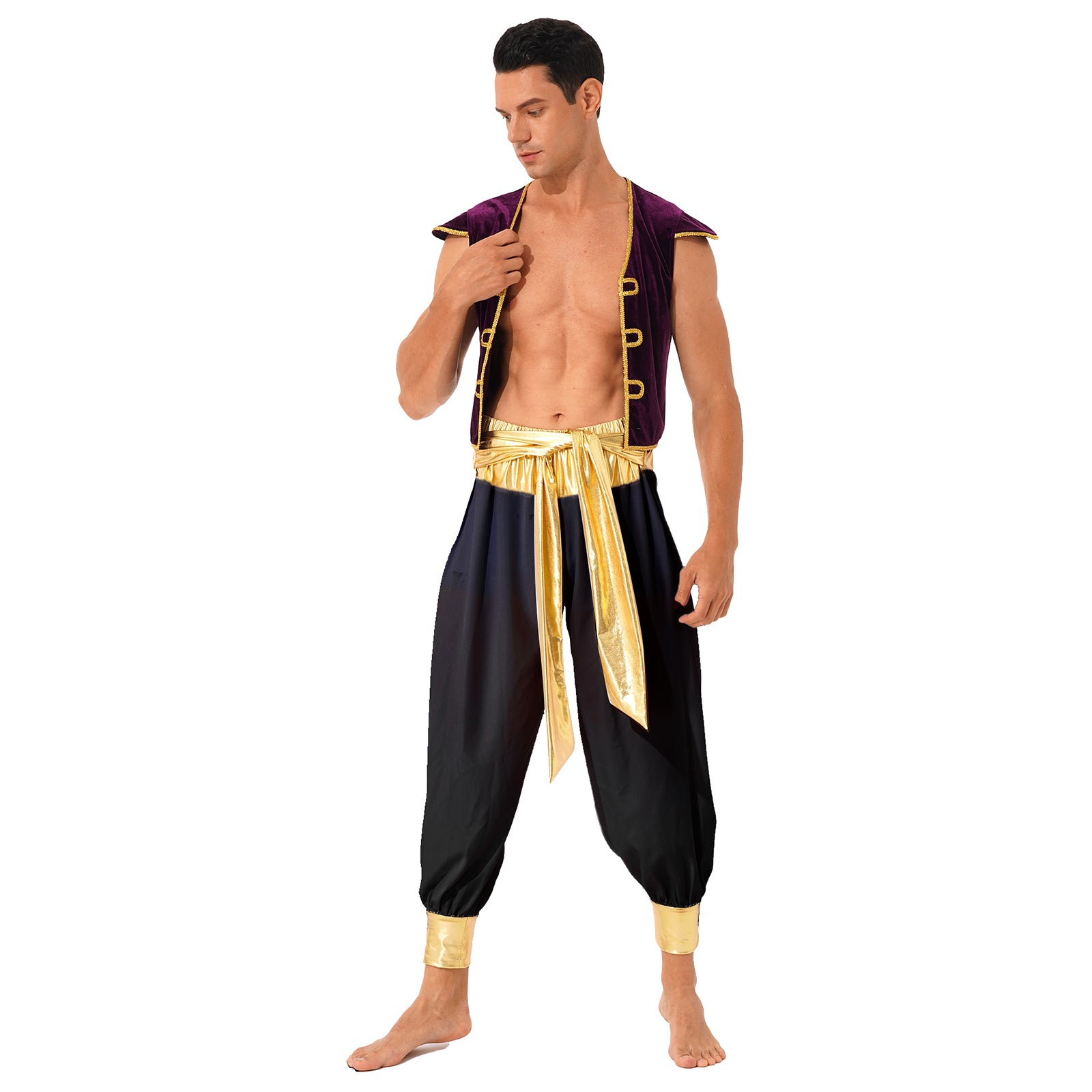 Mens Halloween Costume Mythical Arabian Prince Carnival Cosplay Party Outfit Sequin Trim Waistcoat with Belted Pants