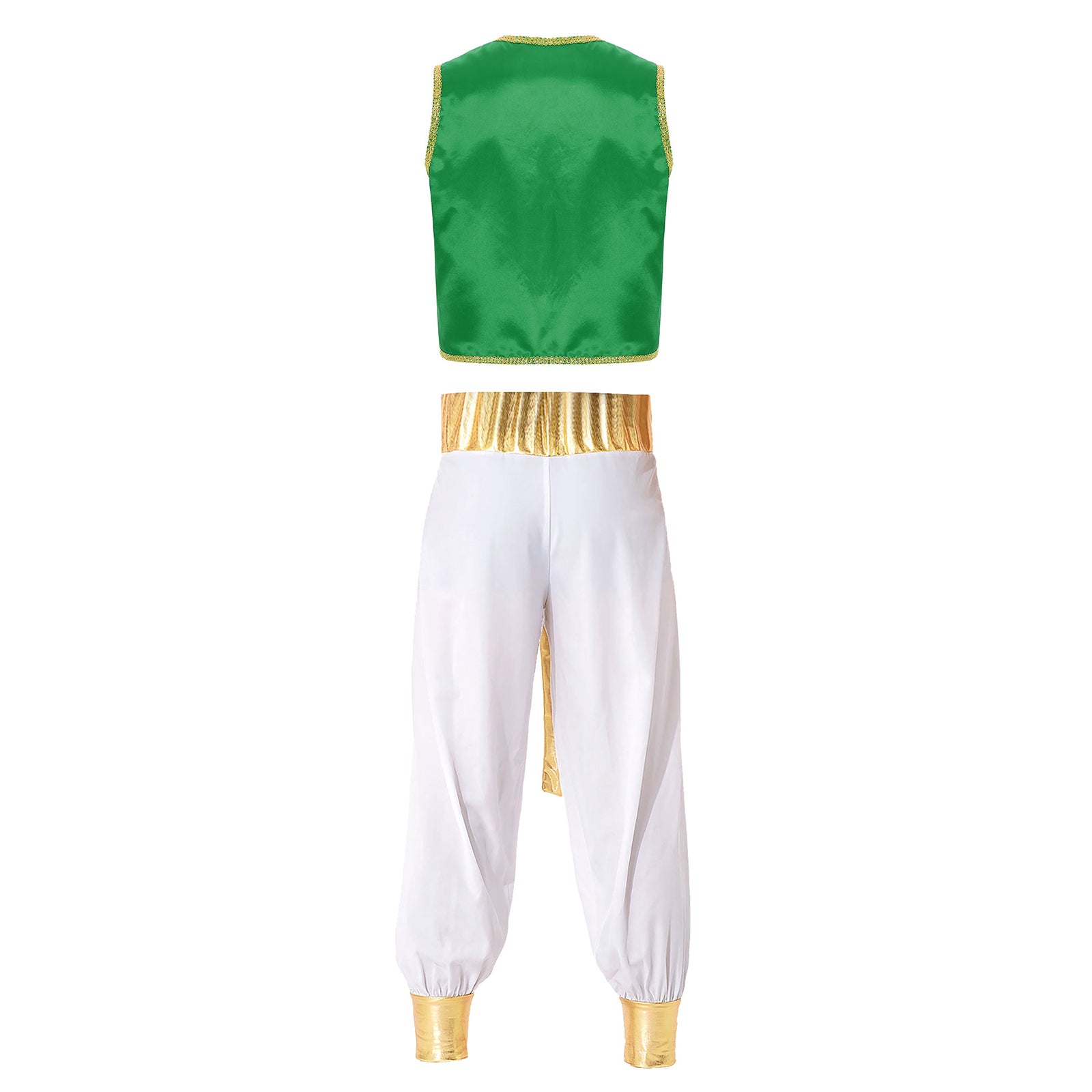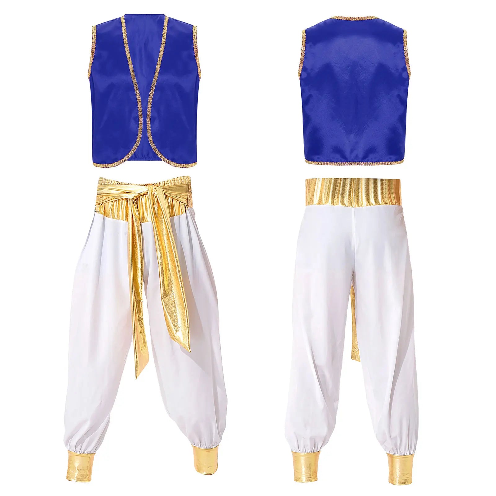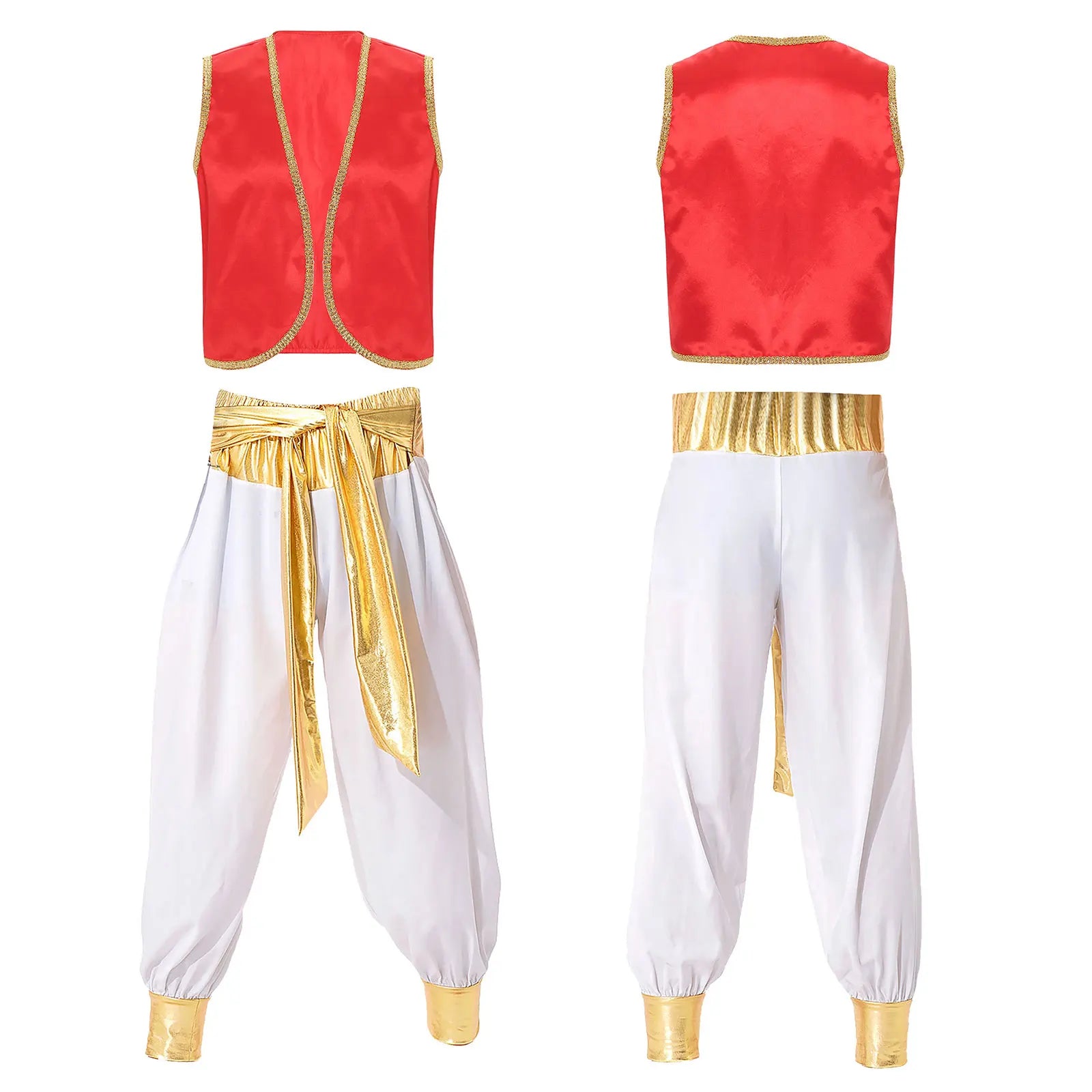 Mens Halloween Costume Mythical Arabian Prince Carnival Cosplay Party Outfit Sequin Trim Waistcoat with Belted Pants