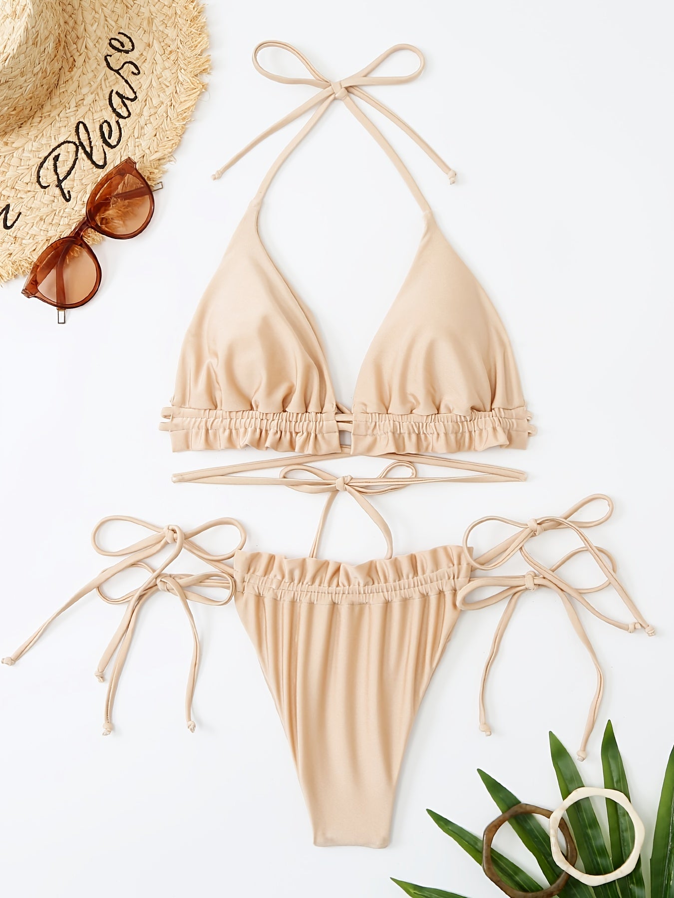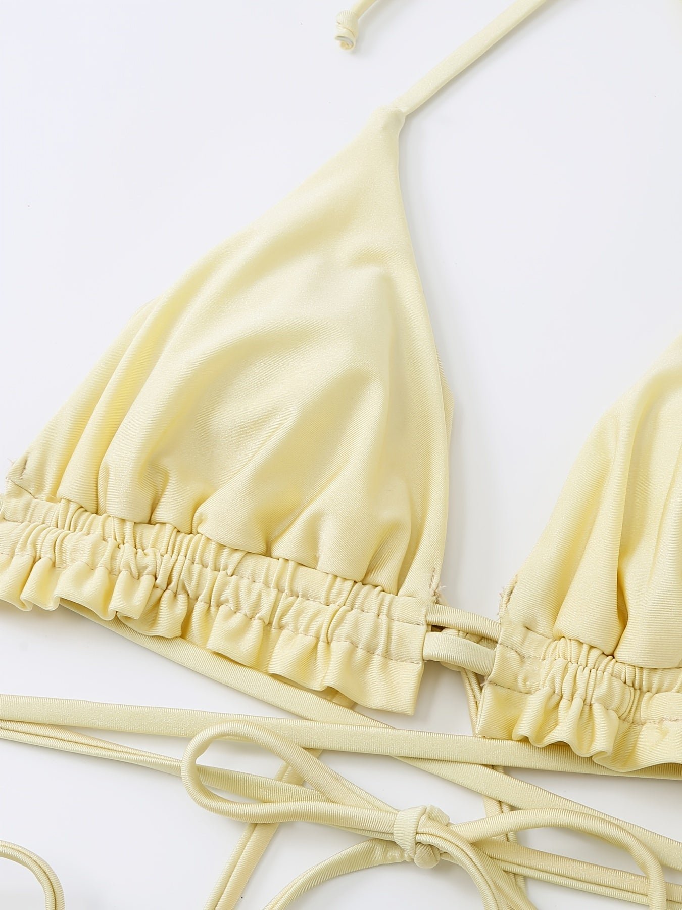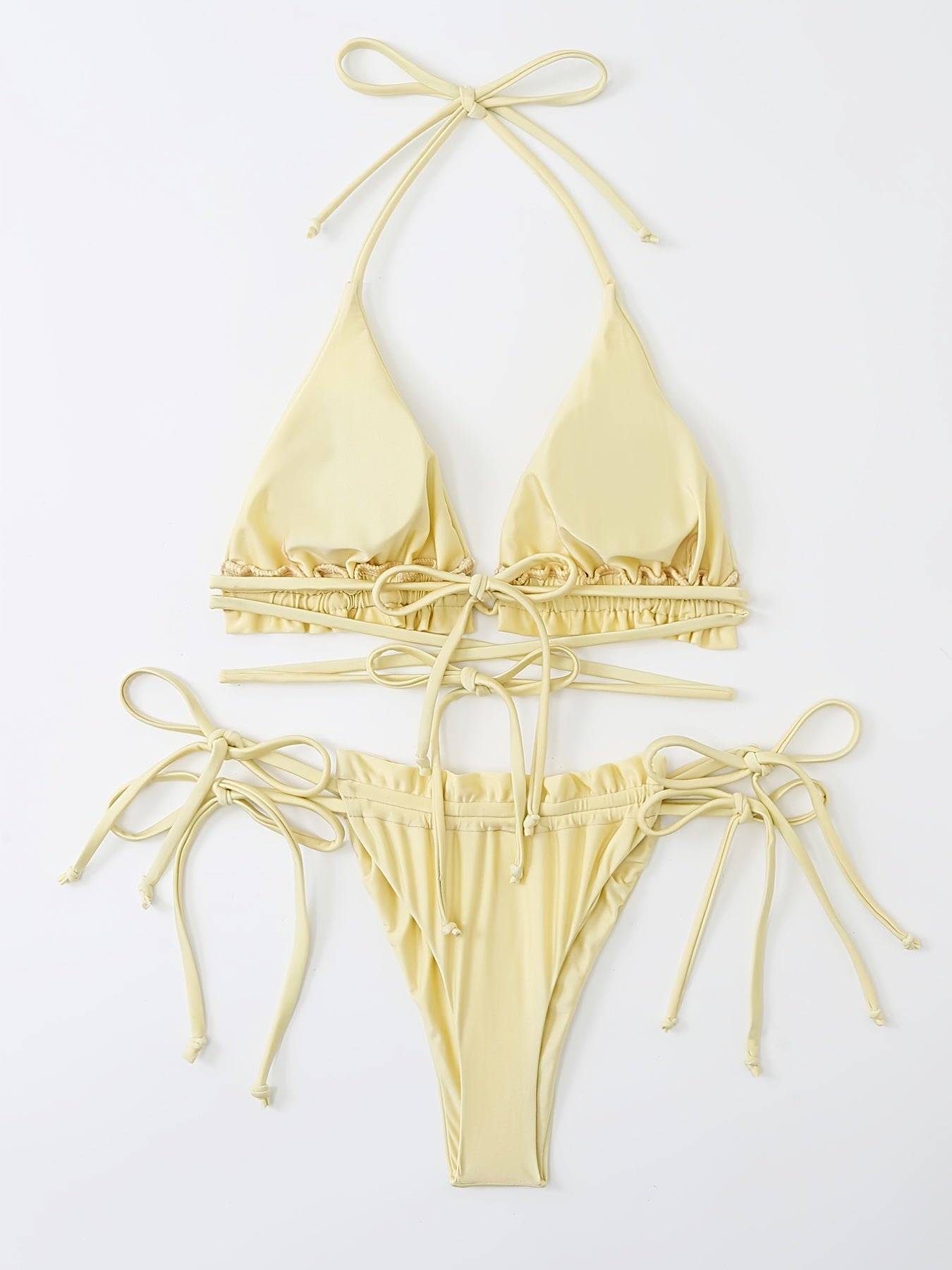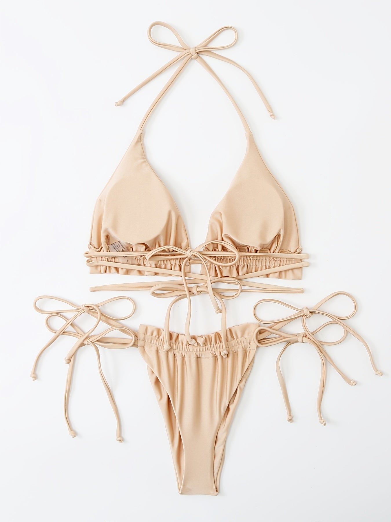 New Bikini Set with Multiple Straps and Bow Swimwear for Women's Solid Color One-Shoulder Swimsuit