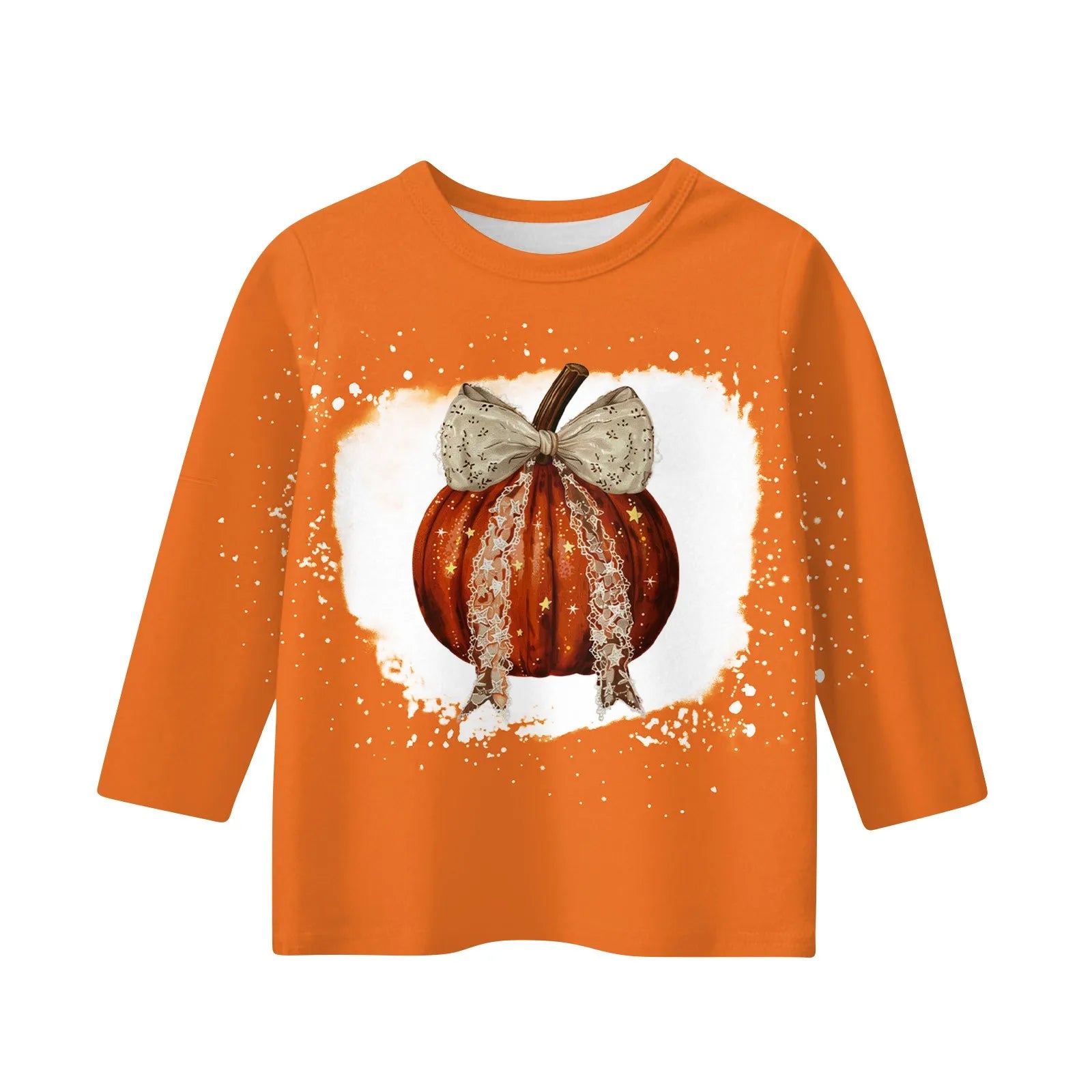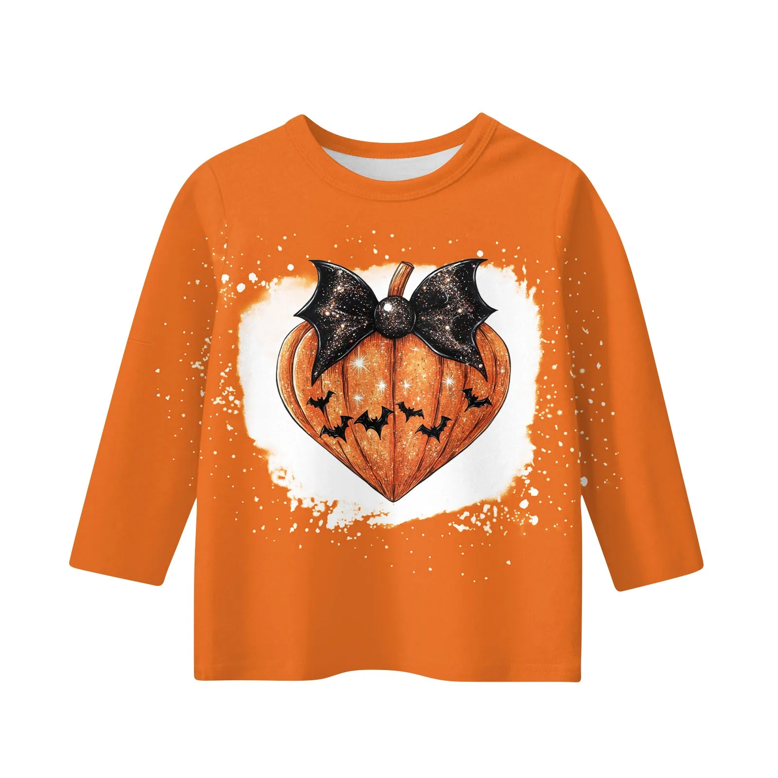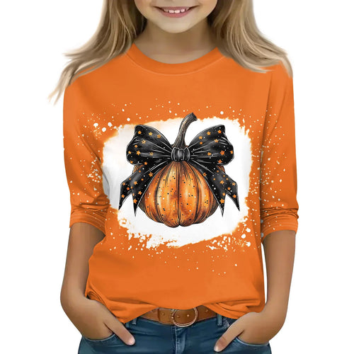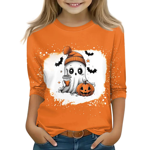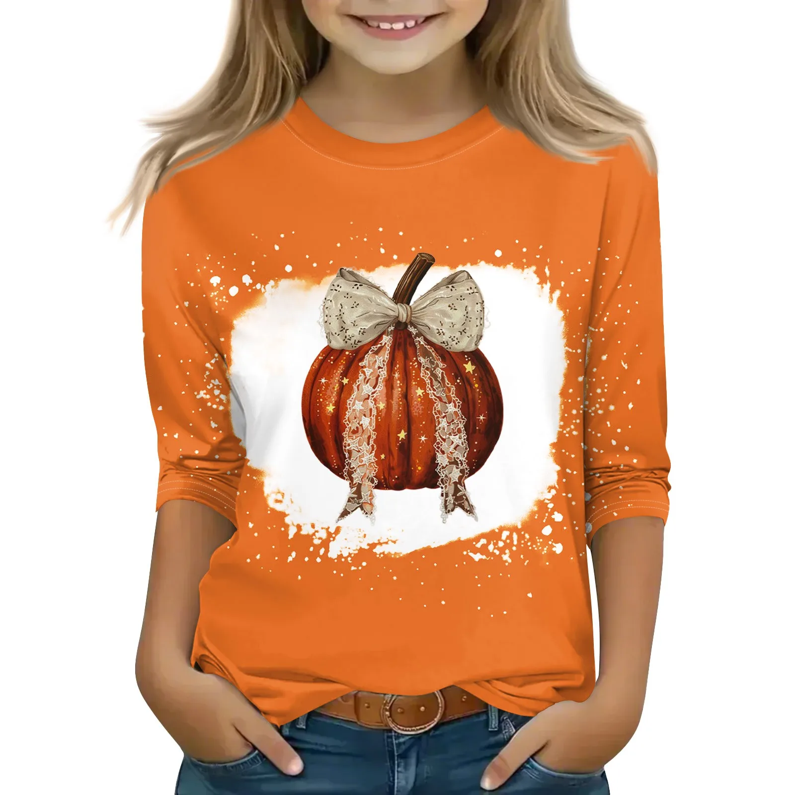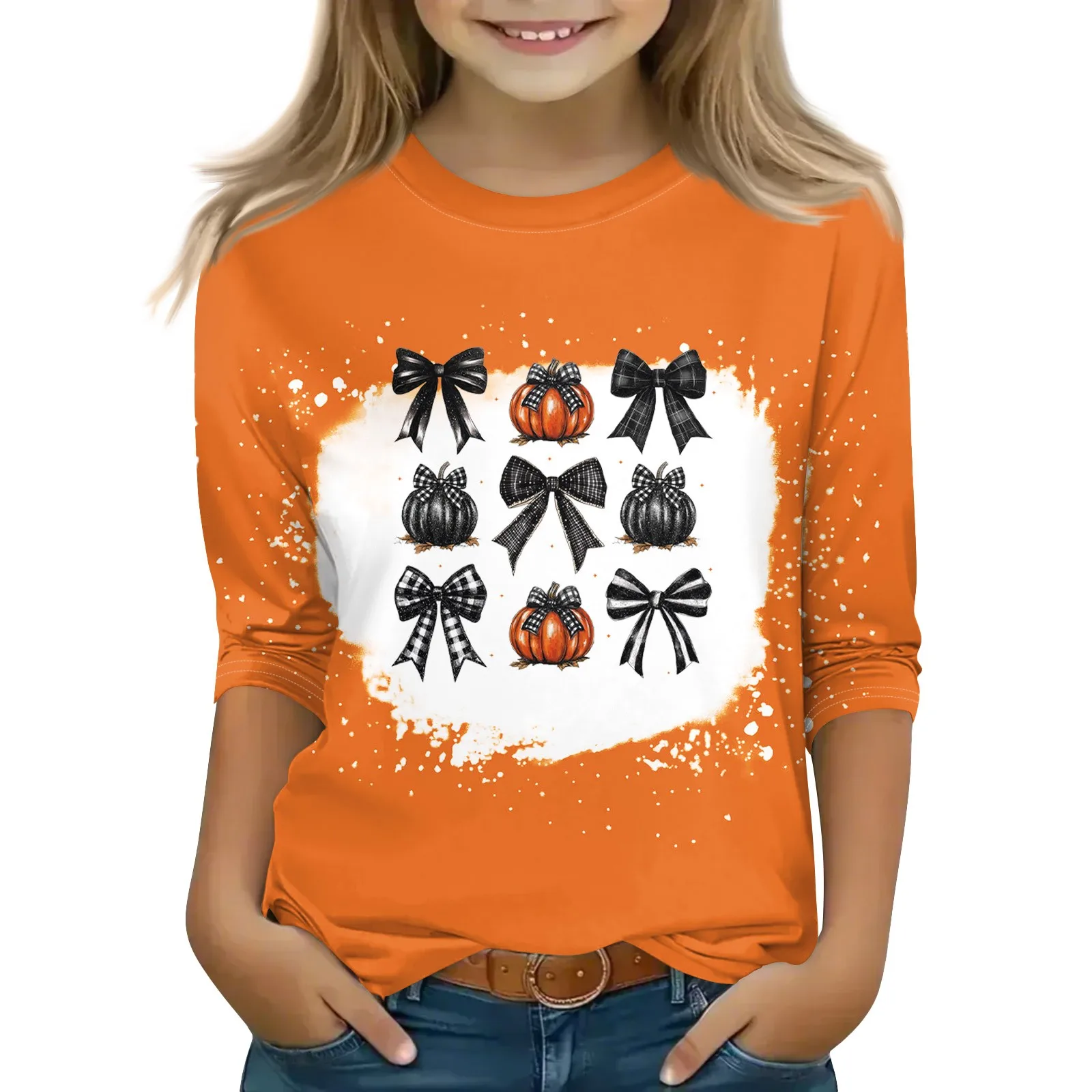 New Halloween Theme Cute Girl Printed T-shirt High Quality Three-quarter Sleeve Round Neck Tops Children Festival Birthday Gift