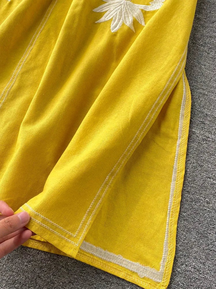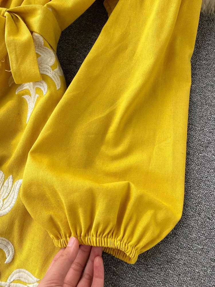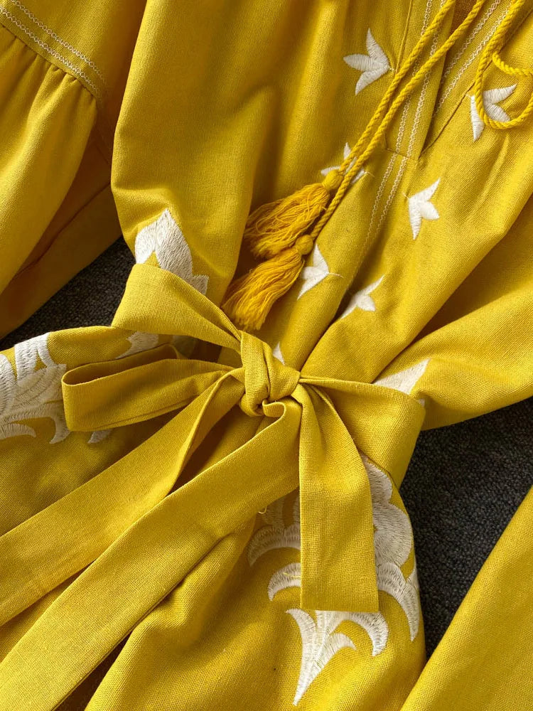 New Spring Autumn Embroidered Dress V-neck Tie Split Retro Indie Folk Style Holiday Beach Long Dress.