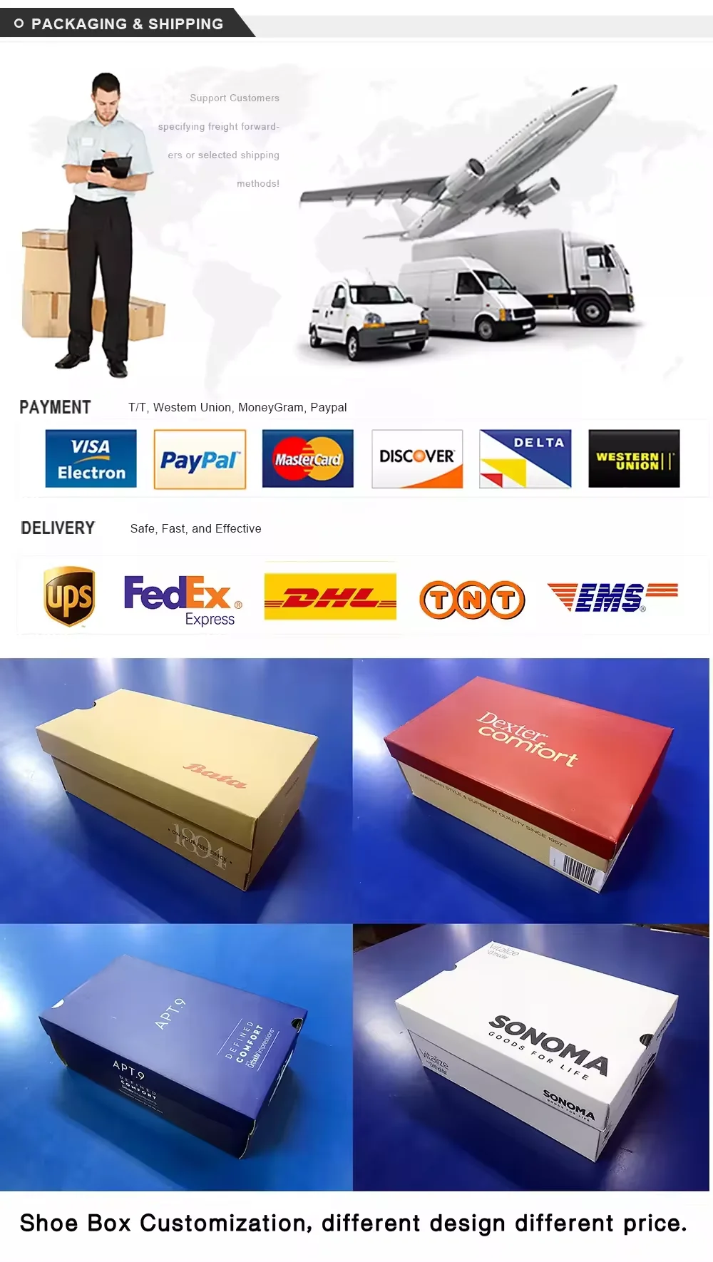 4.What's your MOQ? Our minimum is from 100 to 800 pairs/pieces for mass production,1 pair/pc for wholesale. Don't worry about