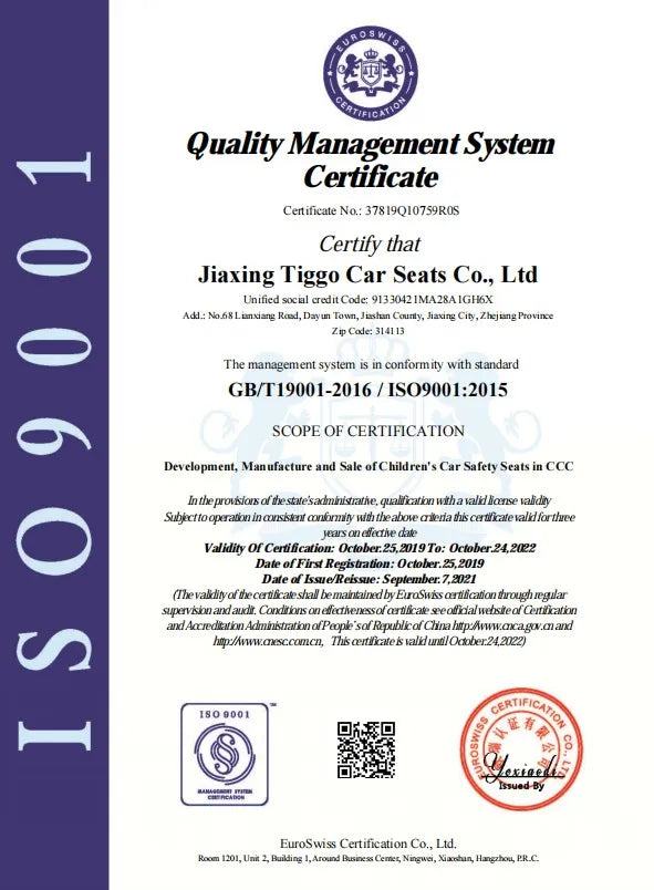Tiggo Car Seats Co., Ltd. is located in Jiashan County, Zhejiang Province. The 13000 m2 factory has 3 department: plastic processing, assembly and textile. Our main products are child safety car seats and bike trailer, with maximum production capacity of 20000 units per month. All child car seats are certified under UN ECE R44 or UN ECE R129 regulation. R&D and OEM service is also provided.