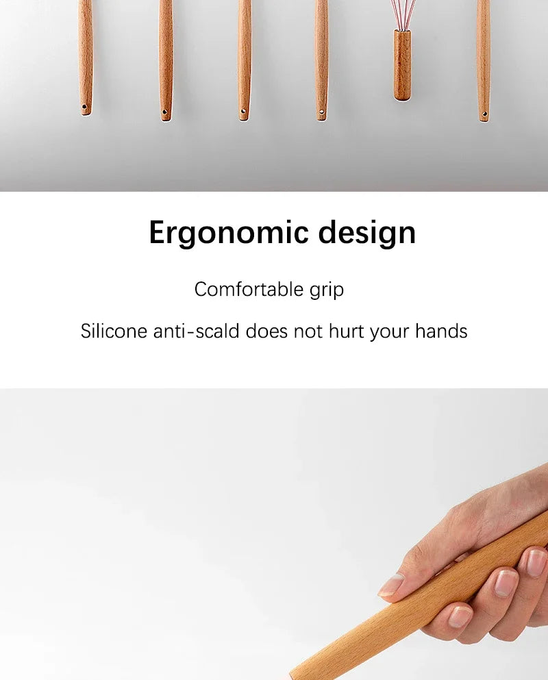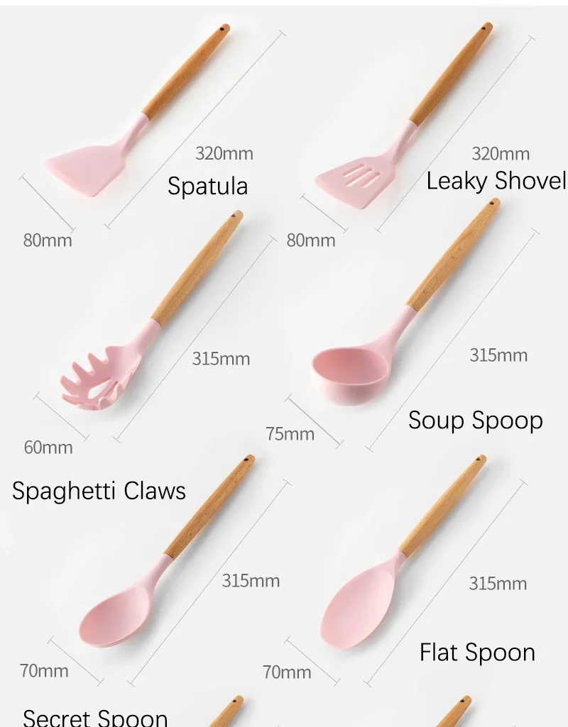Pink Cooking Kitchenware Tool Silicone Utensils With Wooden Multifunction Handle Non-Stick Spatula Ladle Egg Beaters Shovel