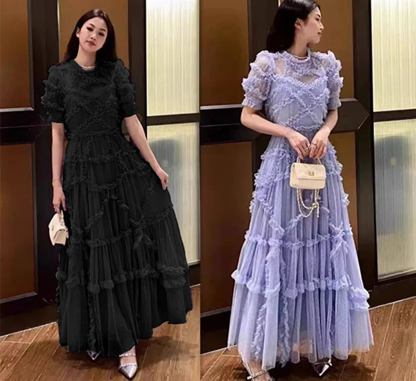 Quality Vintage Layers Ruffle Cake tulle Long Dress Women Blue Dots Elegant Party Evening Vestidos