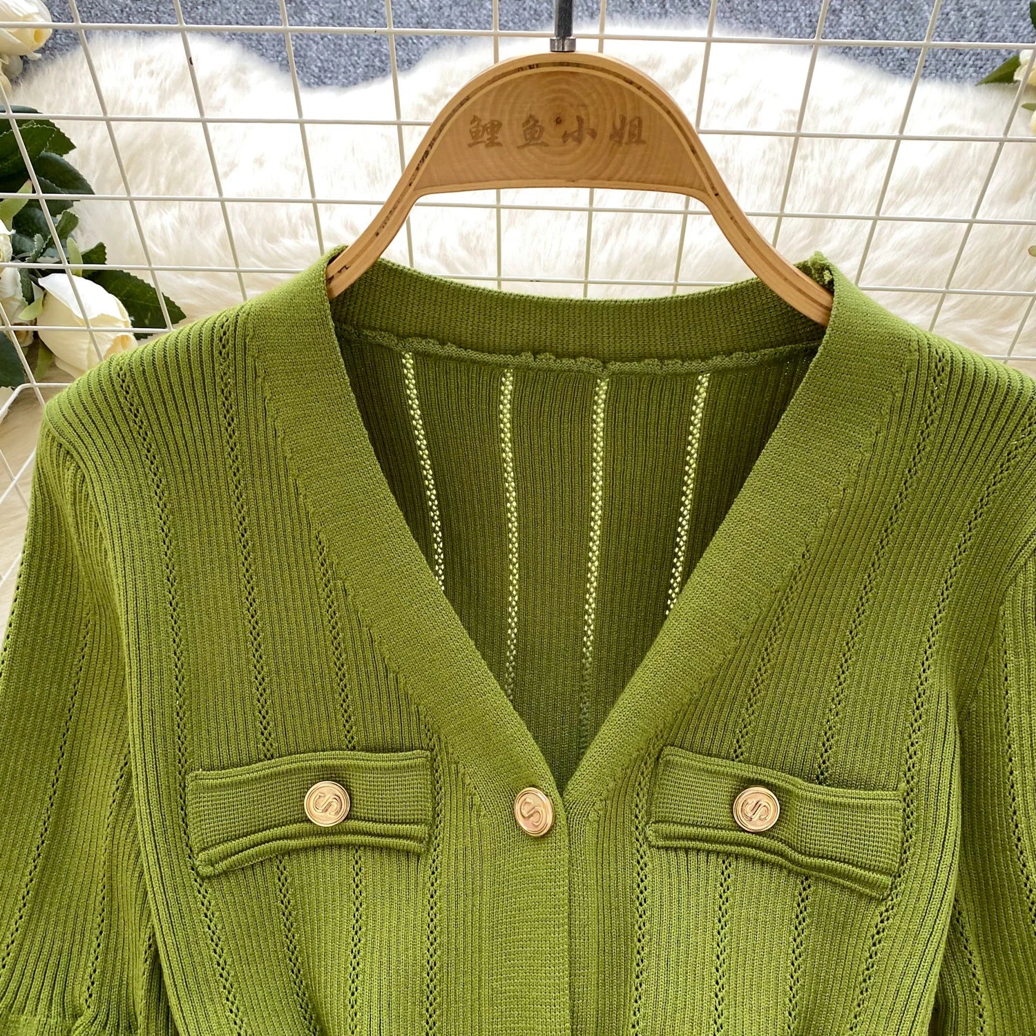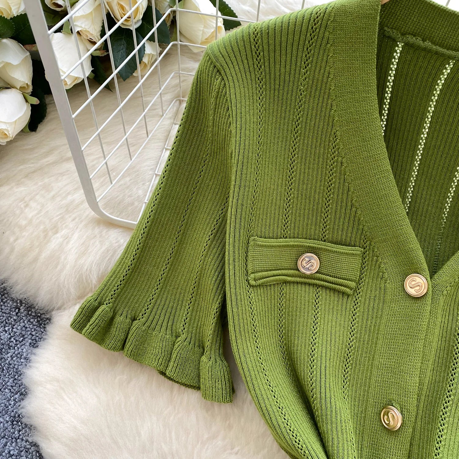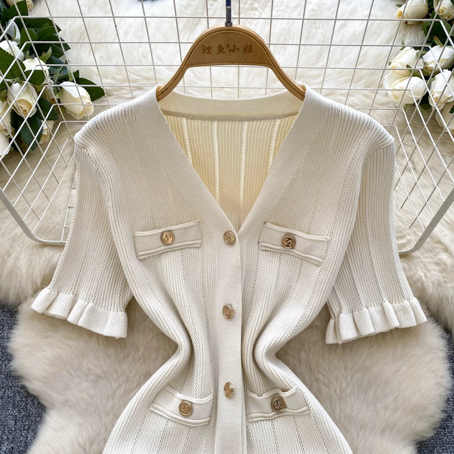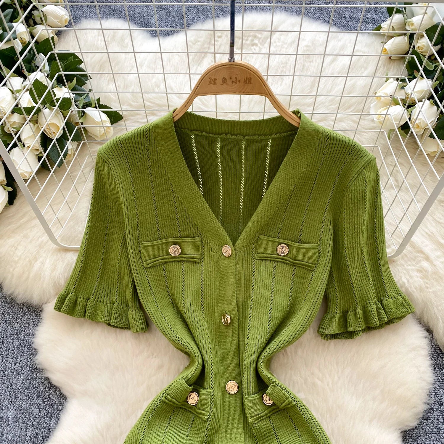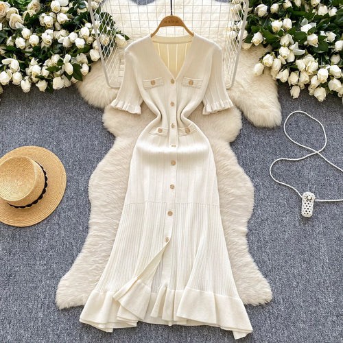 Vintage Single Breasted Women's Knitted Long Dress High Waist Short Sleeve Ruffles Straight Dress