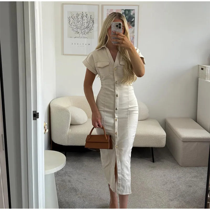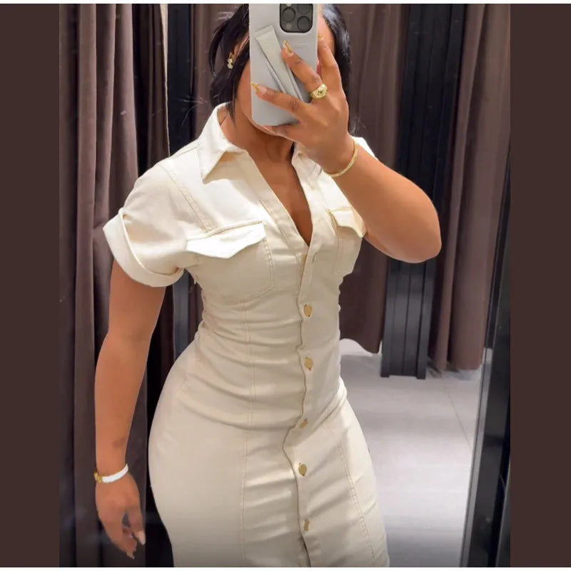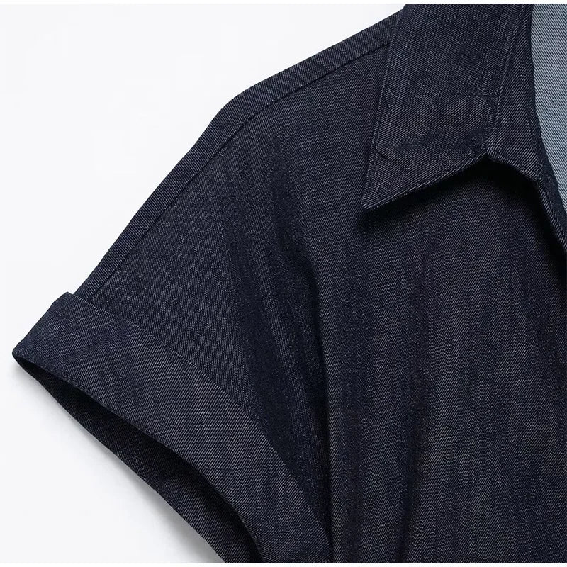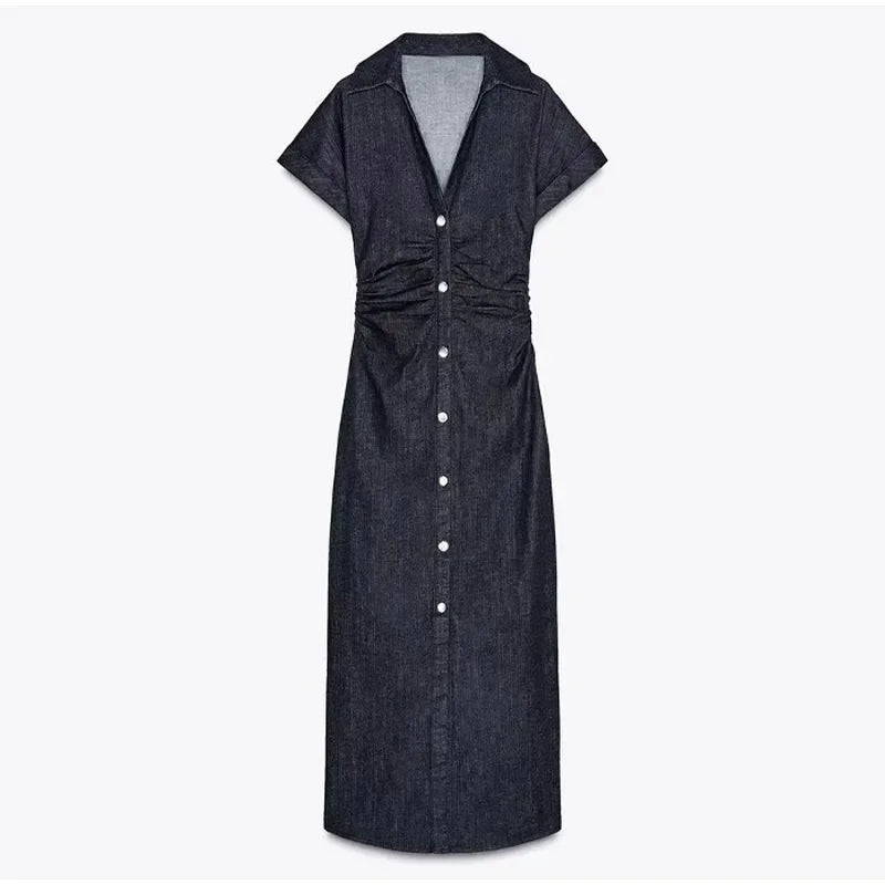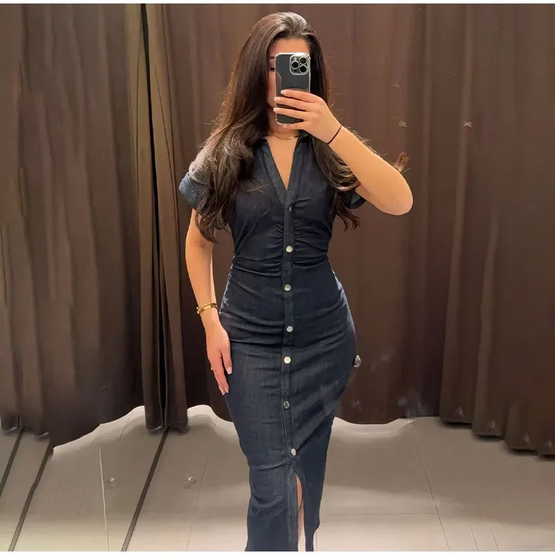 V-neck Denim Dress Fashion Slim Long Dress Chic Short Sleeves Single Button High.