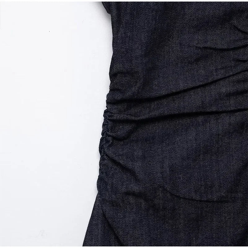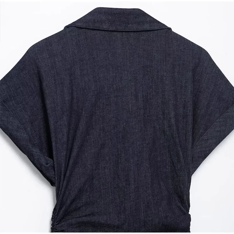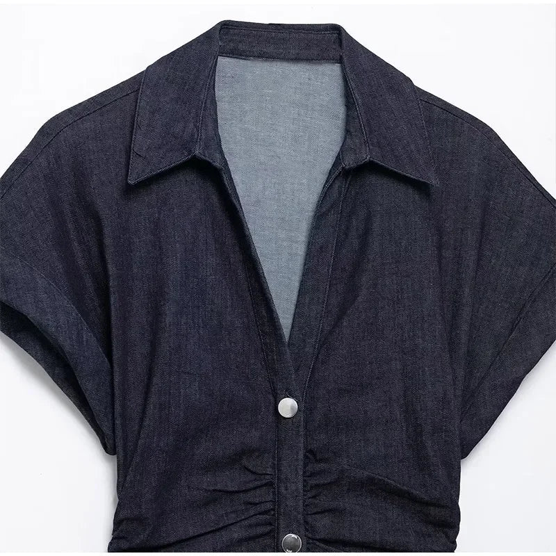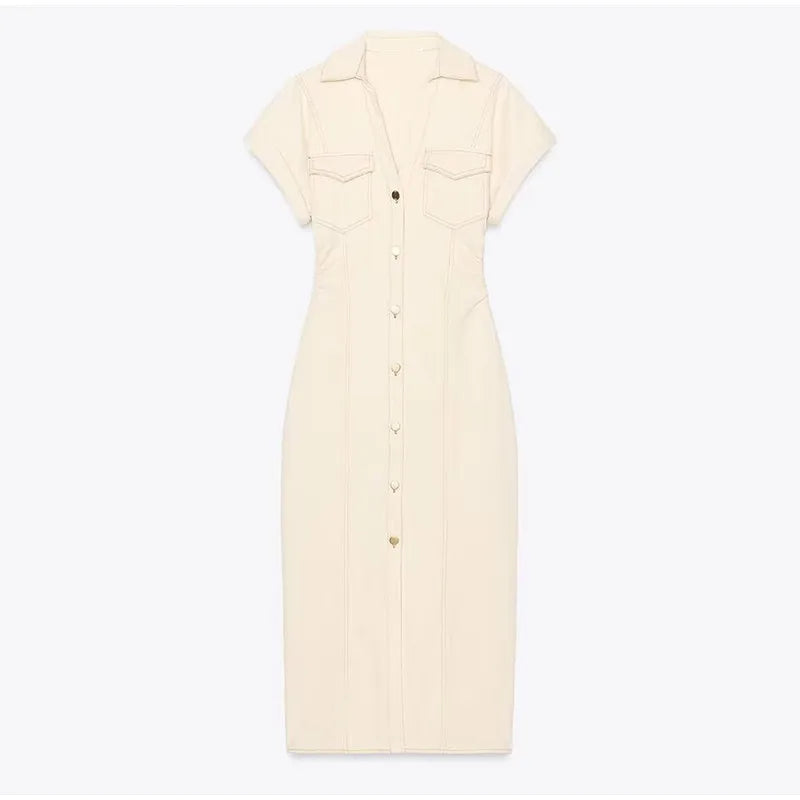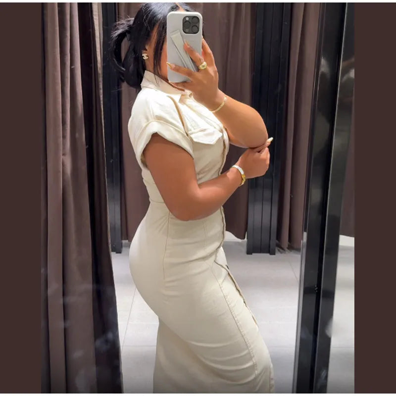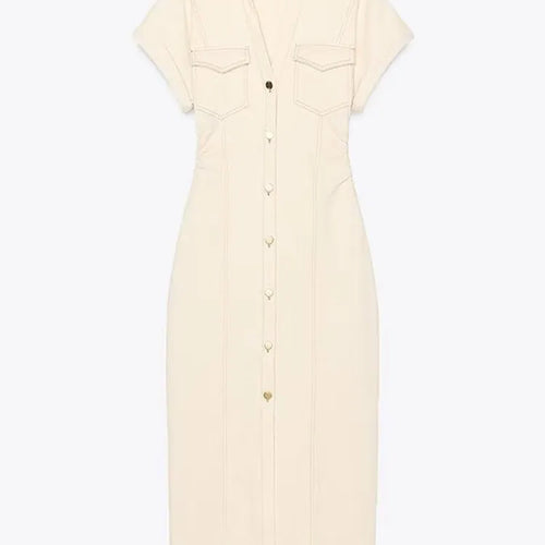 V-neck Denim Dress Fashion Slim Long Dress Chic Short Sleeves Single Button High.