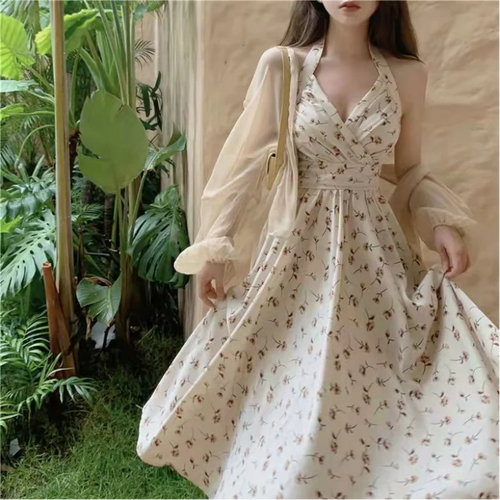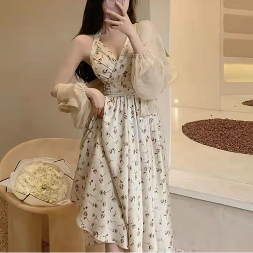 New Gentle Wind Fragmented Flower V-Neck Sling Dress Set Waist Wrap Neck Hanging Long Dress Thin Protection Cardigan