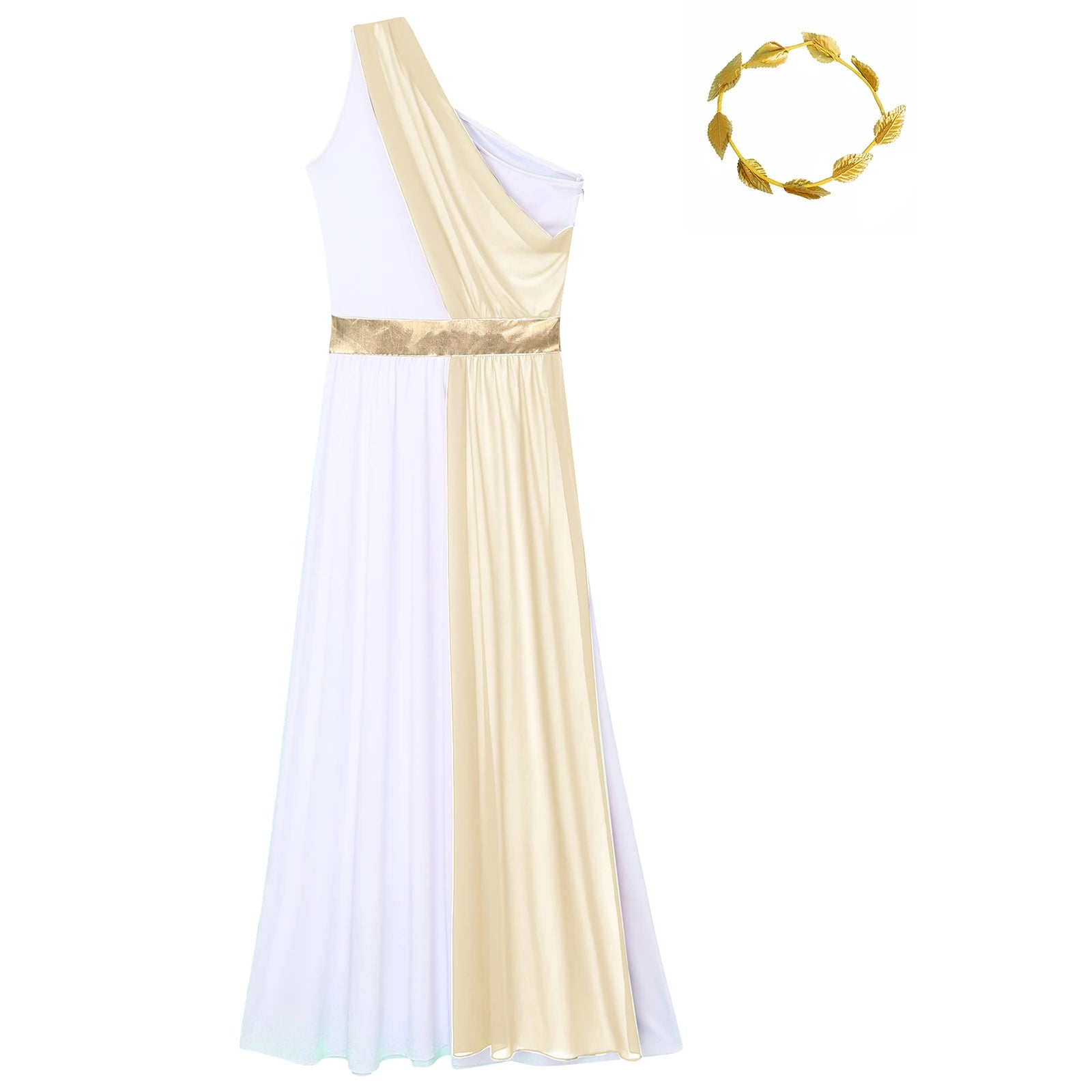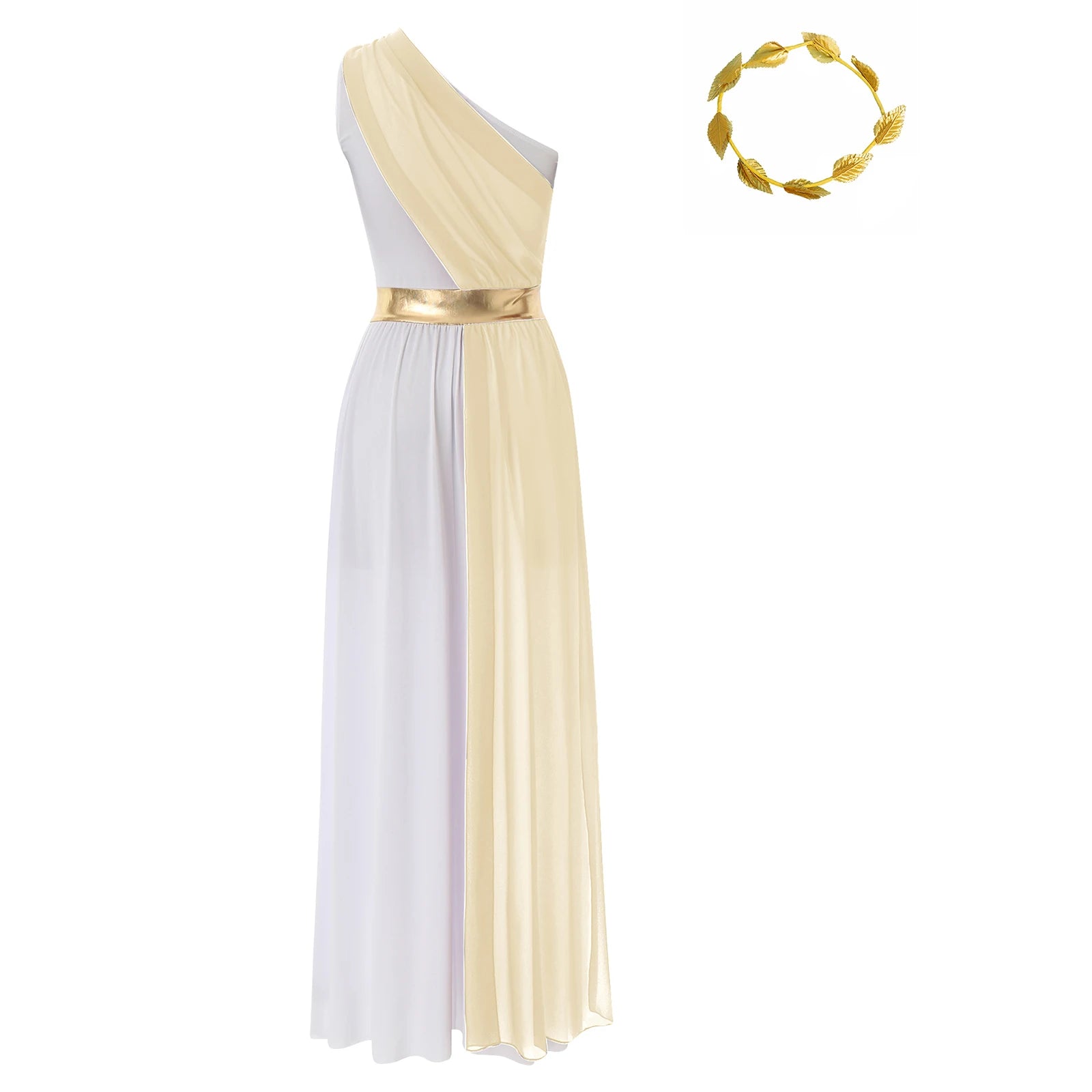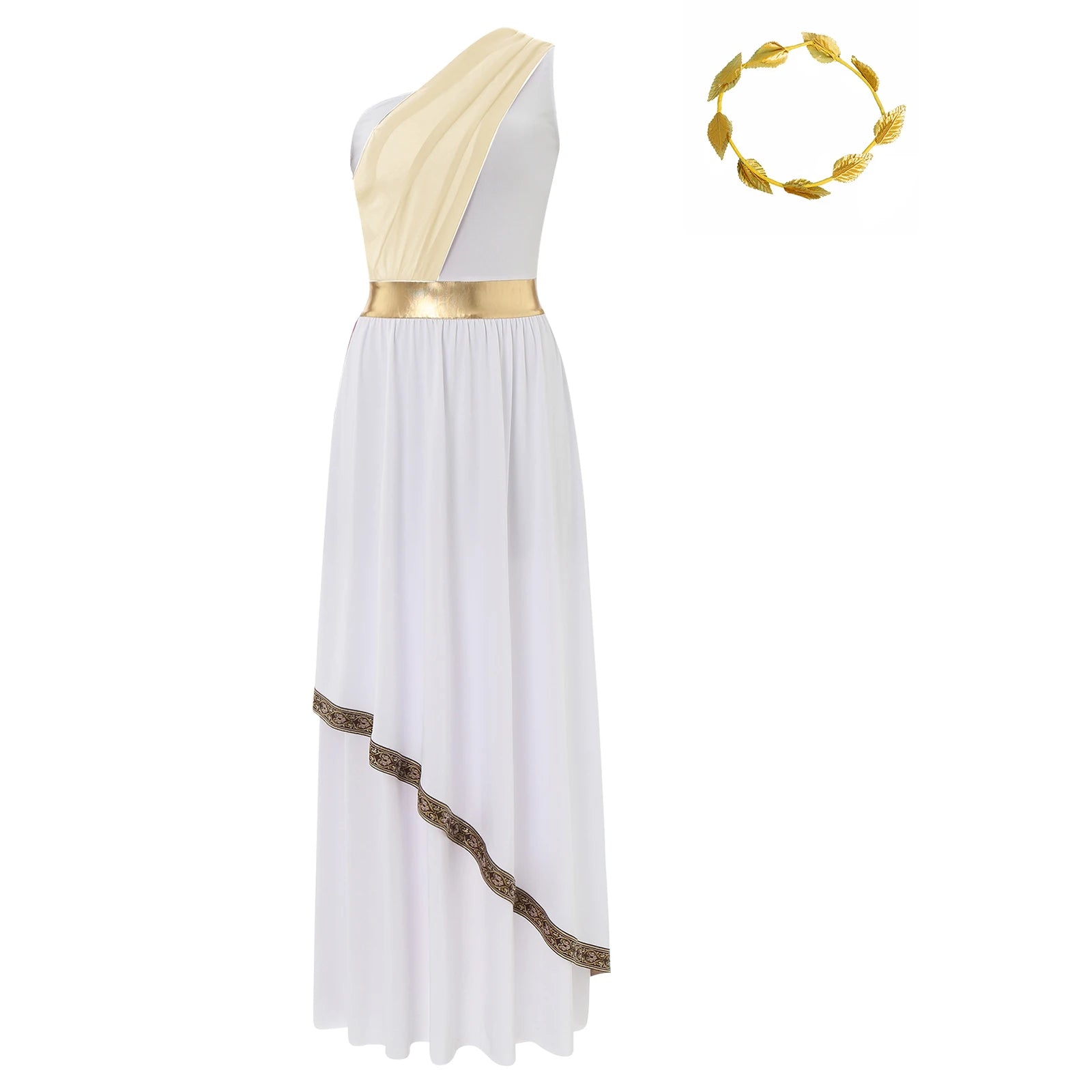 Women Halloween Ancient Greek Dress Ancient Greek Toga Costumes Robe One Shoulder Chiffon Overlay Tunic Dress with Headwear