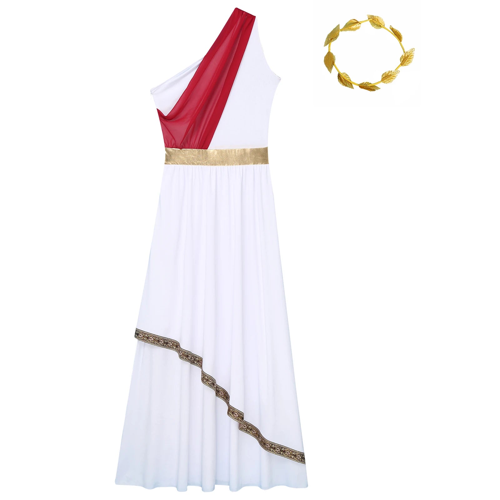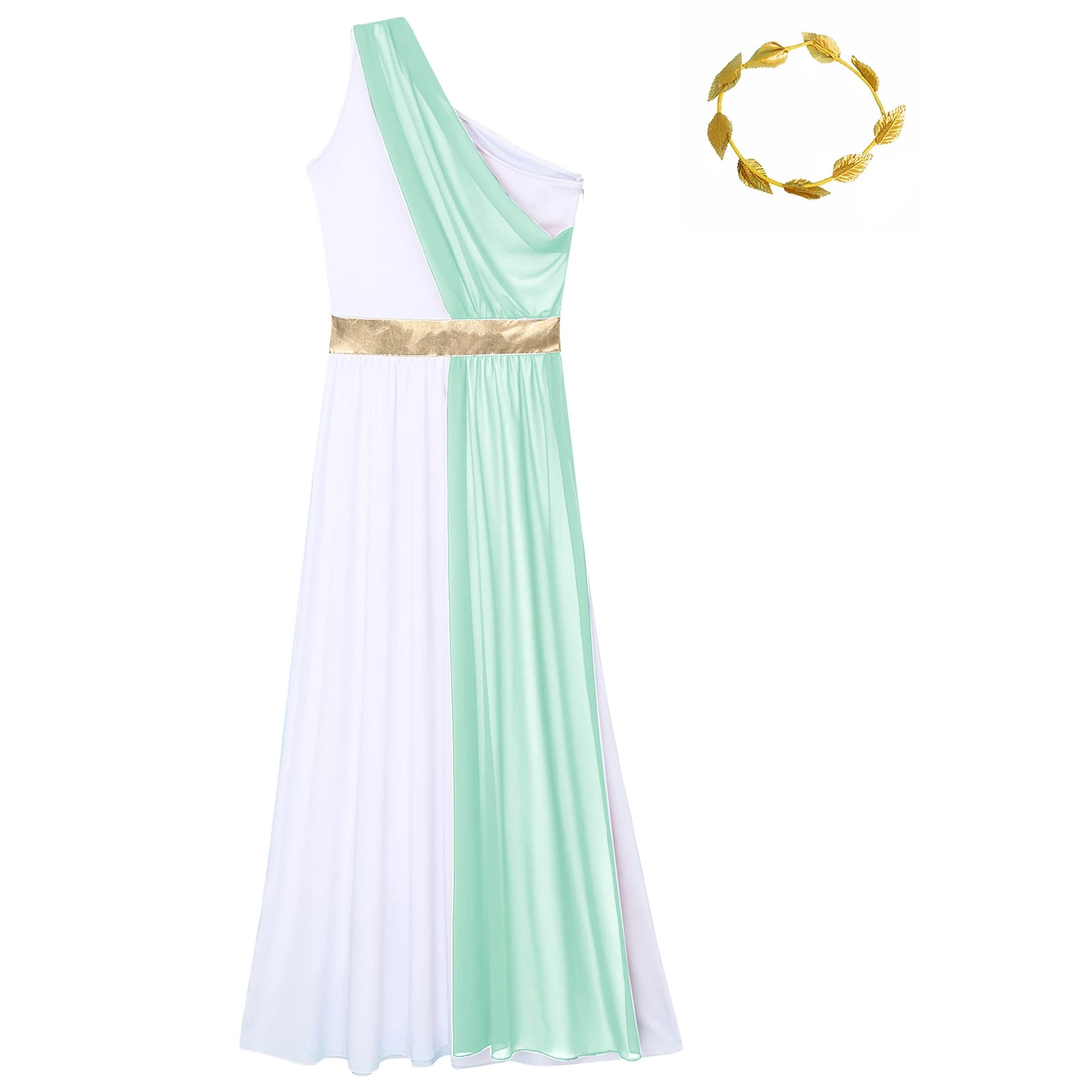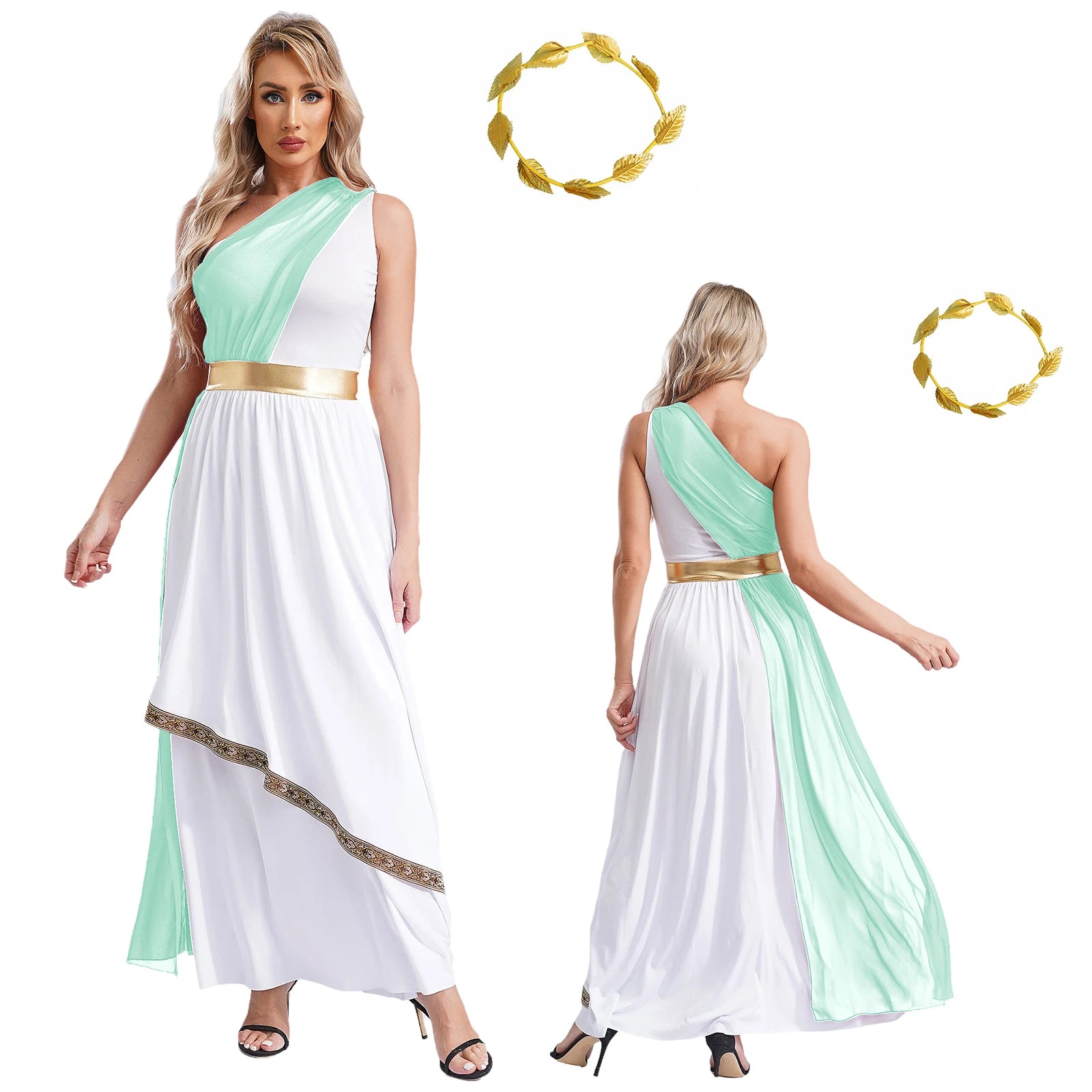 Women Halloween Ancient Greek Dress Ancient Greek Toga Costumes Robe One Shoulder Chiffon Overlay Tunic Dress with Headwear
