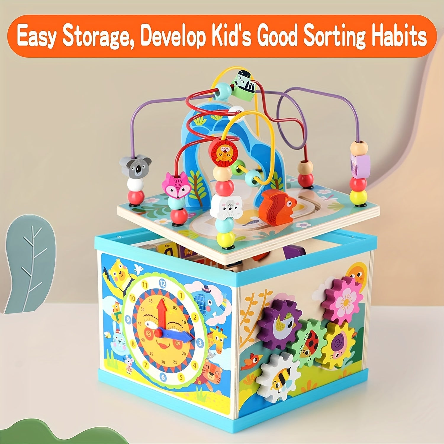 Wooden Activity Cube, 5-in-1 Toys For 1+ Year Old Boys & Girls, Educational Learning Toys For Toddlers Age 1-2, Multipurpose ABC-123 Abacus Bead Maze Shape Sorter